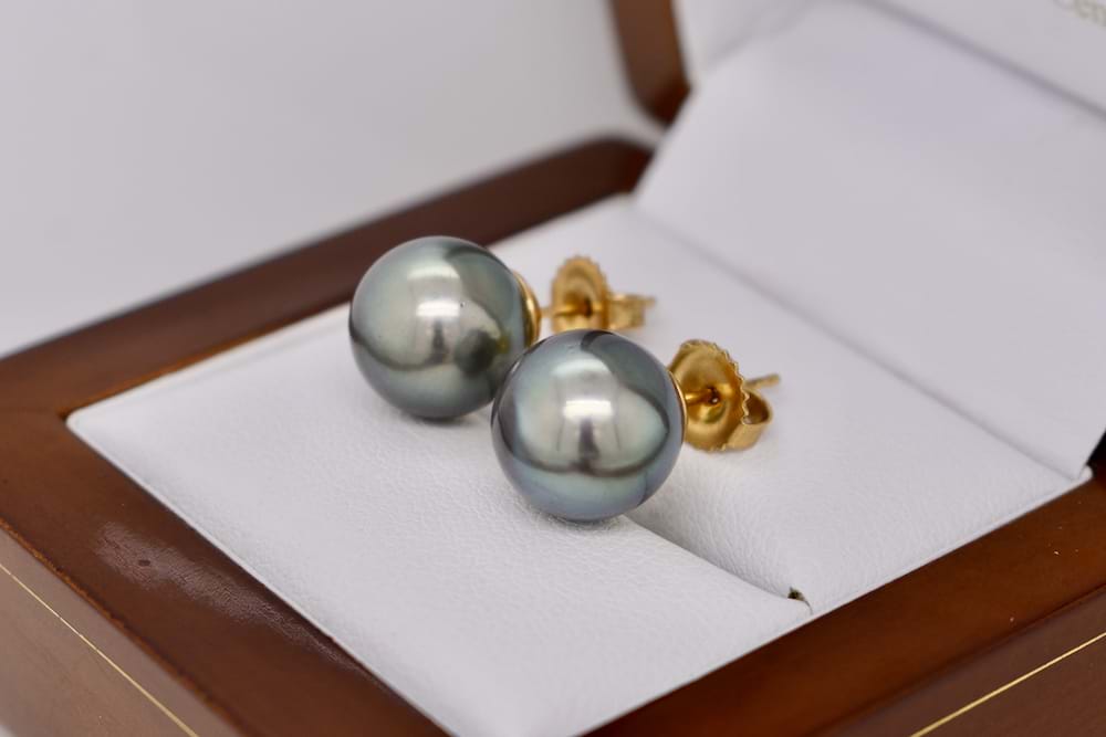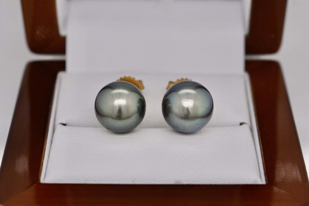 A lustrous pear of semi-round Tahitian pearls measuring 11-11.5mm set onto high quality 18ct yellow gold stud post and butterfly fittings