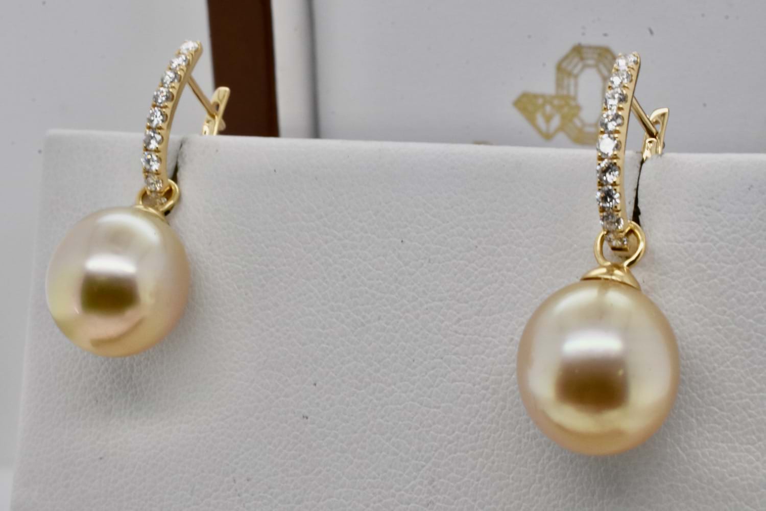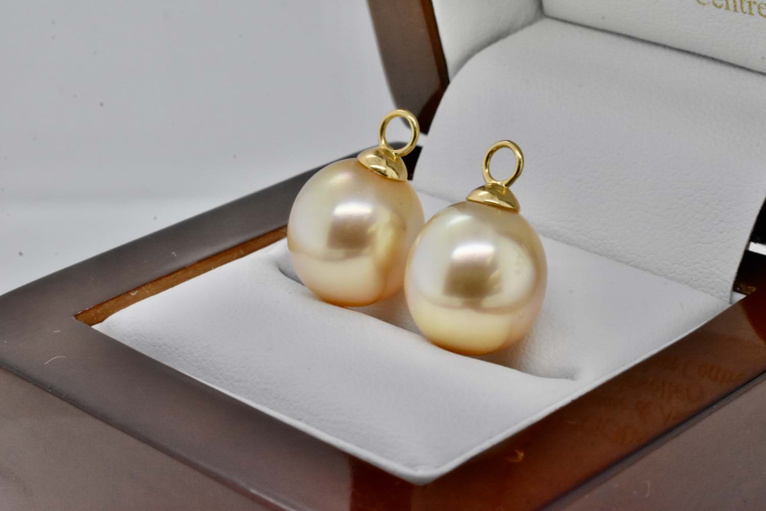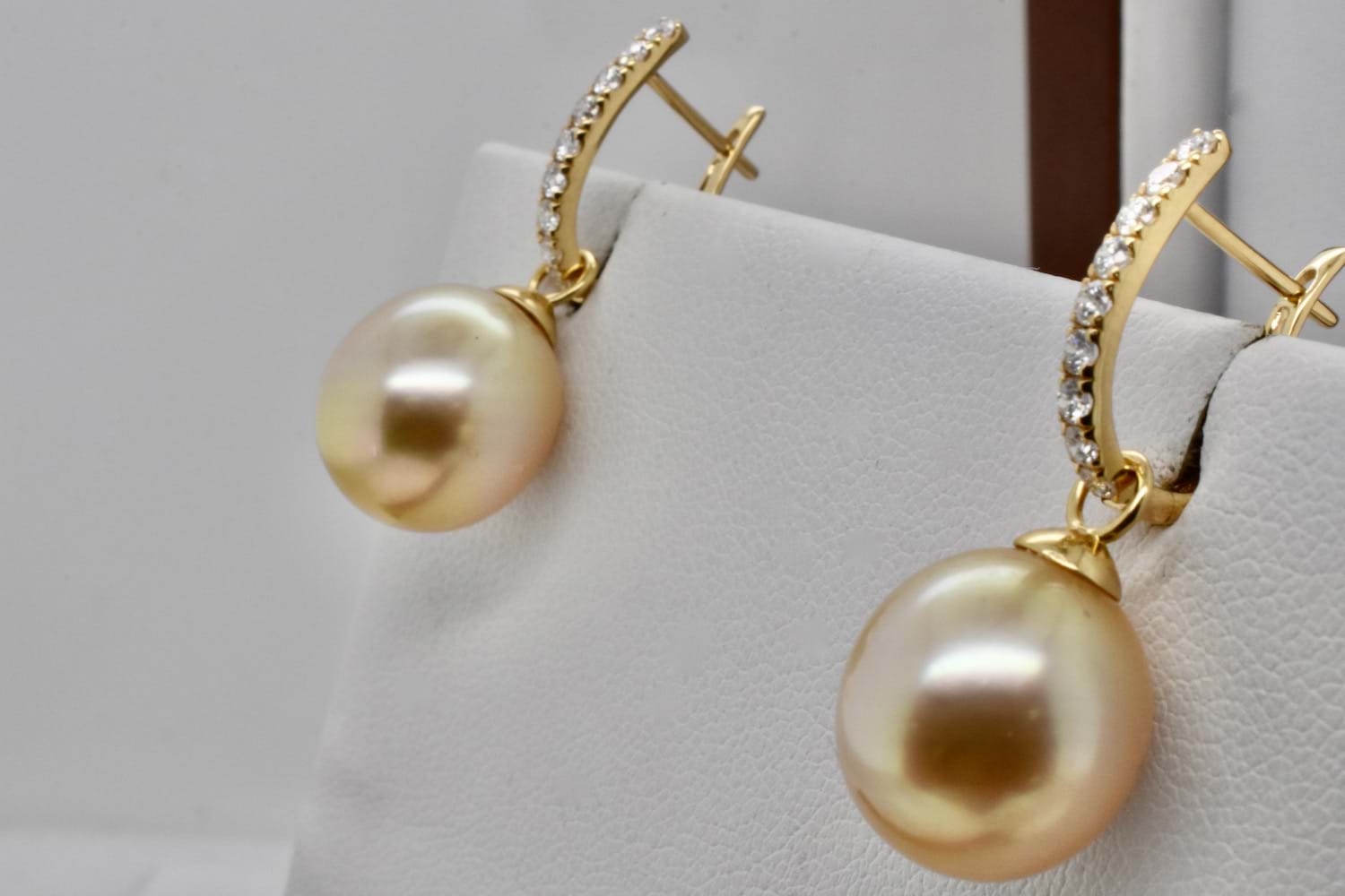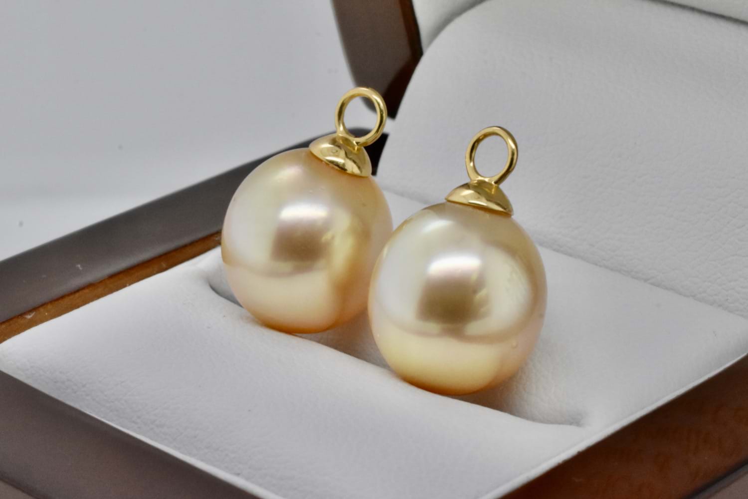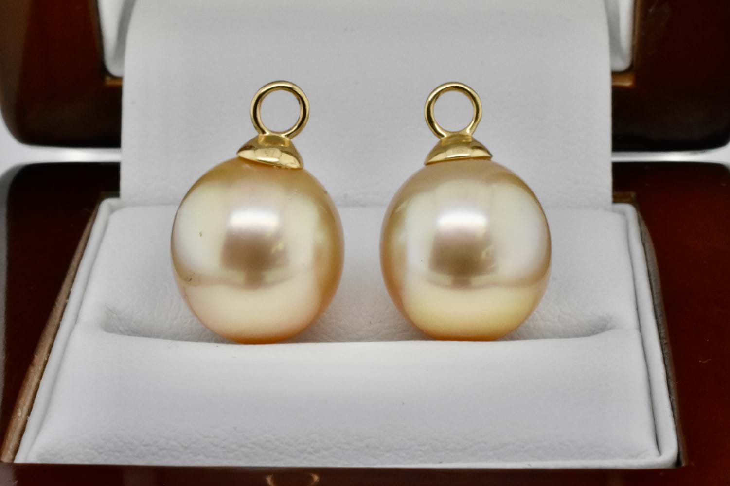 A classic and elegant pair of oval 12.1-12.2mm golden south sea pearls with 18ct yellow gold cap and ring fittings perfect to suspend from diamond huggies. Pearls independently graded as: oval light-mid gold hue with good lustre, clean- very lightly blemished. Independent Valuation Supplied.