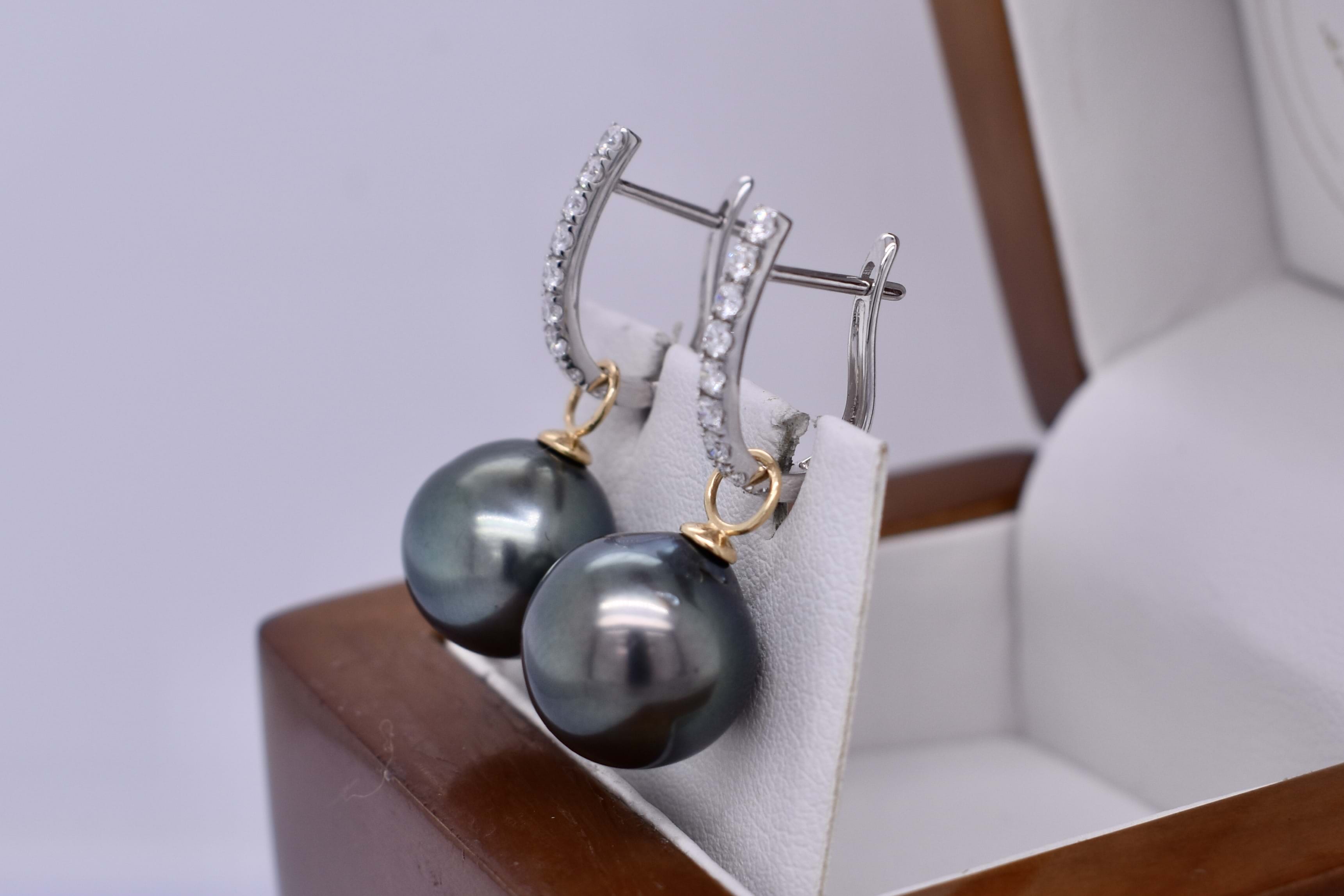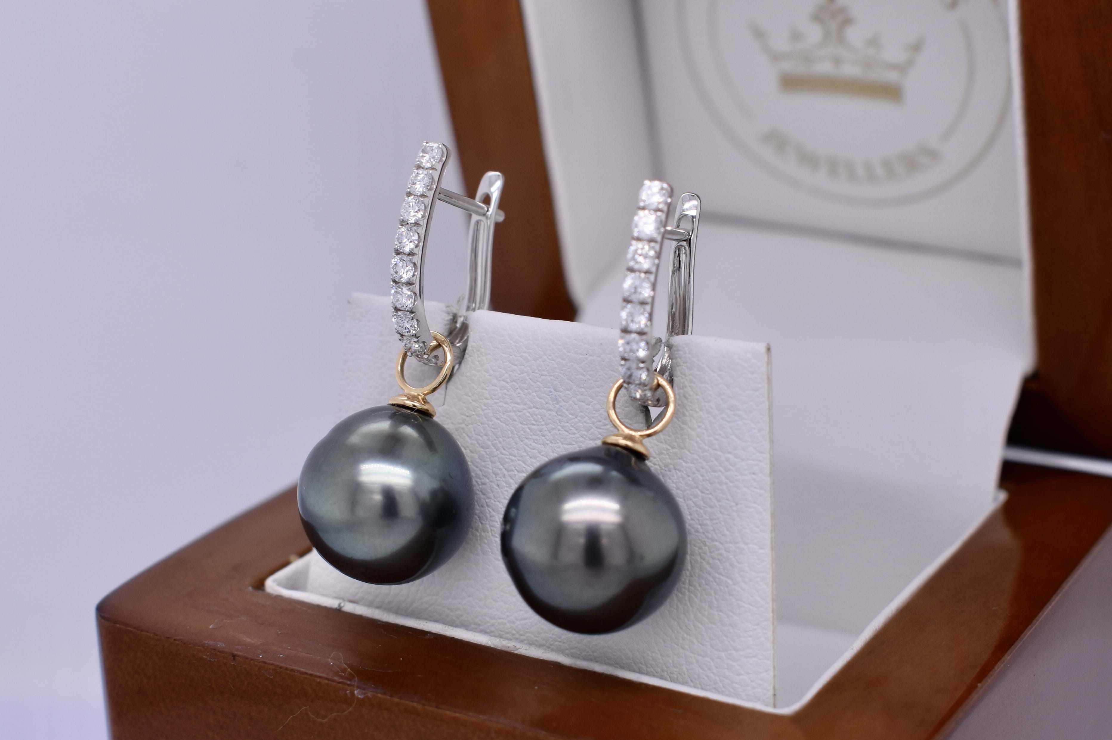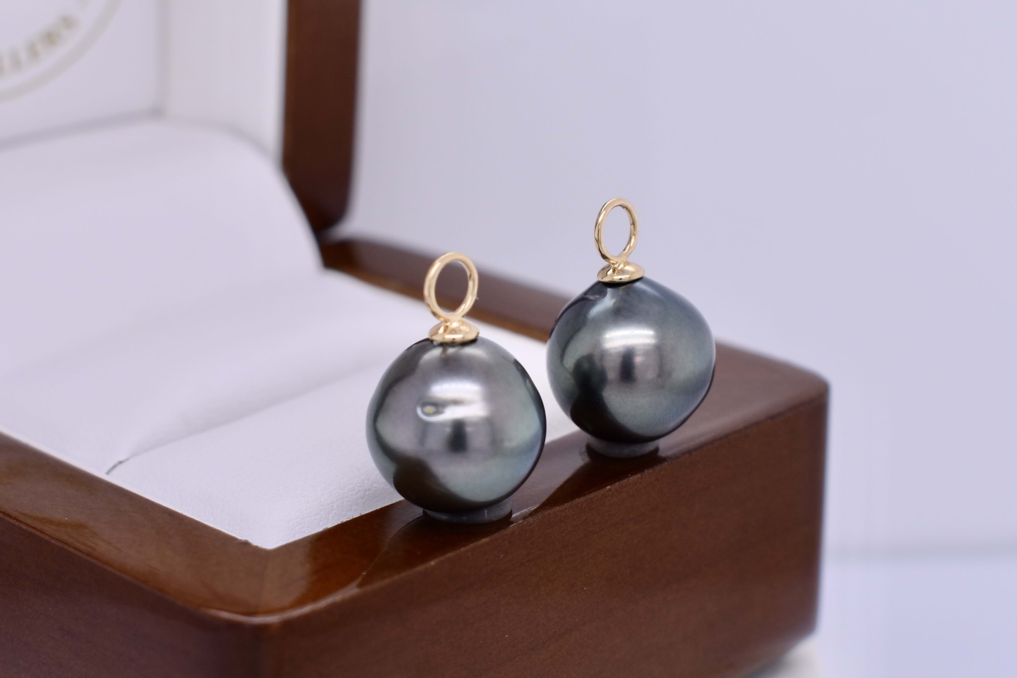 A versatile and elegant pair of 12.17-12.13mm Tahitian pearls, with 18ct yellow gold cap and ring fittings perfect to suspend from diamond huggies. Pearls independently graded as: off round, good lustre, dark greenish black, moderately included. Signature diamond huggies are available for separate purchase. Independent Valuation Supplied.