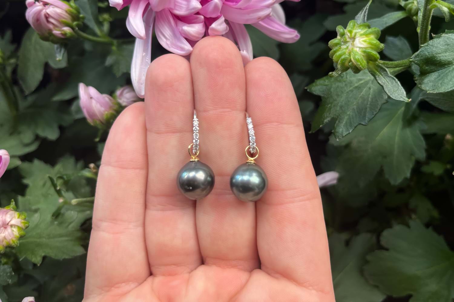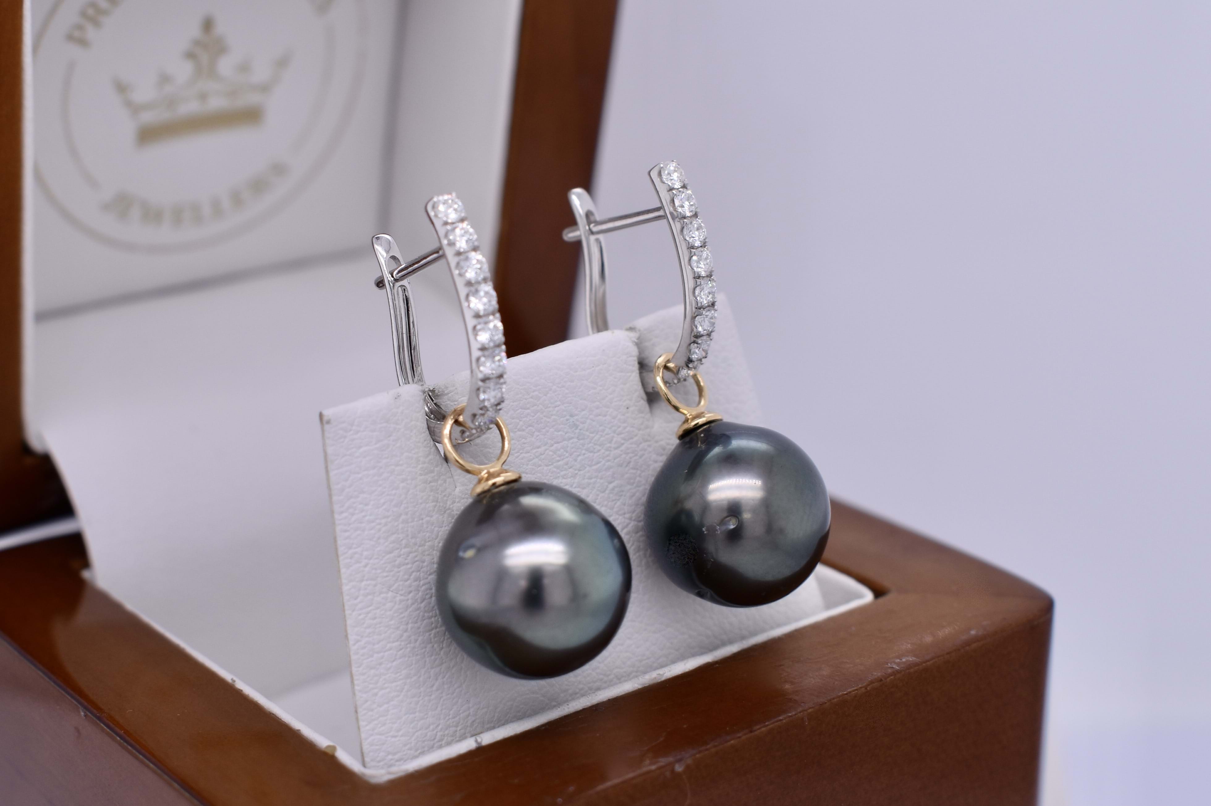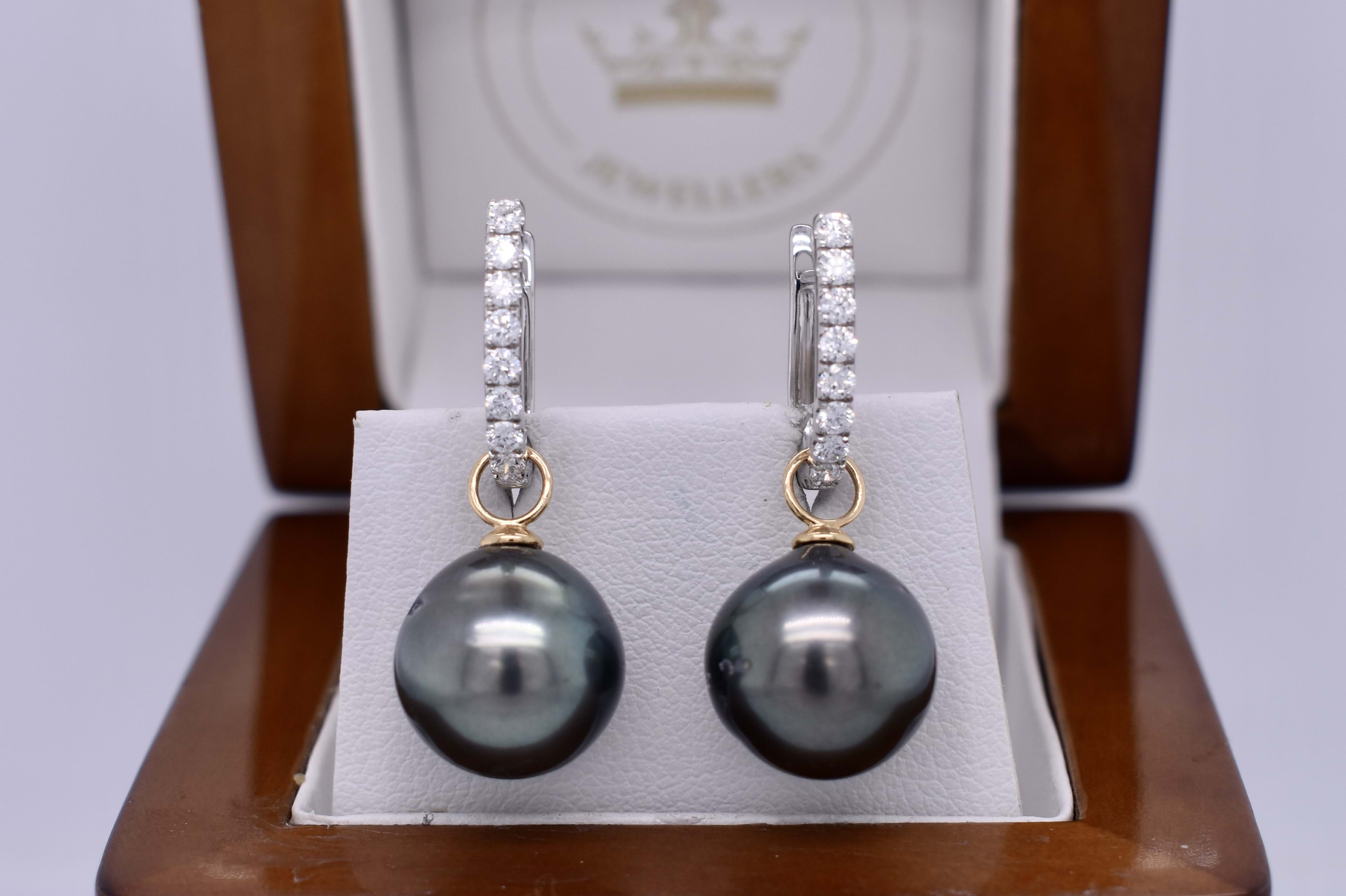 A versatile and elegant pair of 12.17-12.13mm Tahitian pearls, with 18ct yellow gold cap and ring fittings perfect to suspend from diamond huggies. Pearls independently graded as: off round, good lustre, dark greenish black, moderately included. Signature diamond huggies are available for separate purchase. Independent Valuation Supplied.