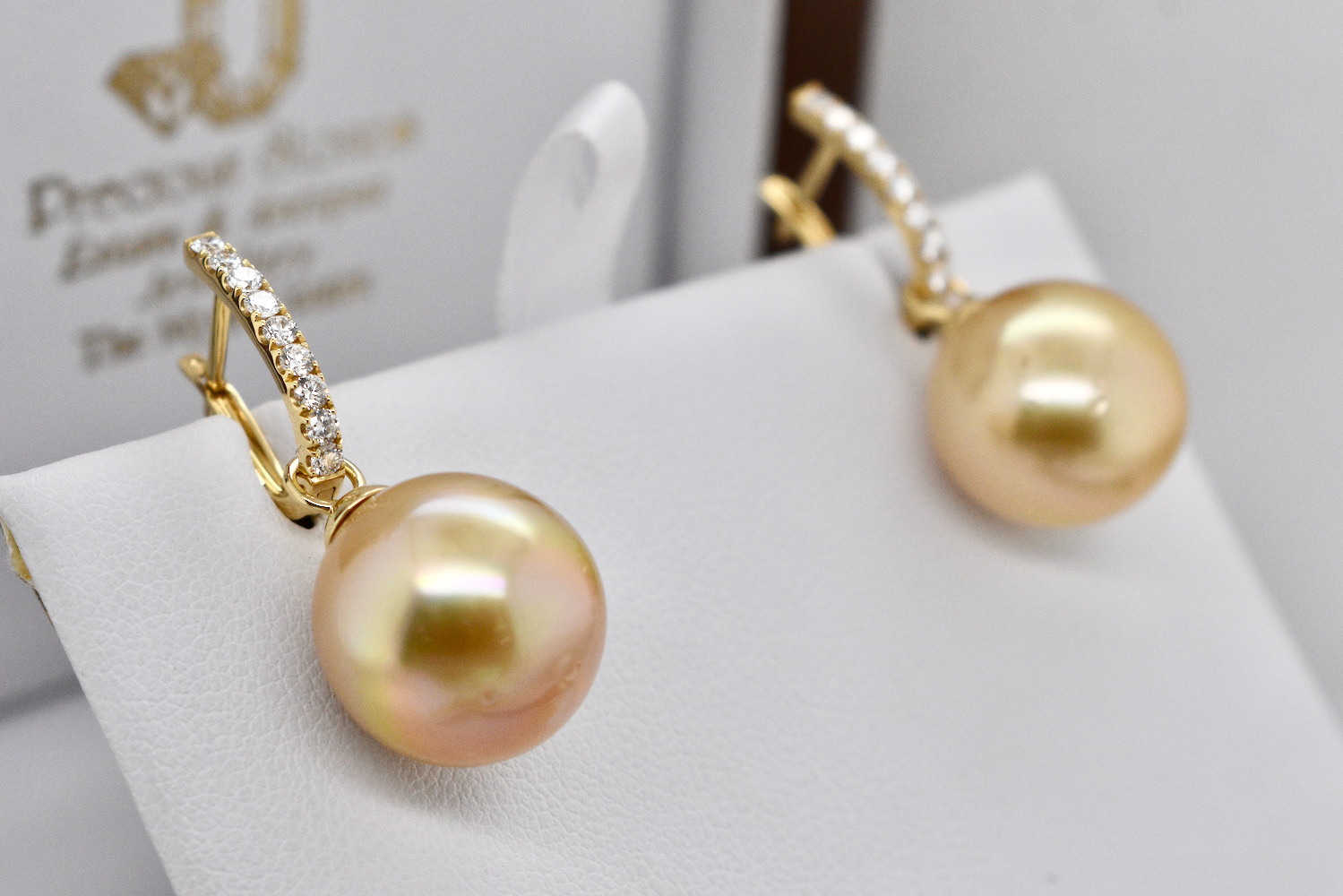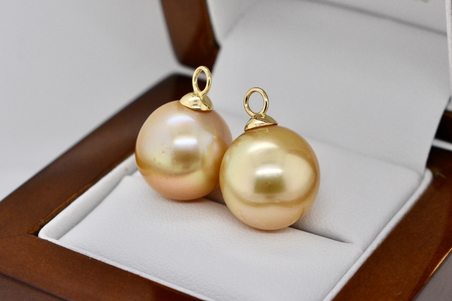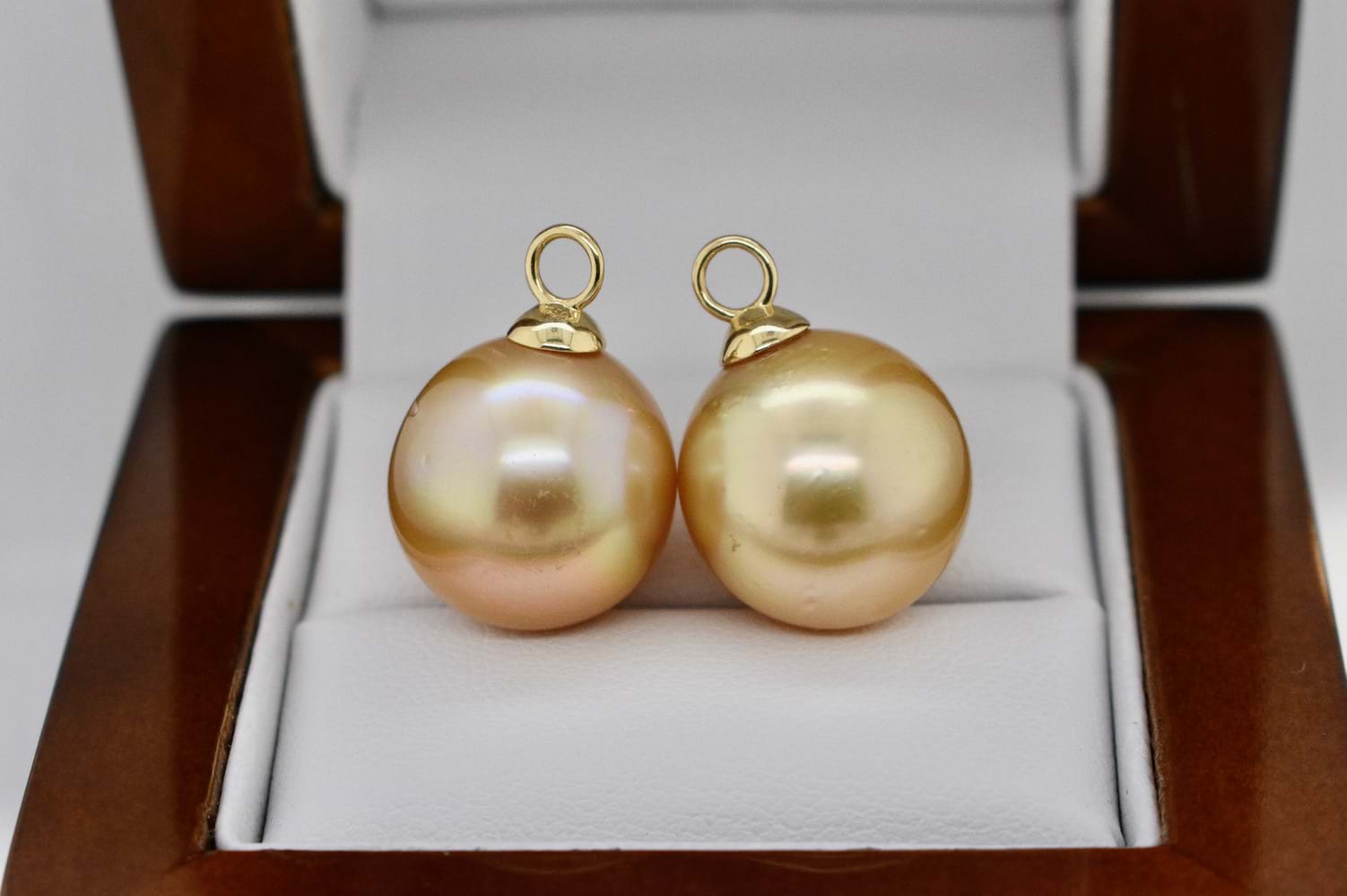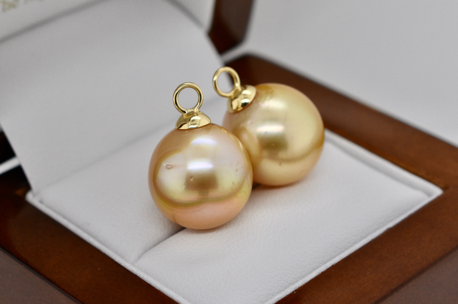 A spectacular pair of large near round 14mm Golden South Sea pearls with 18ct yellow gold cap and ring fittings perfect to suspend from diamond huggies. Pearls independently graded as: near round medium golden hue with good lustre, lightly blemished. Independent Valuation Supplied.