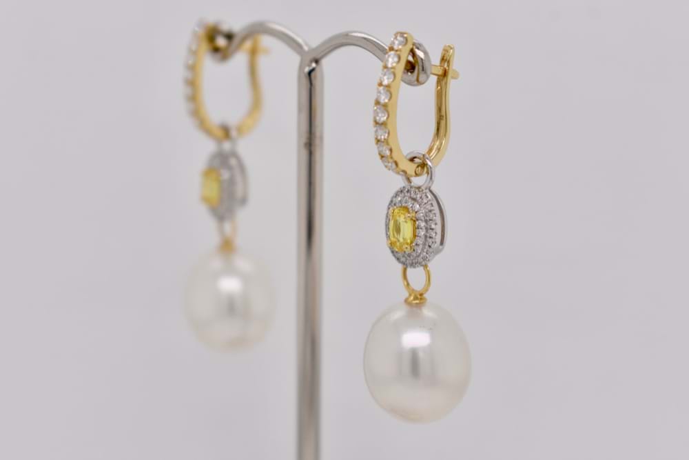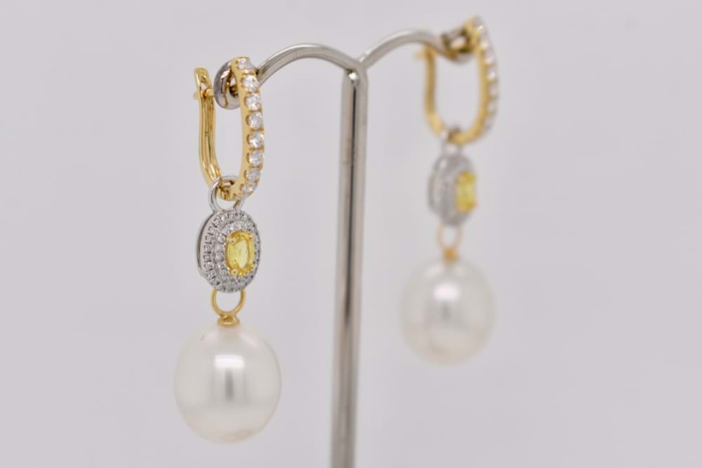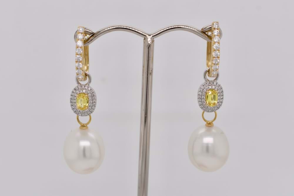 18ct yellow gold enhancer drop earrings with pink/white South Sea Pearls measuring 11.7-11.8mm, pictured here with Diamond huggies and Sapphire earring enhancers which are both available for purchase separately. Independent valuation supplied