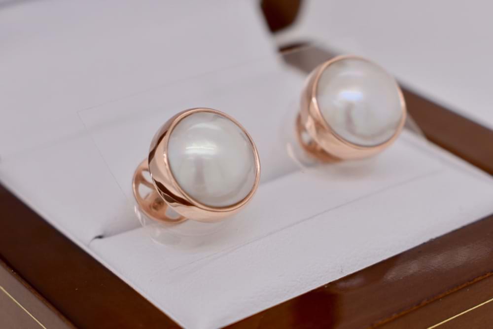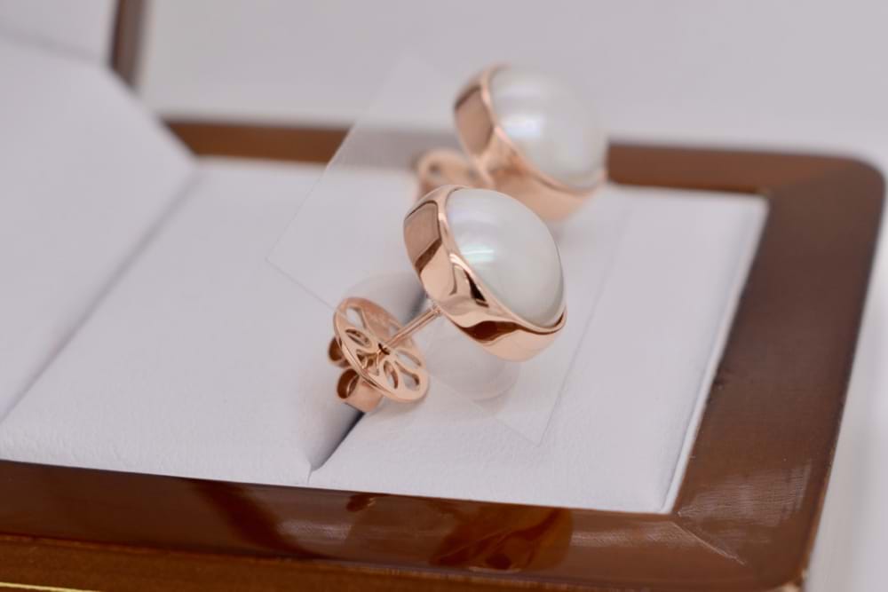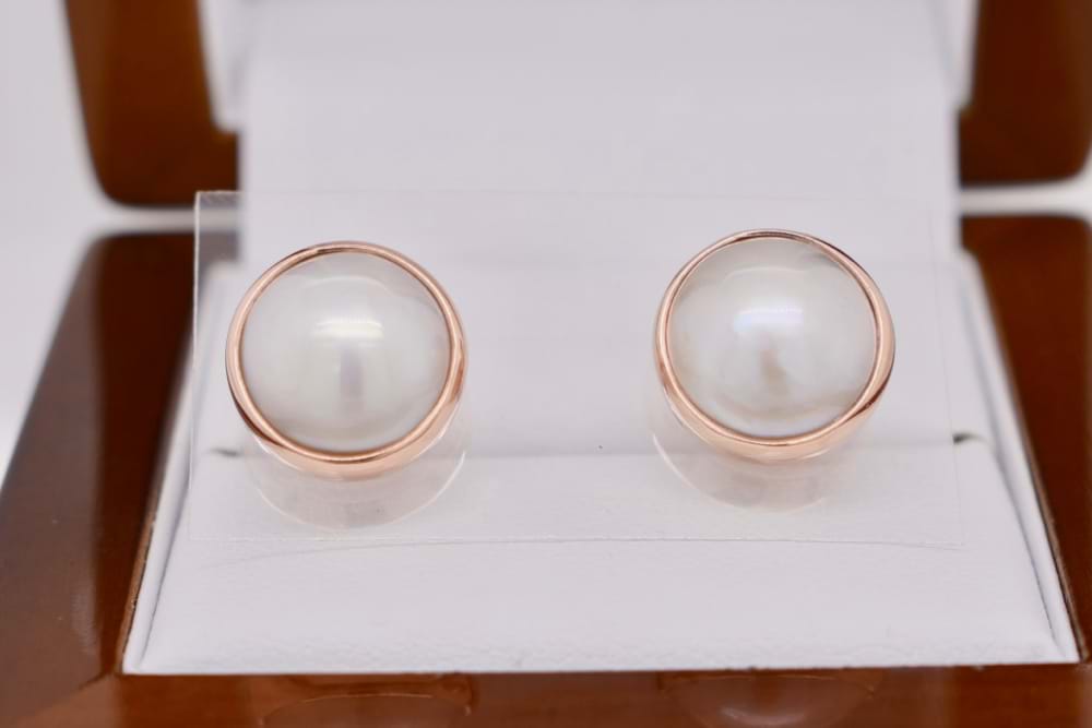 A lustrous pair of 12mm round white mabe pearls set into a handmade 9ct rose gold bezel setting with stud and butterfly fittings
