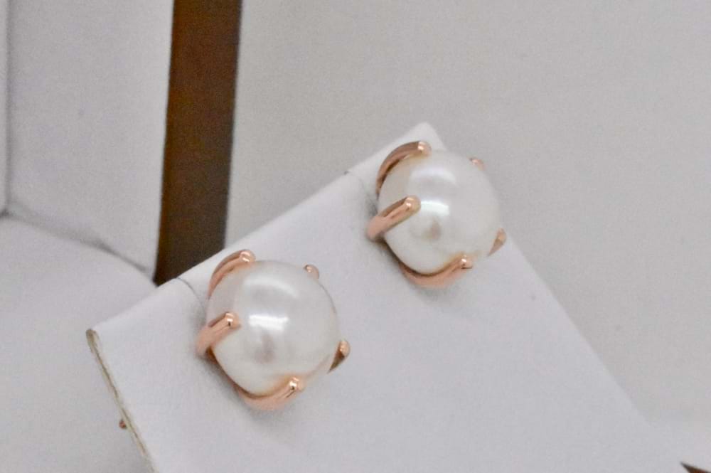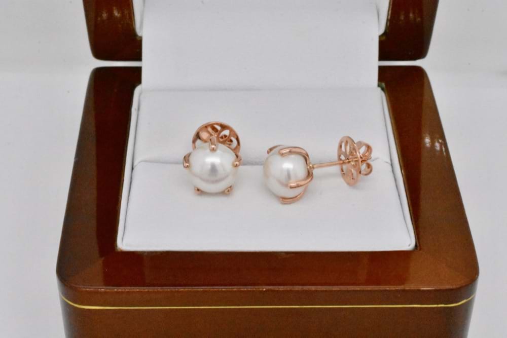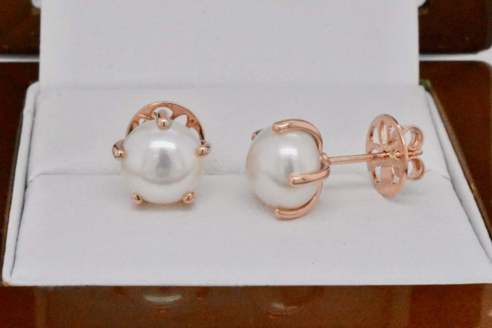 Striking pair of 8-8.5mm freshwater pearls set into handmade 9ct rose gold claws with stud post and butterfly fittings