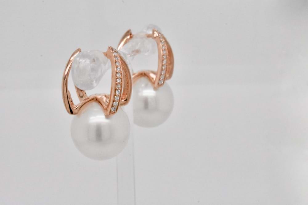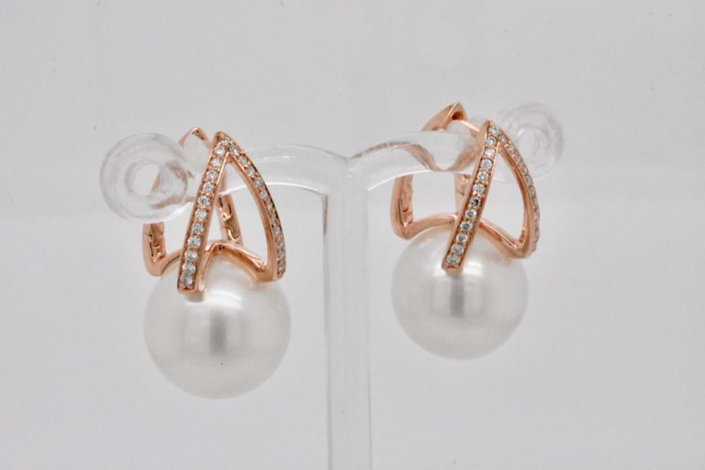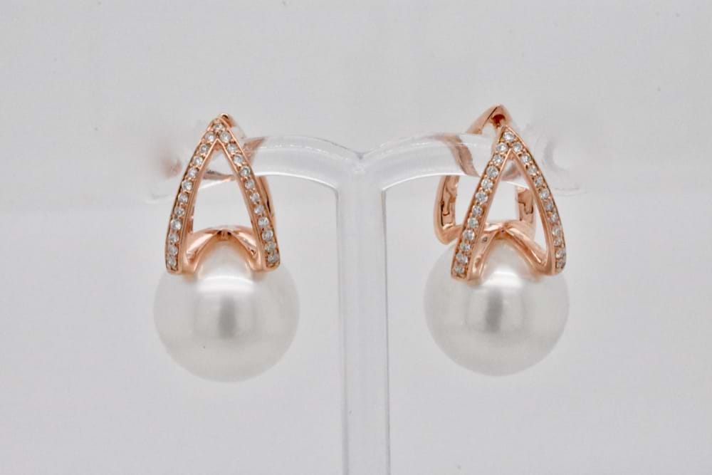 With a split V design huggie set with shimmering white diamonds in 9ct rose gold, these stunning earrings feature lustrous 12.5-13mm white south sea pearls set snuggly at the base of the V. A total diamond content of 0.20cts. Independent Valuation Supplied