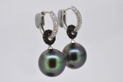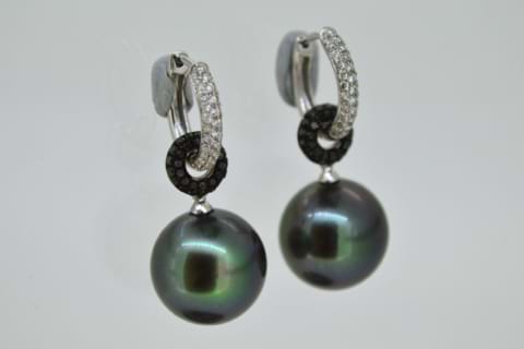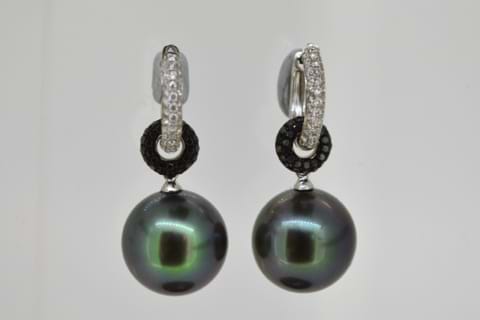 These unusual and striking diamond encrusted earrings feature two Tahitian pearls suspended from black diamond encrusted doughnut caps. With the option to take the pearls on and off the diamond huggies, these earrings are a versatile investment for the future, allowing alternate drops to be added. The pearls measure 13-13.5mm and have a good lustre, and the 130 black and white diamonds total 0.73cts. Independent Valuation Supplied