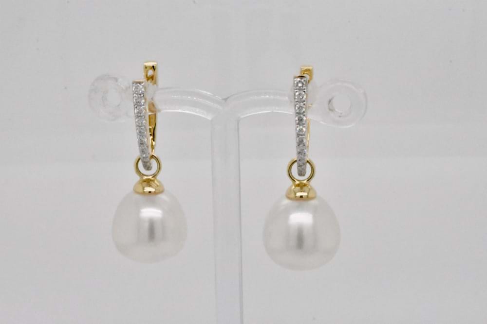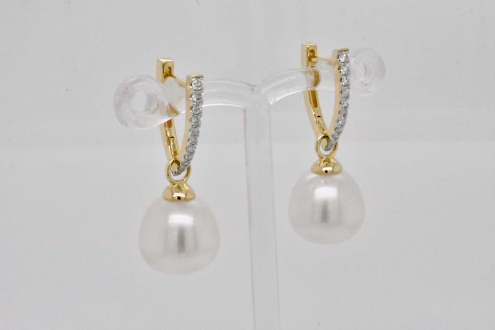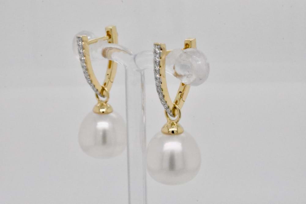 This pair of V-shape diamond set huggies are crafted in 9ct yellow gold and contain a combined total of 0.26cts of shimmering diamonds. Combined with these removable 11-12mm white south sea pearl drop enhancers, this versatile combination earring makes a fantastic day-evening option. Independent Valuation Supplied