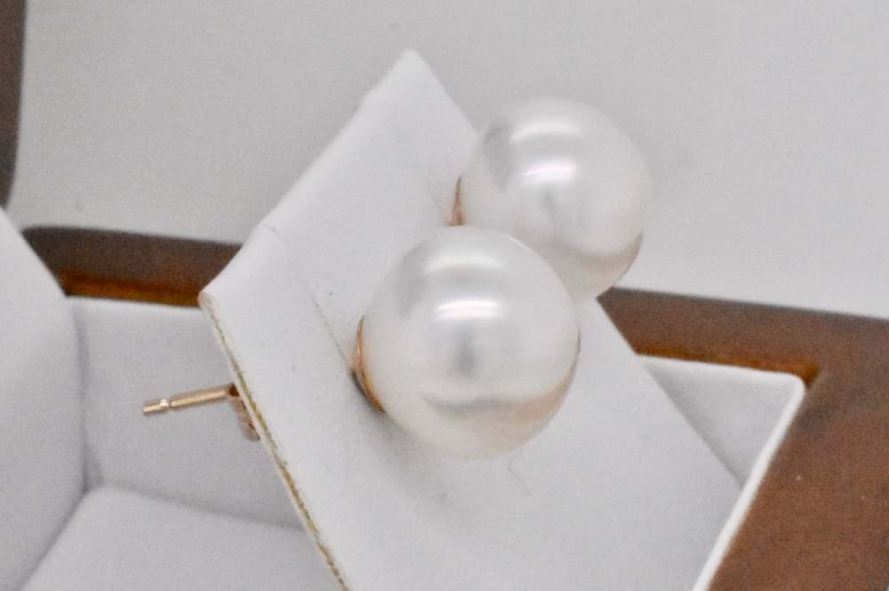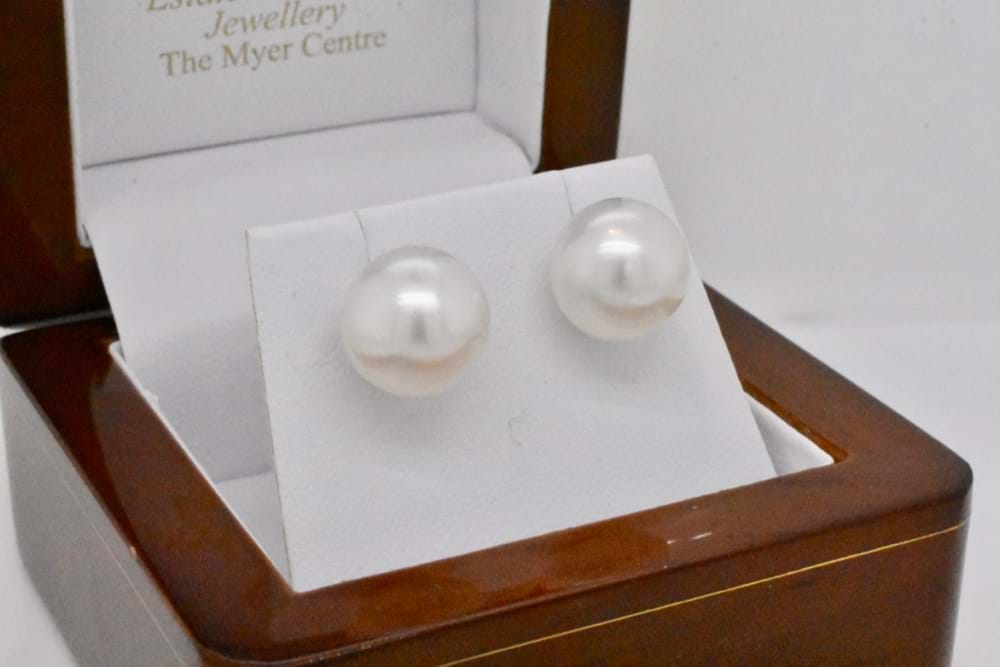 These stunning Australian, white, south sea pearls measure 11-11.5mm but due to their button shape give a much bigger look. Set onto high quality 9ct yellow gold stud posts with butterfly fittings
