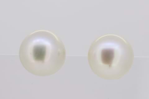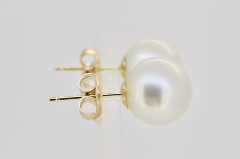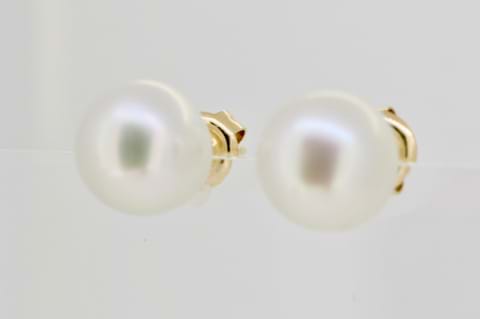 A lustrous pair of Australian white south sea pearls measuring 11-11.5mm set onto 9ct yellow gold stud fittings