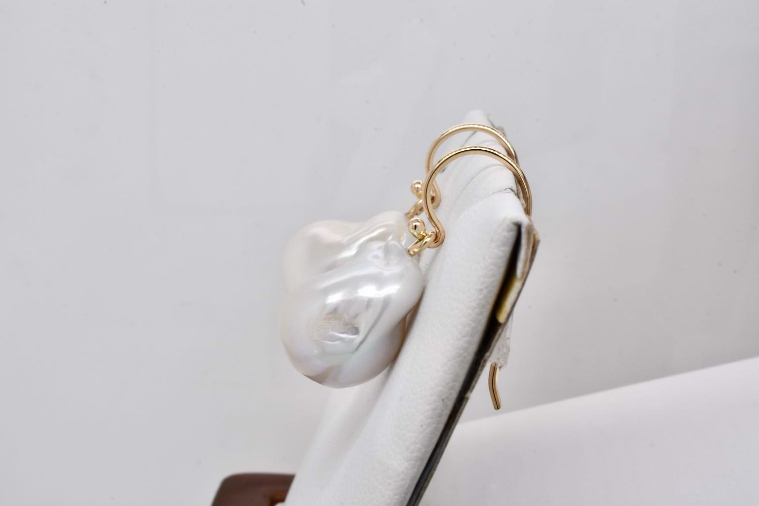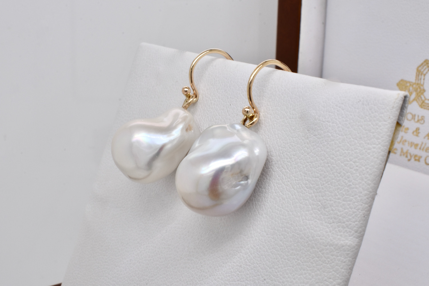 Striking and large freshwater white baroque pearls are the feature of these drop earrings, measuring approximately 13-15mm with a good lustre and suspended from 9ct yellow gold shepherd hooks