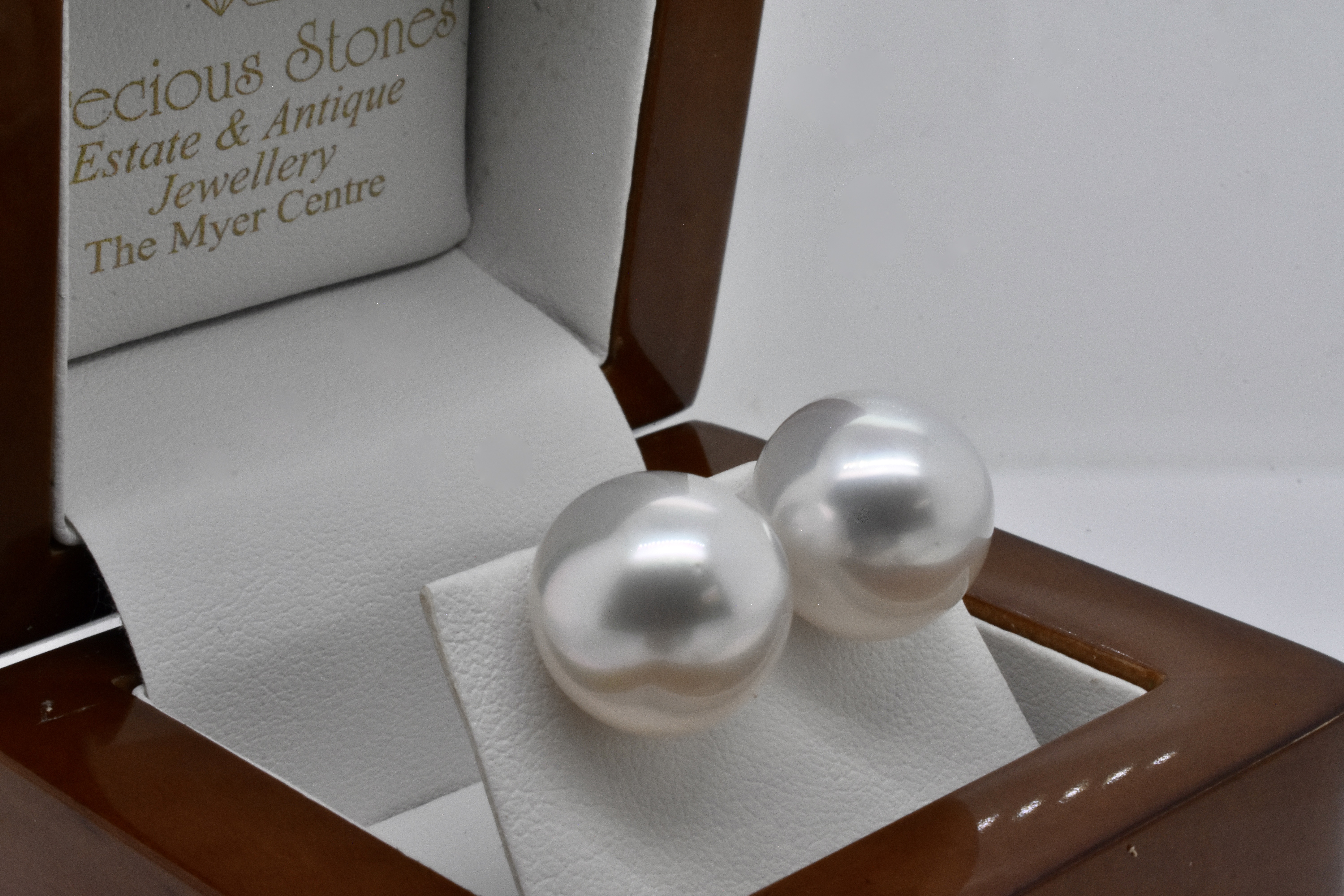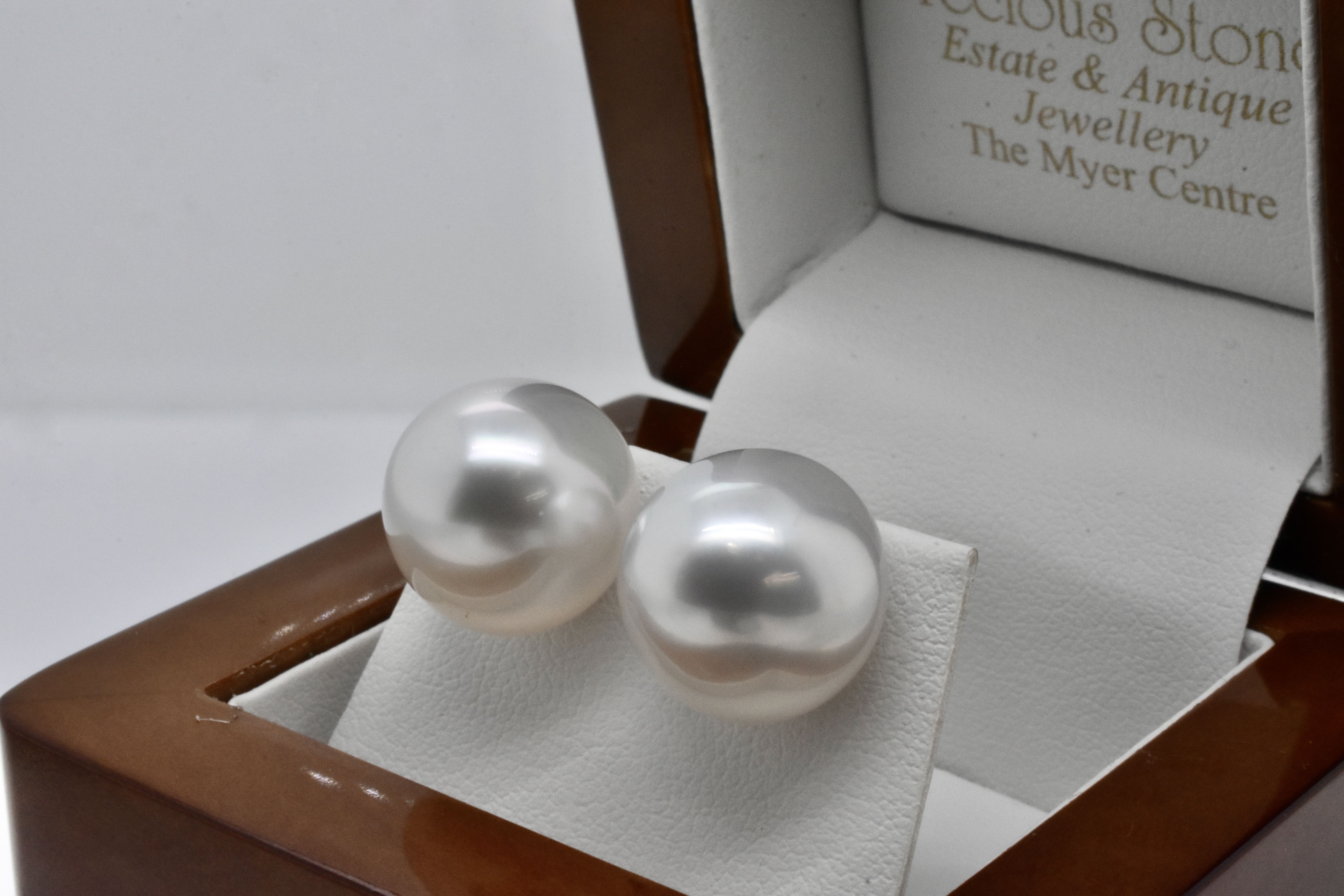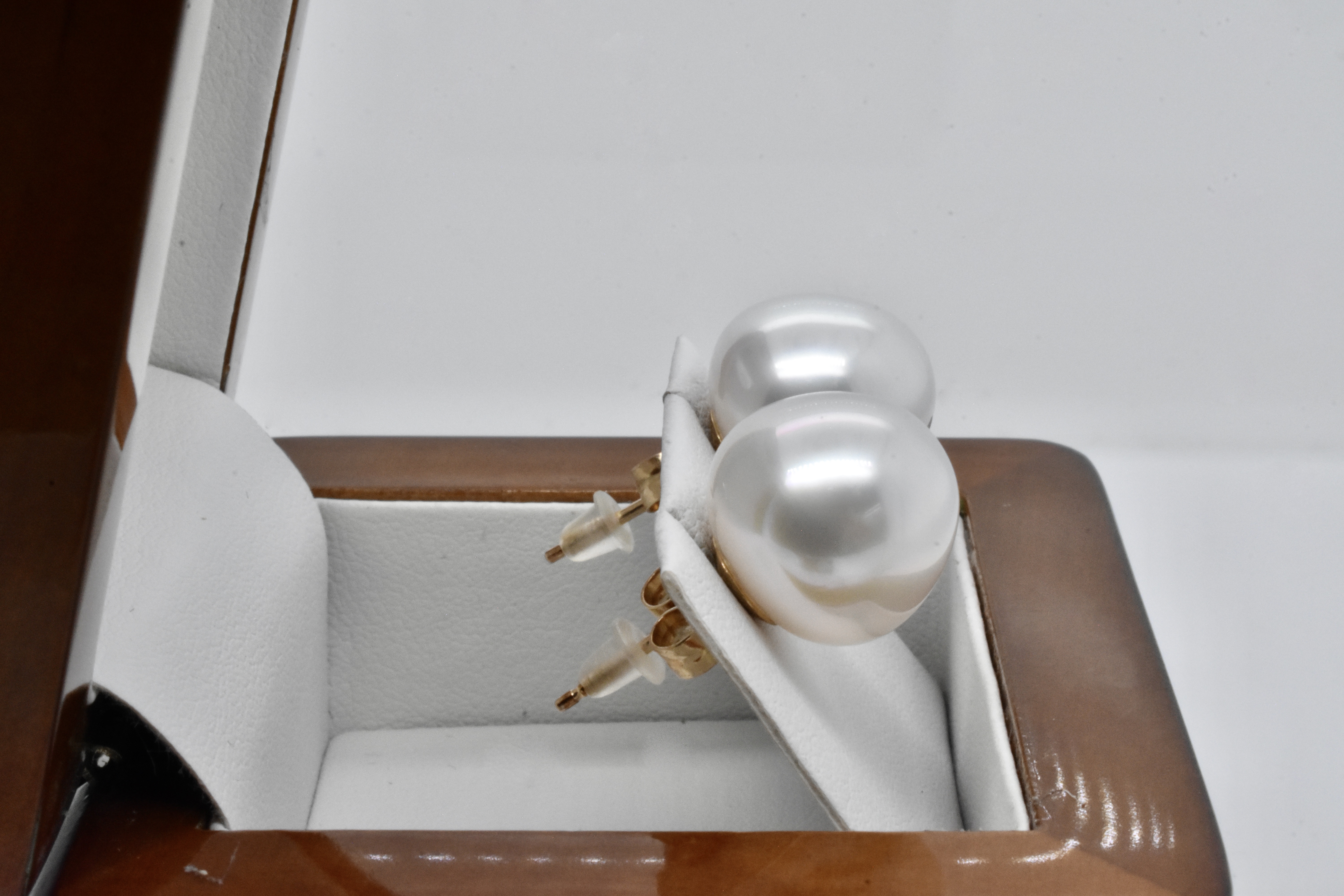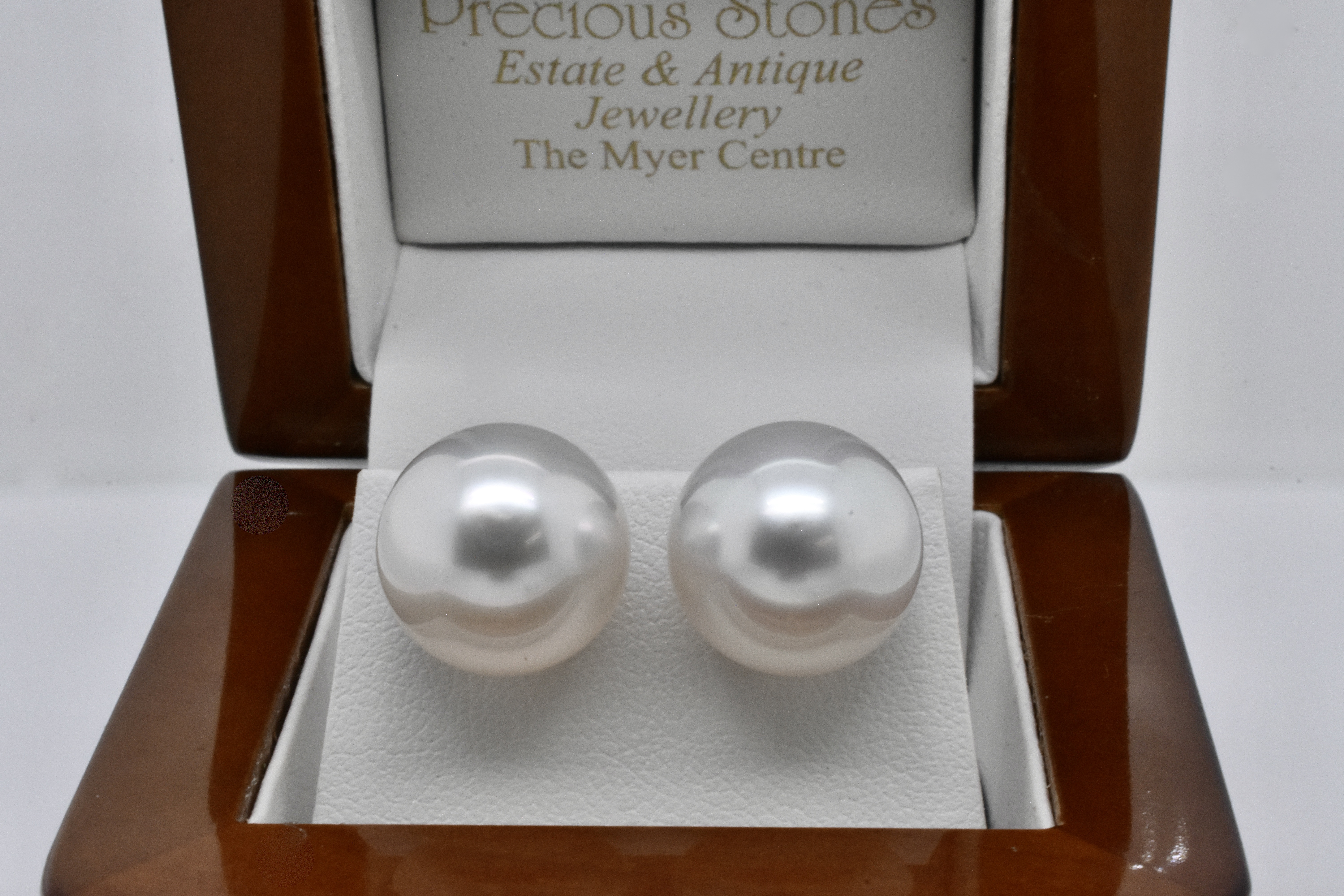 This pair of 9ct yellow gold studs feature striking, sizeable 13.5-14mm white, high dome south sea pearls with good lustre, with post and butterfly fittings