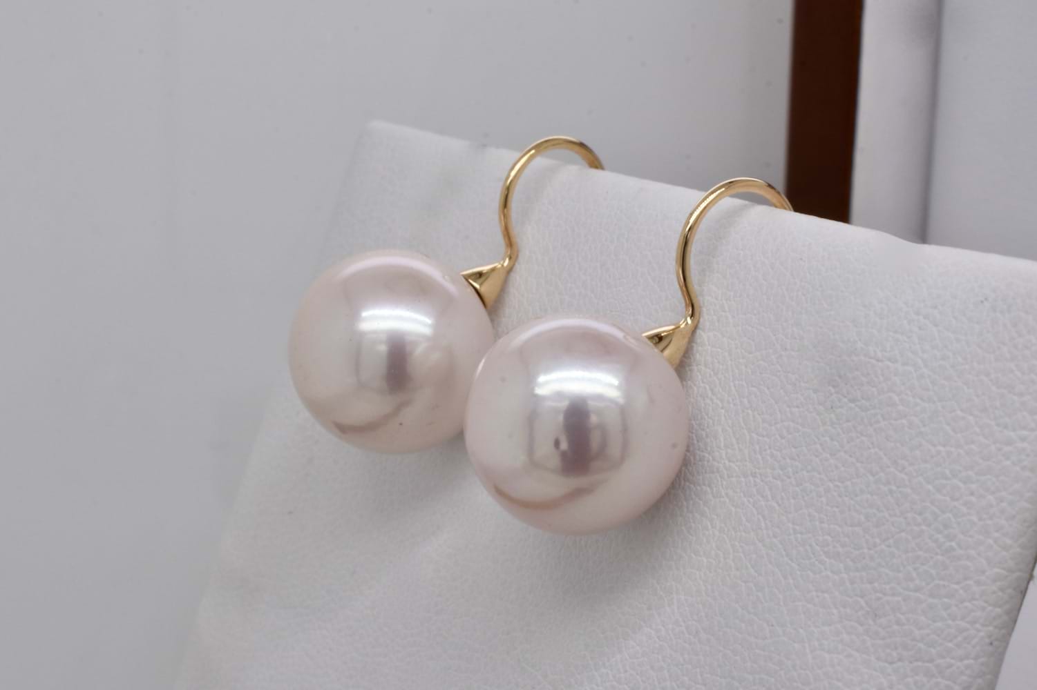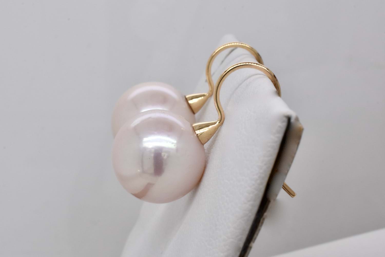 A gorgeous pair of elegant earrings crafted in 9ct yellow gold, featuring 13.5mm round pink white freshwater pearls with good lustre, suspended from fancy fixed shepherd hooks