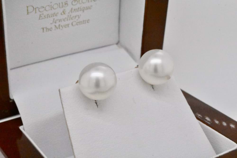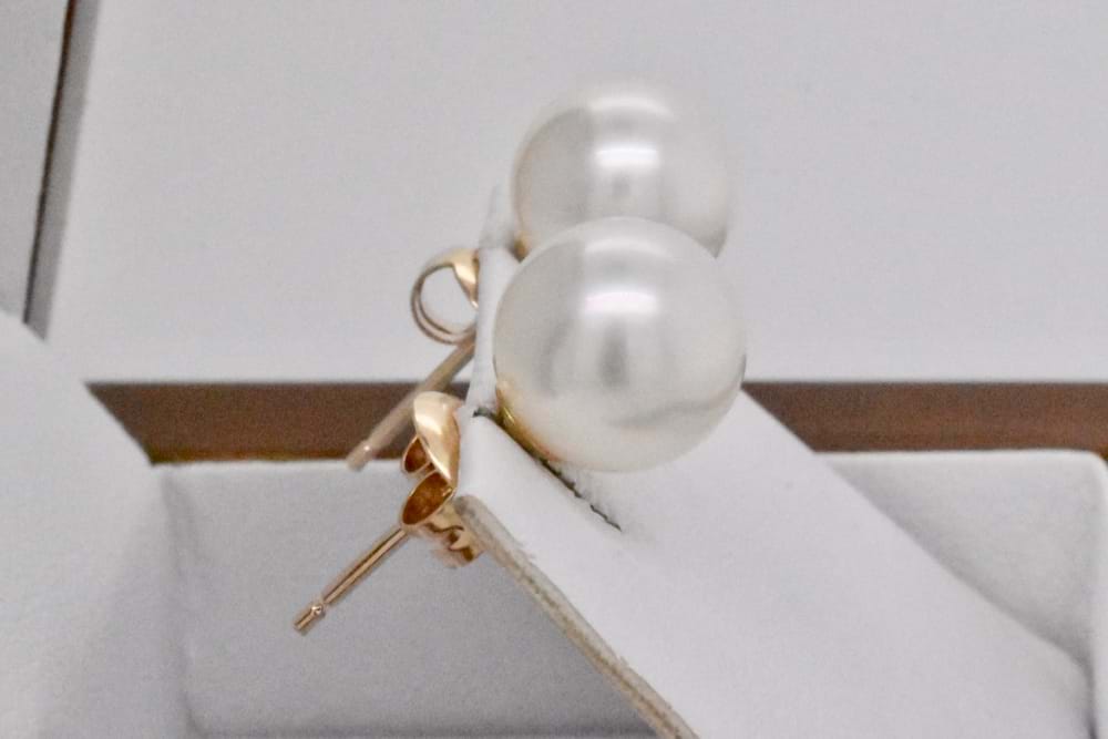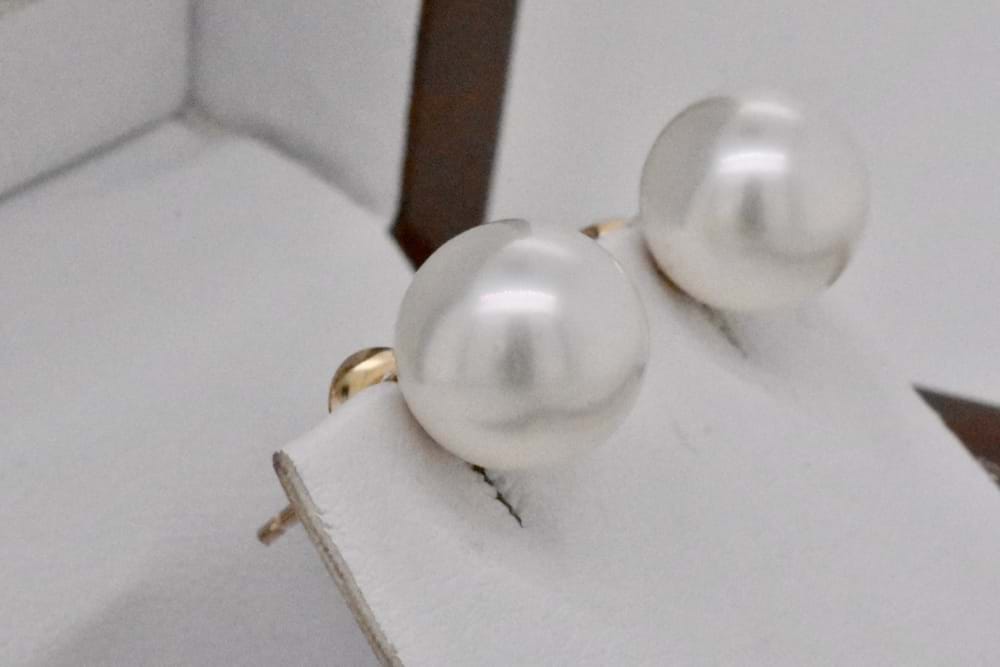 SOLD 9ct Yellow Gold 9.5-10mm White South Sea Pearl Studs