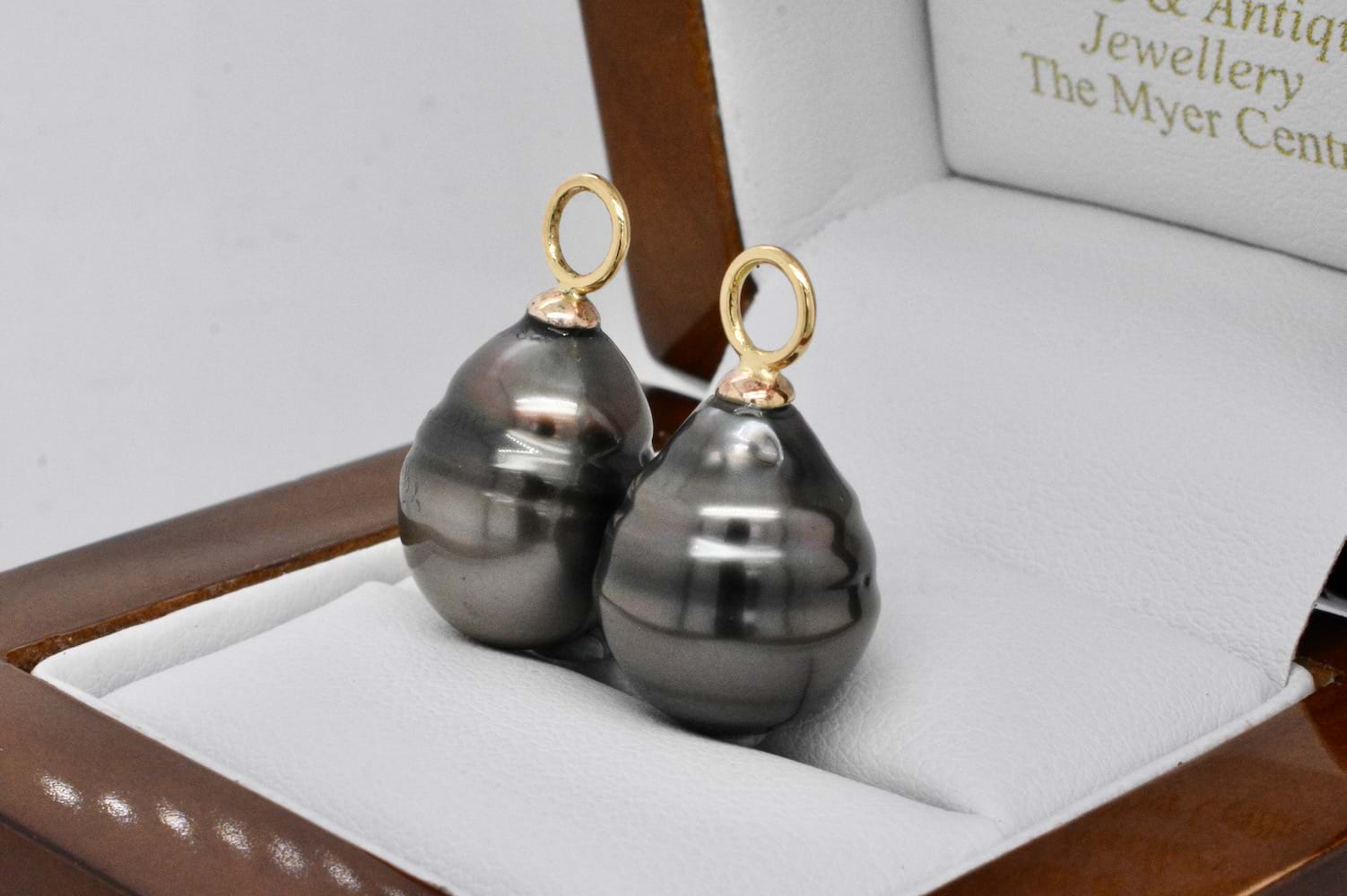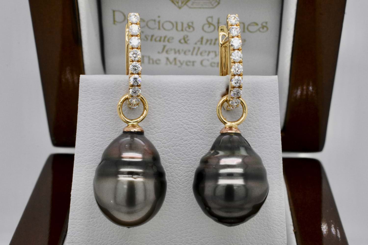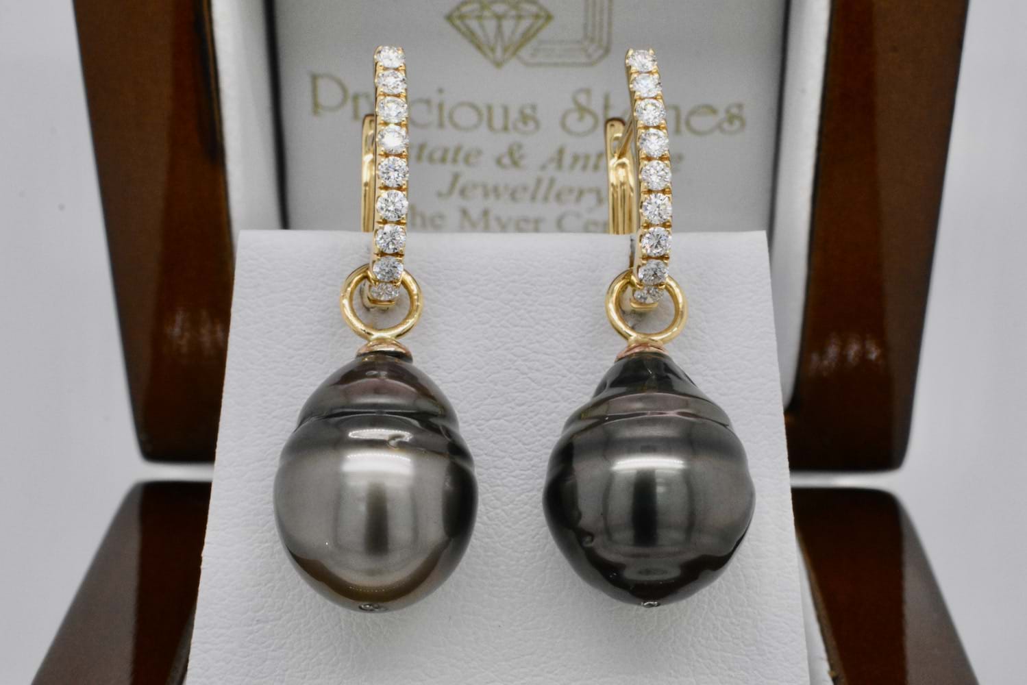 Lustrous and unique, this pair of baroque Tahitian pearls are fully drilled with a small diamond set into the base and a 9ct yellow gold cap and loop to suspend from diamond huggies. The pearls measure approx. 12-12.5mm. Diamond huggies pictured are available for separate purchase.