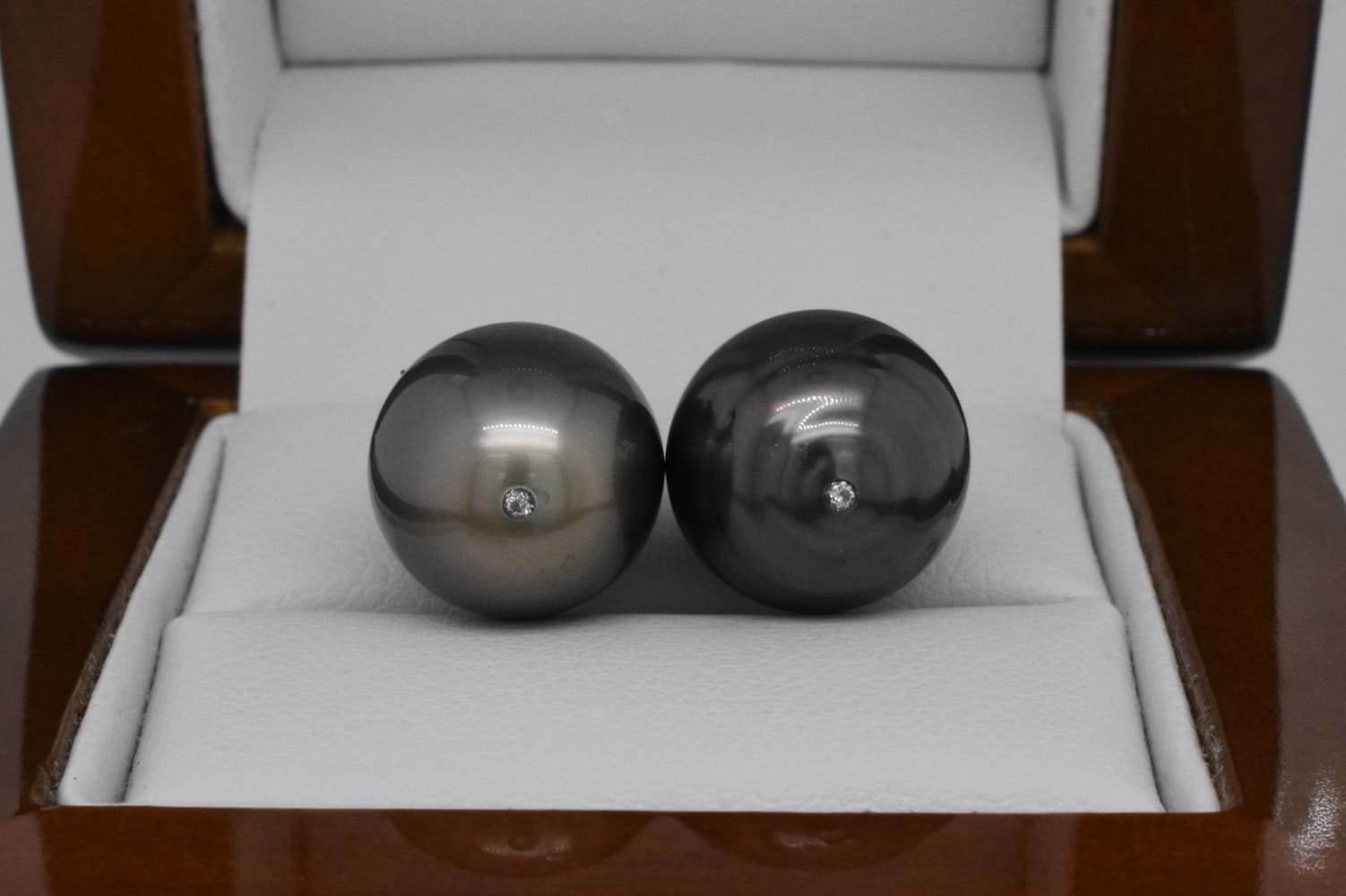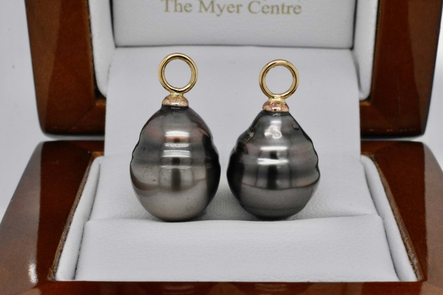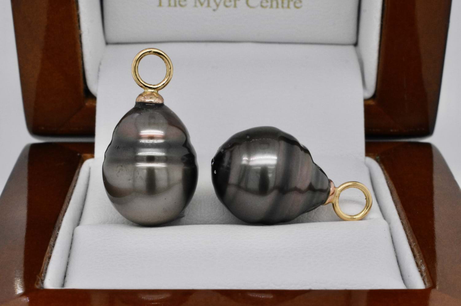 Lustrous and unique, this pair of baroque Tahitian pearls are fully drilled with a small diamond set into the base and a 9ct yellow gold cap and loop to suspend from diamond huggies. The pearls measure approx. 12-12.5mm. Diamond huggies pictured are available for separate purchase.