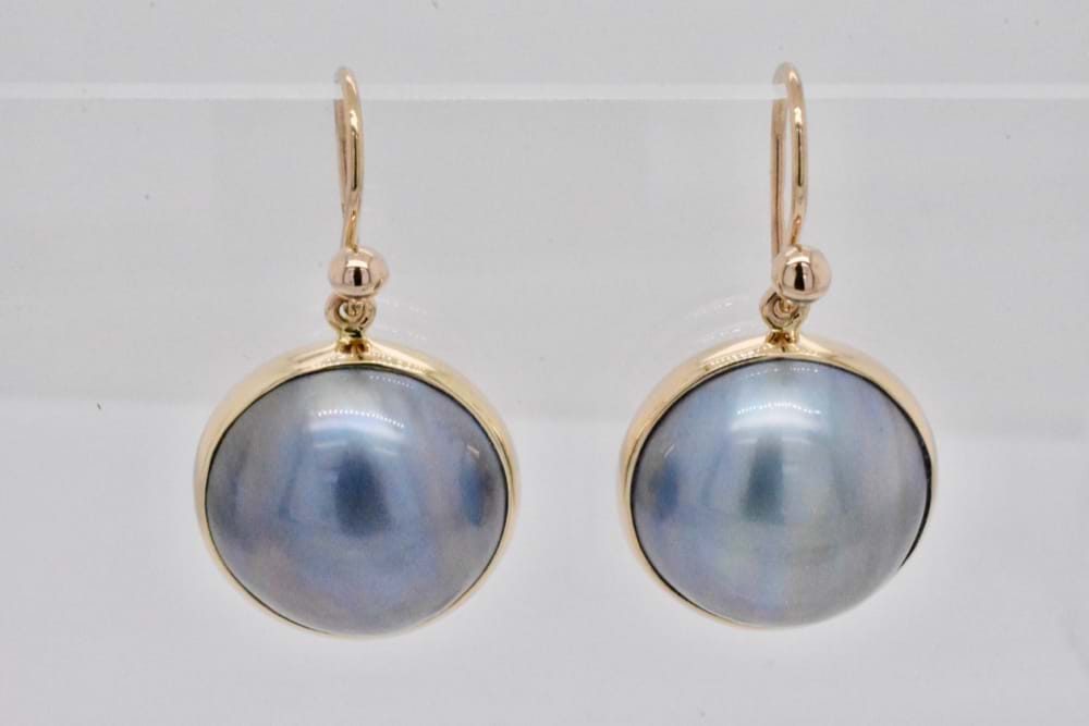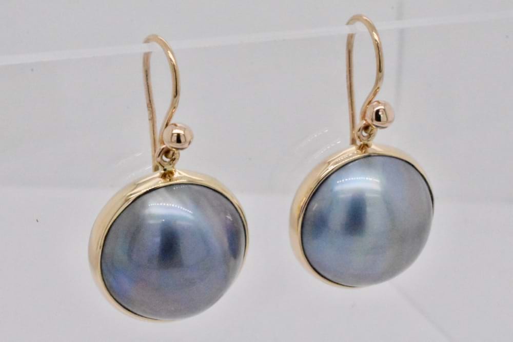 A pair of dyed black Mabe pearls measuring 15mm round set into handmade 9ct yellow gold bezels with shepherd hook fittings