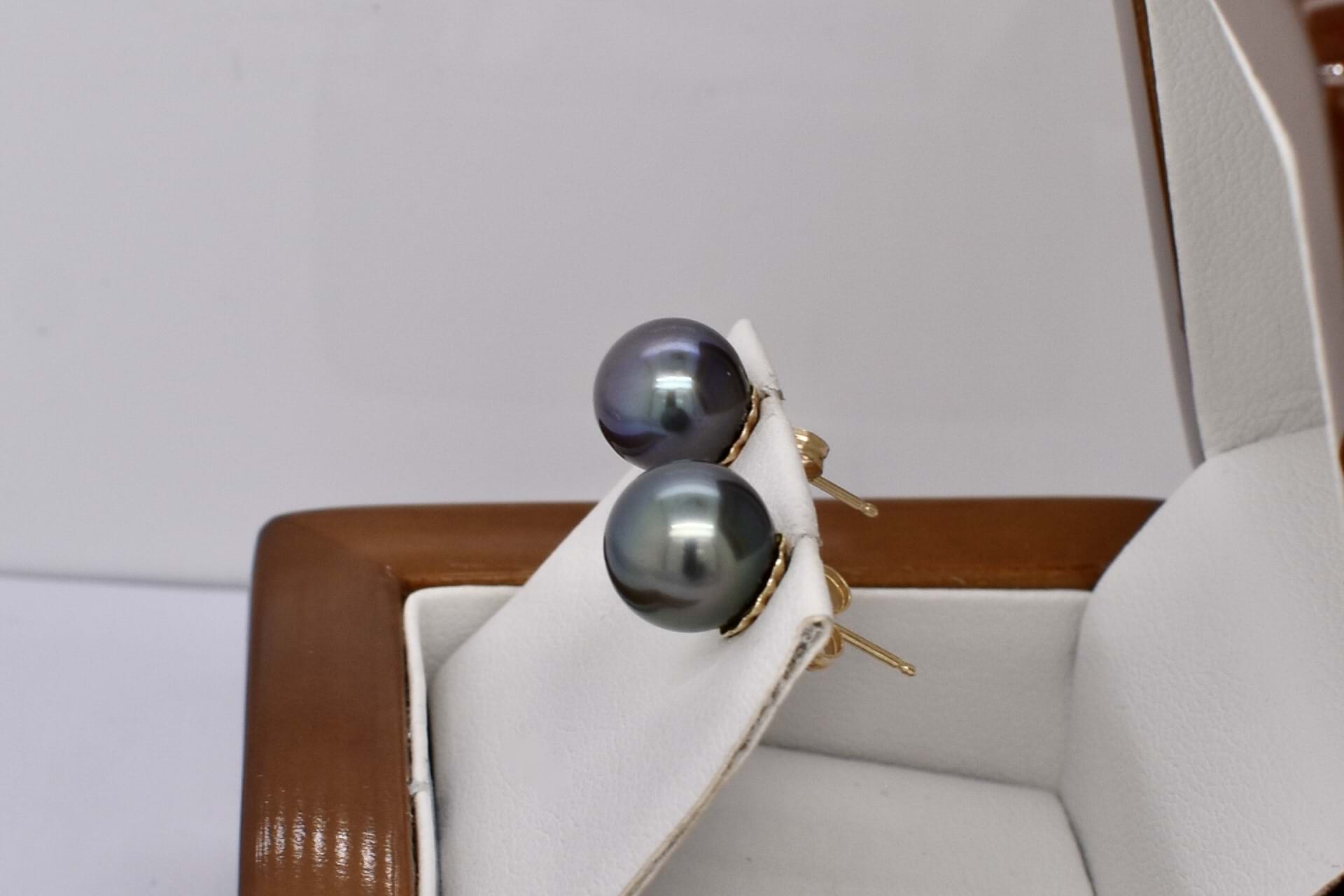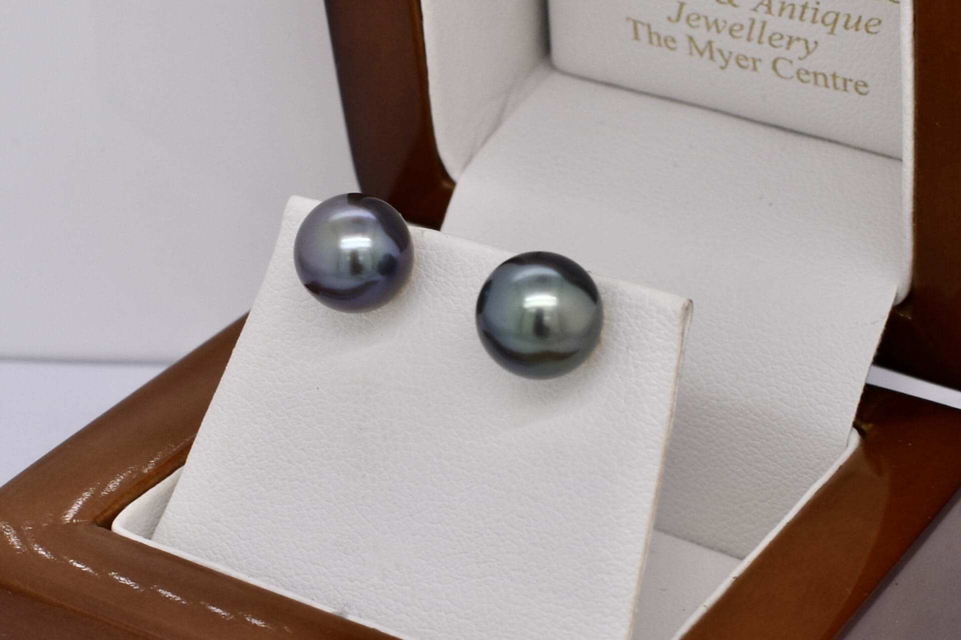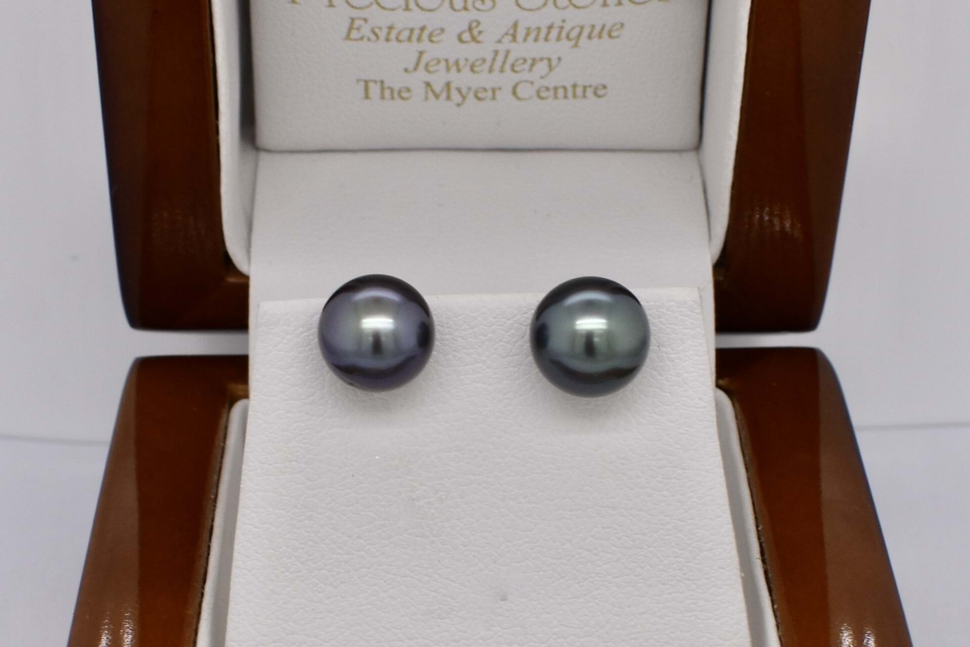 Amazing secondhand bargain! These classically beautiful black pearl studs, measuring 8.5-9mm near round, set in 9ct yellow gold post and butterfly fittings.