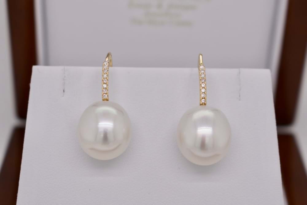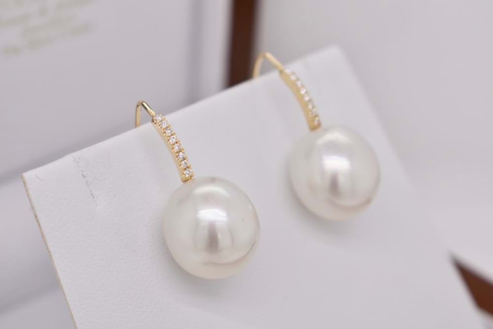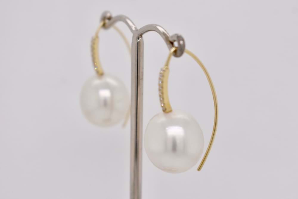 9ct yellow gold Pearl and Diamond drop earrings. Total of 16 round brilliant cut Diamonds set into the shepherd hook drop and a 13-13.5mm white South Sea Pearl attached at the bottom. Independent valuation supplied