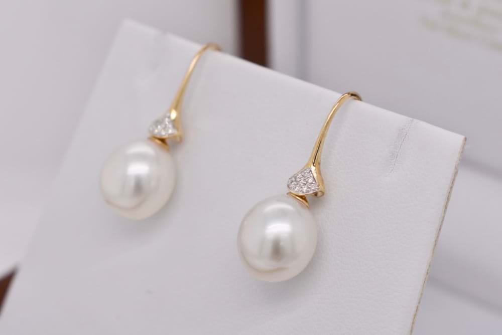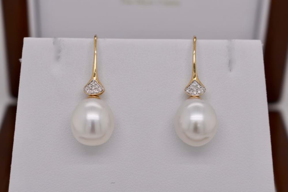 9ct yellow gold and white South Sea Diamond drop earrings. 18 round brilliant cut Diamonds totaling 0.07ct and 10.5-11mm white South Sea Pearls. Independent valuation supplied