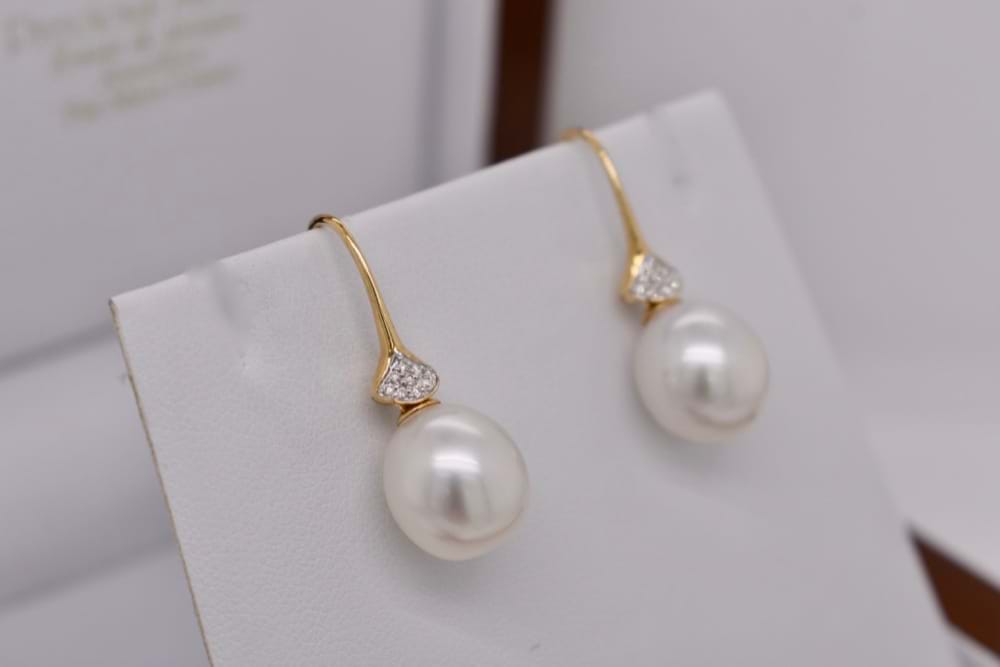 SOLD 9ct Yellow Gold South Sea Pearl & Diamond Drop Earrings