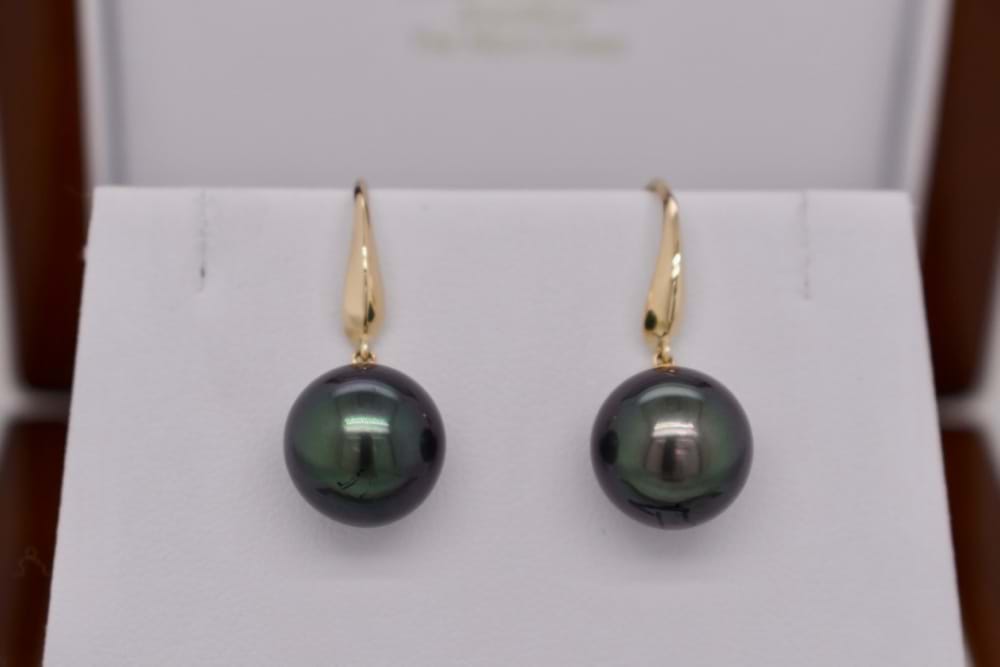 9ct yellow gold drop earrings set with an 11.5-12mm black Tahitian Pearl