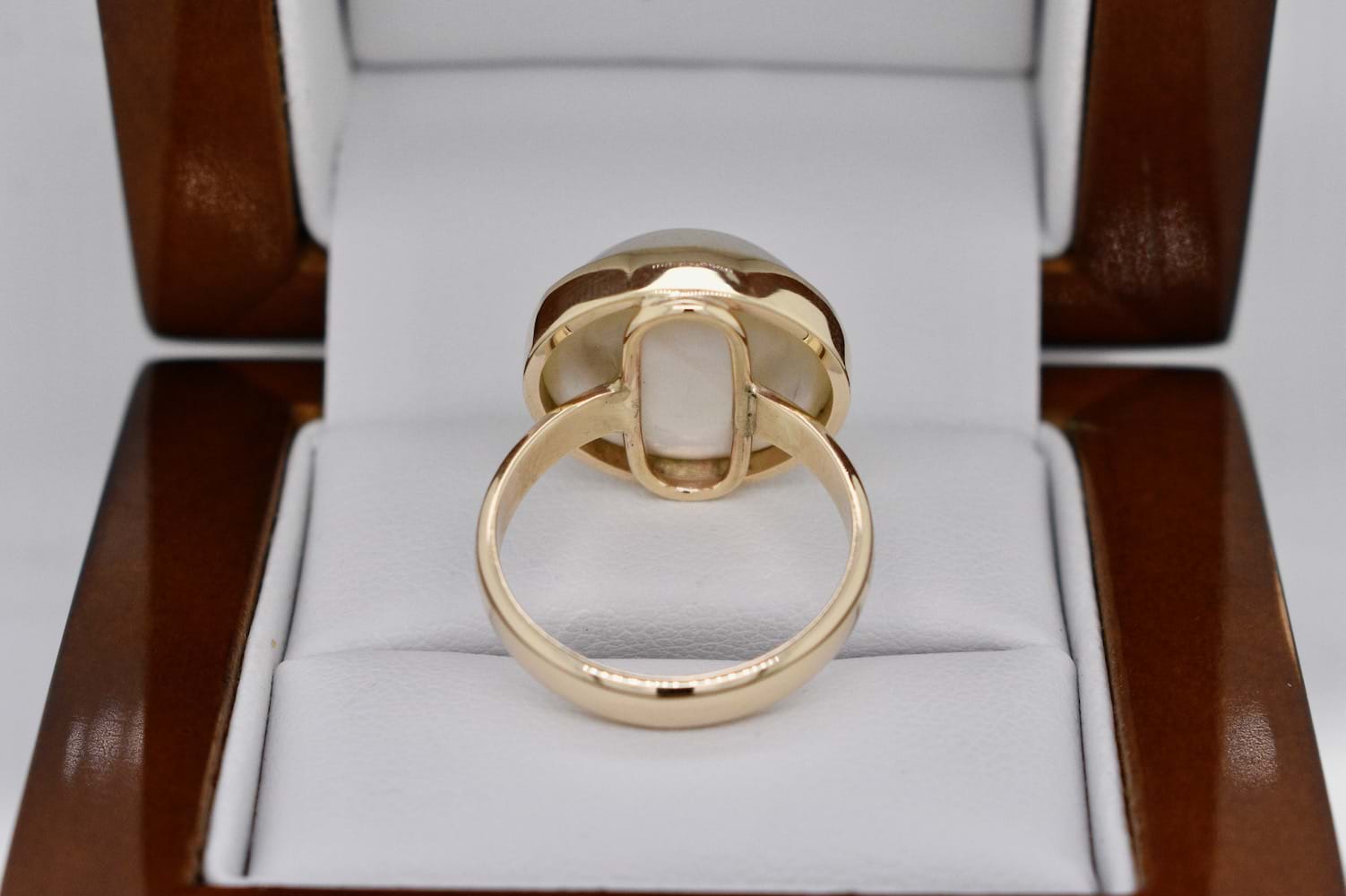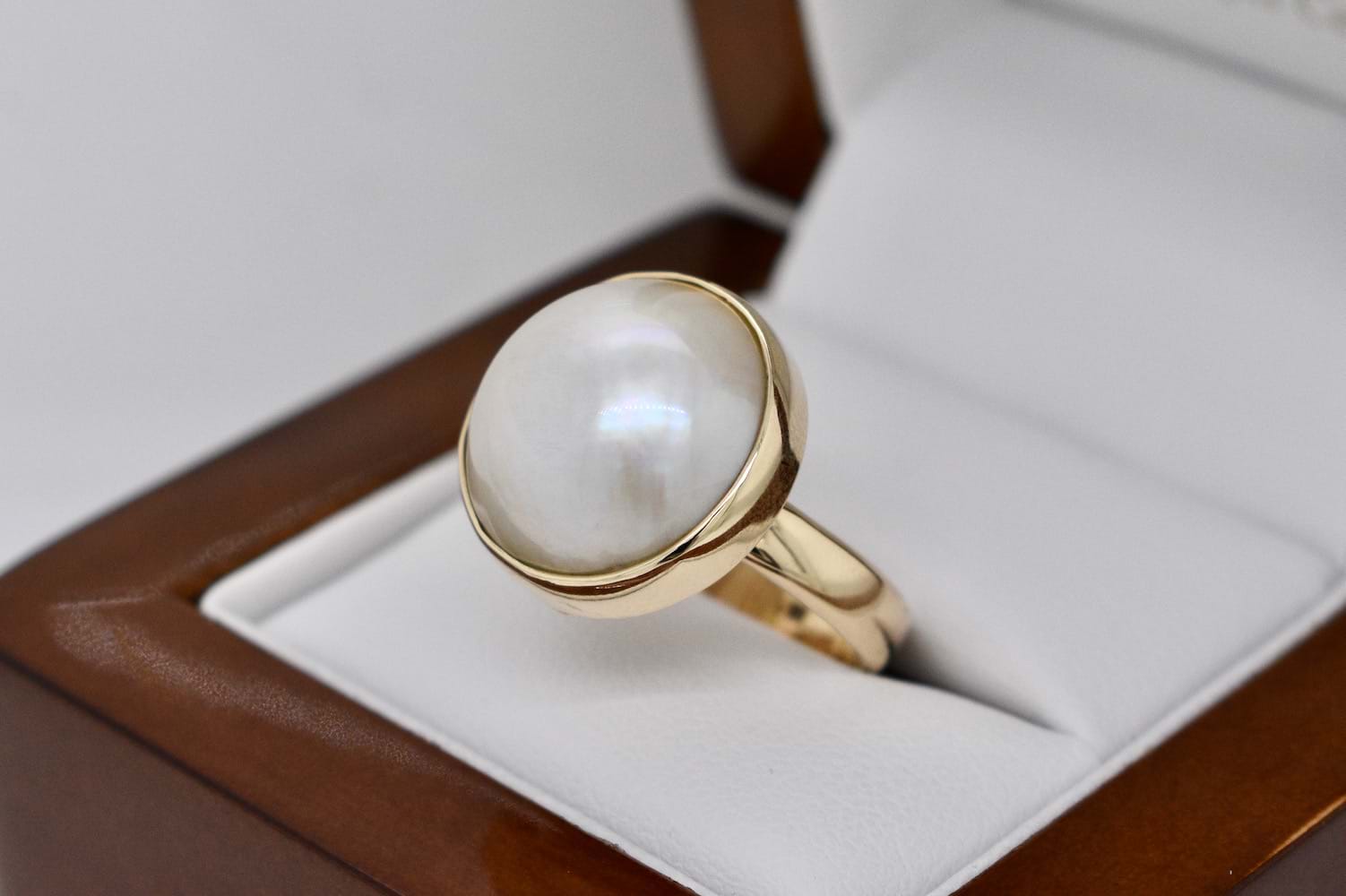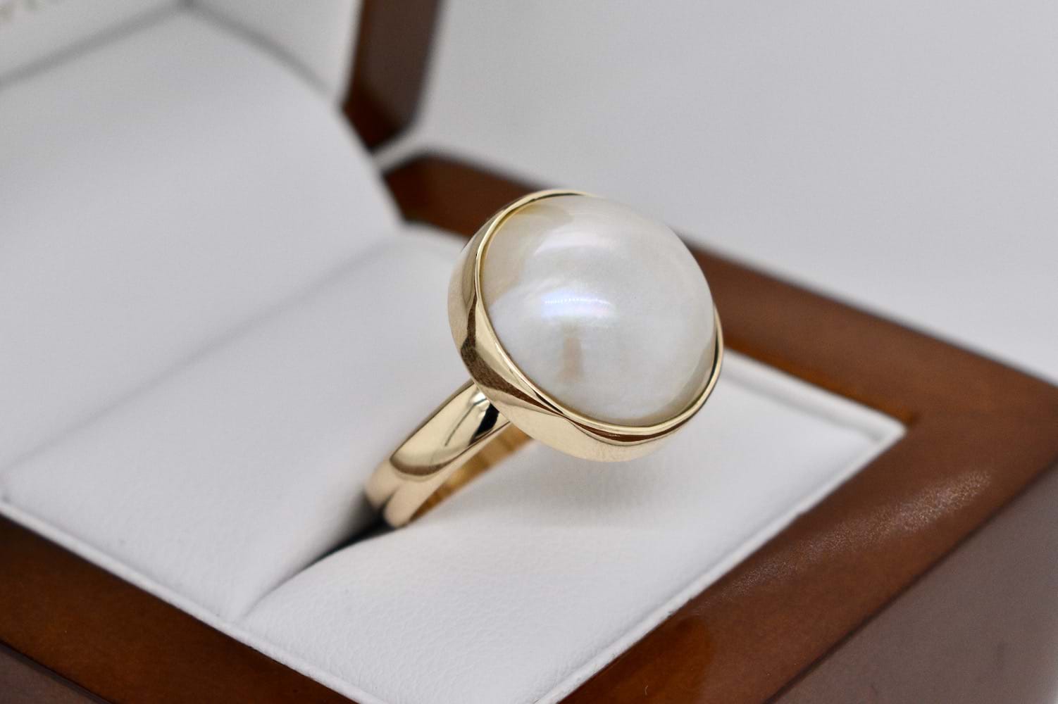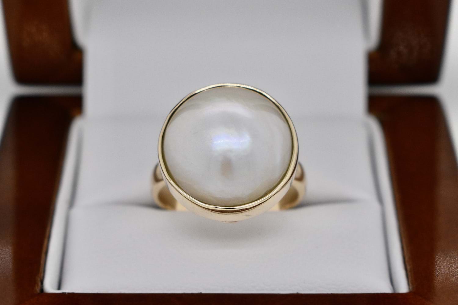 Stunning handmade 9ct yellow gold ring featuring a bezel set 16.5mm white mabe pearl with a plain band. Finger size L