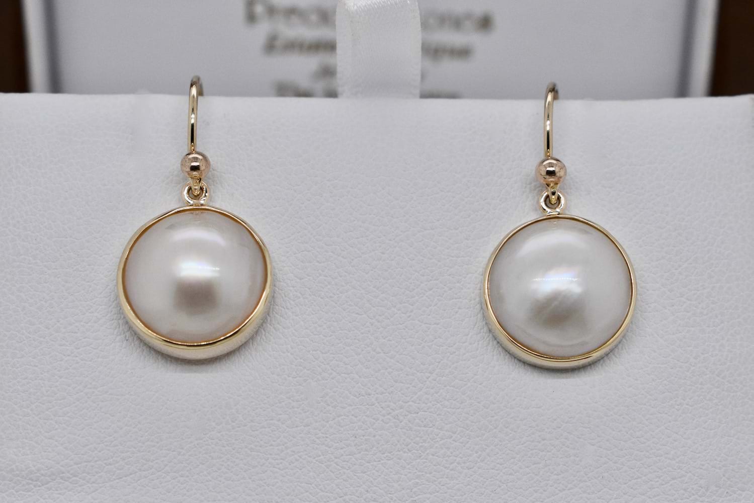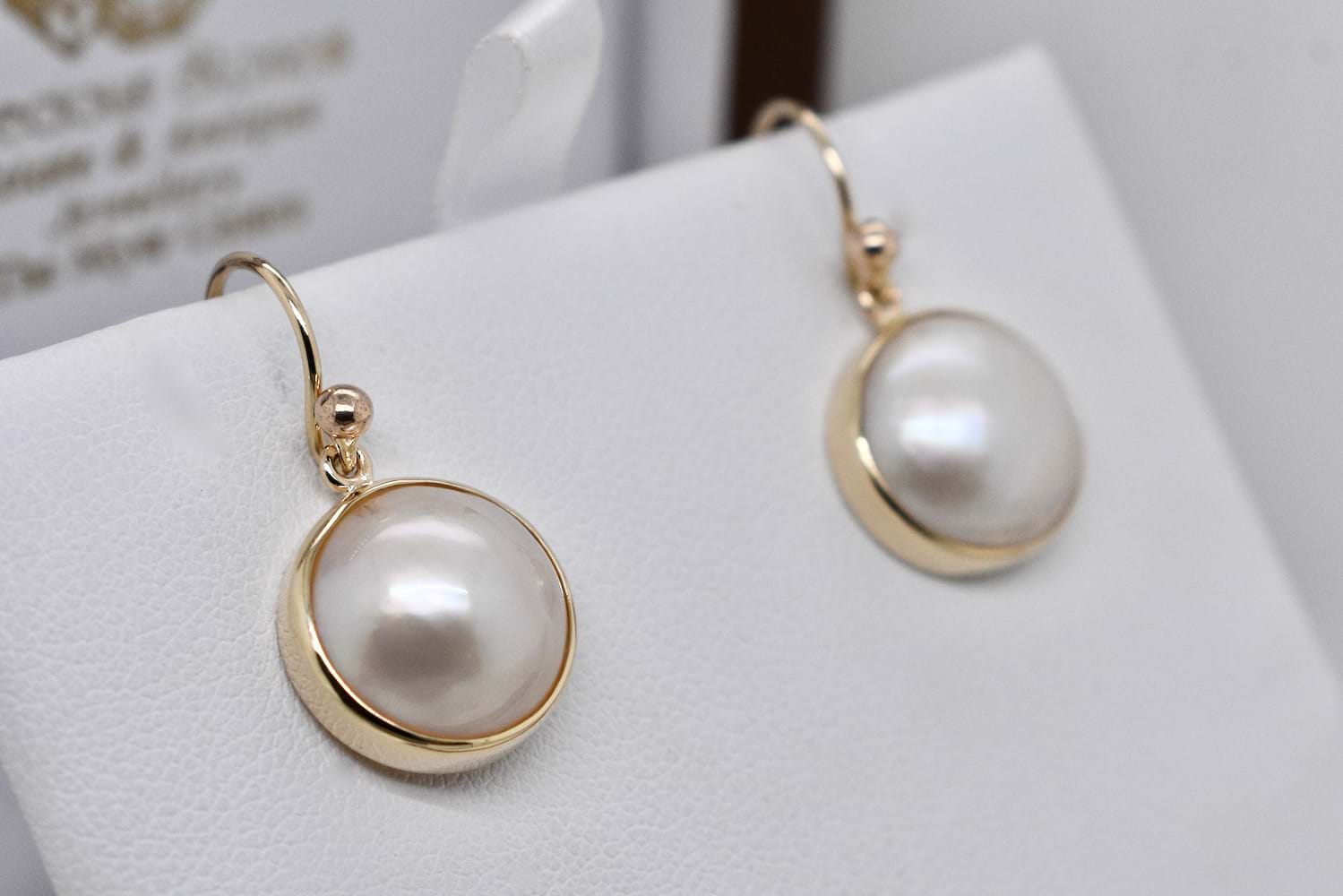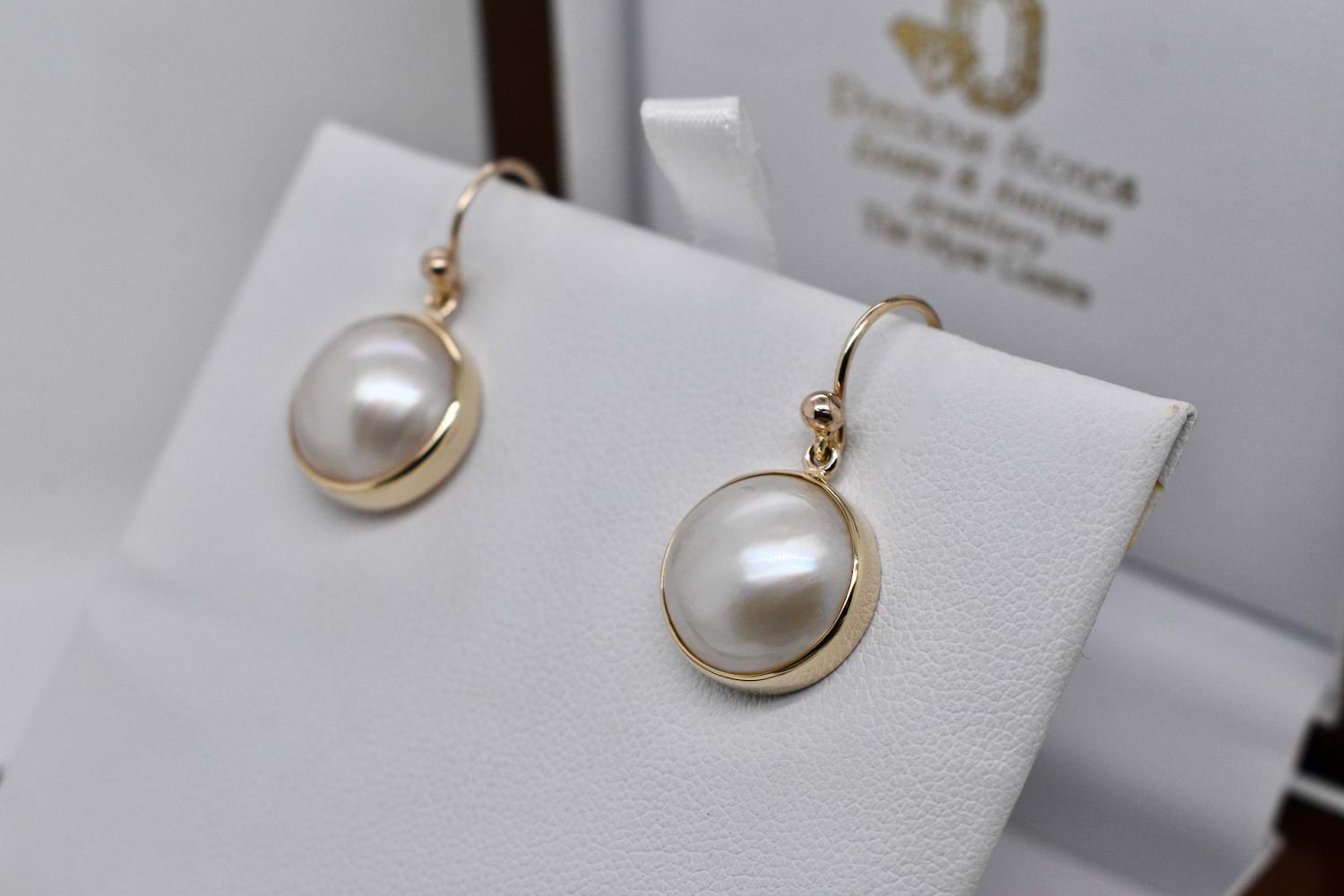 Handmade 9ct yellow gold drop earrings with 14mm white mabe pearls bezel set and suspended from shepherd hook fittings