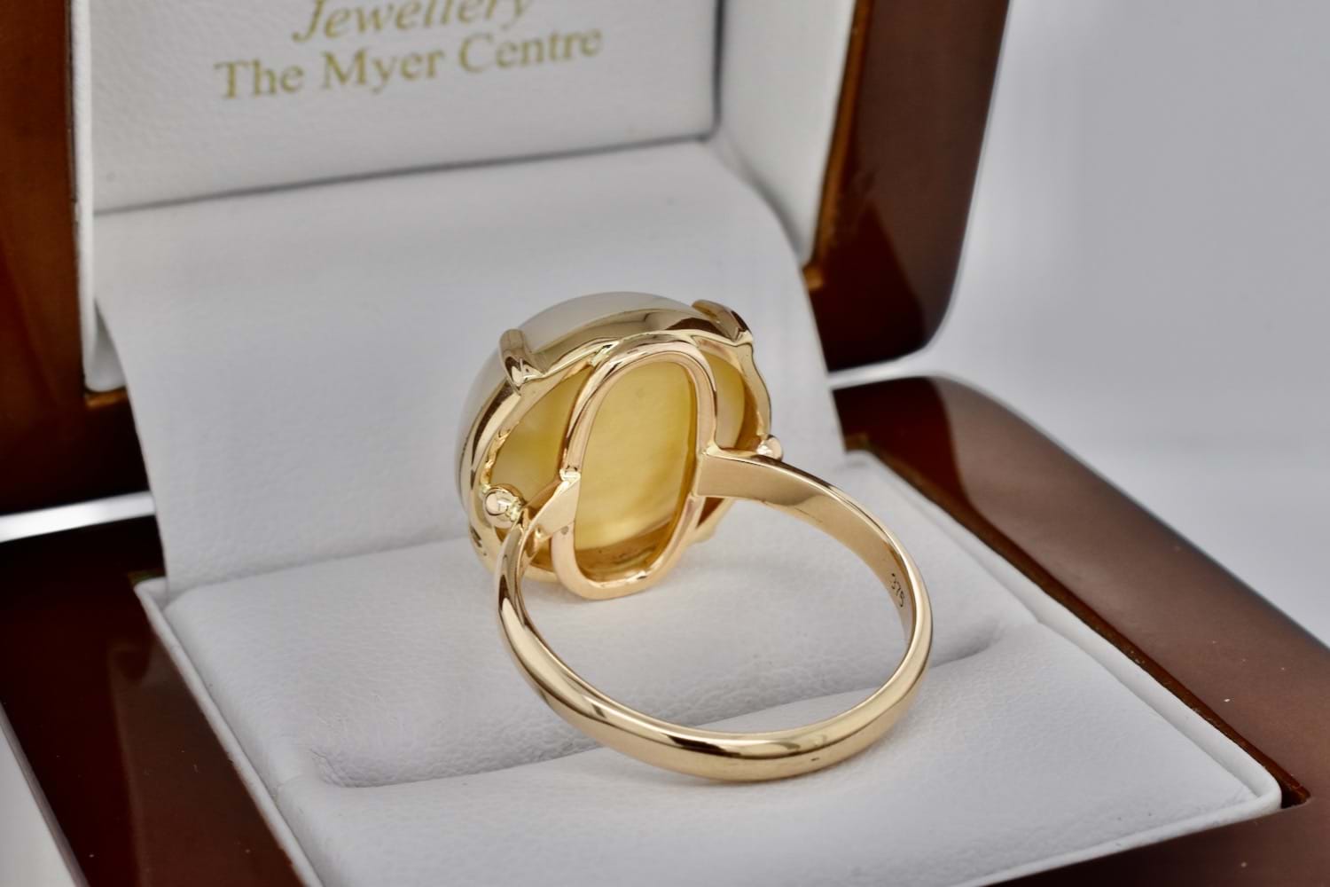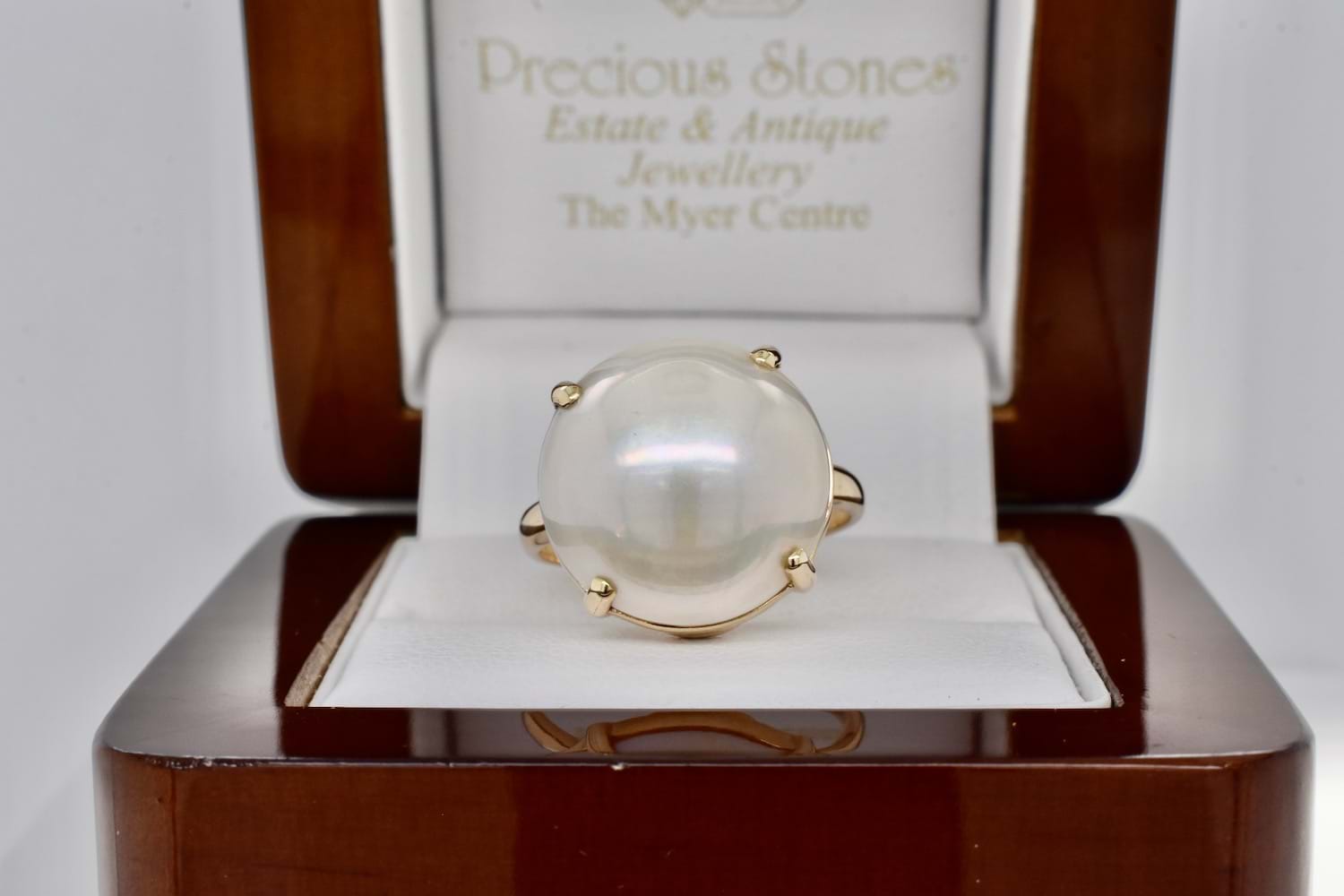 Stunning and simple handmade 9ct yellow gold four claw set ring featuring a lustrous white mabe pearl measuring approx. 16mm round. Finger size P