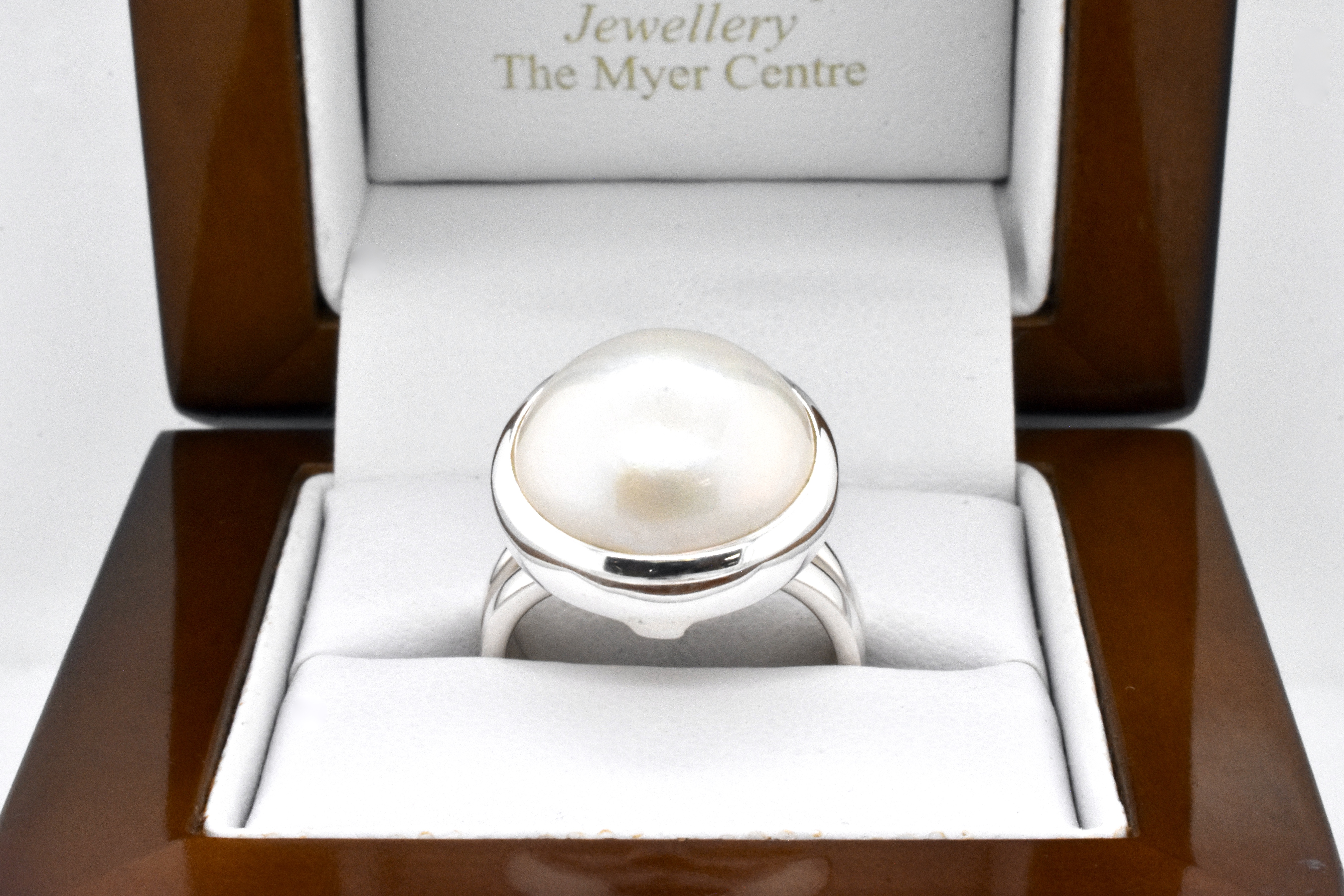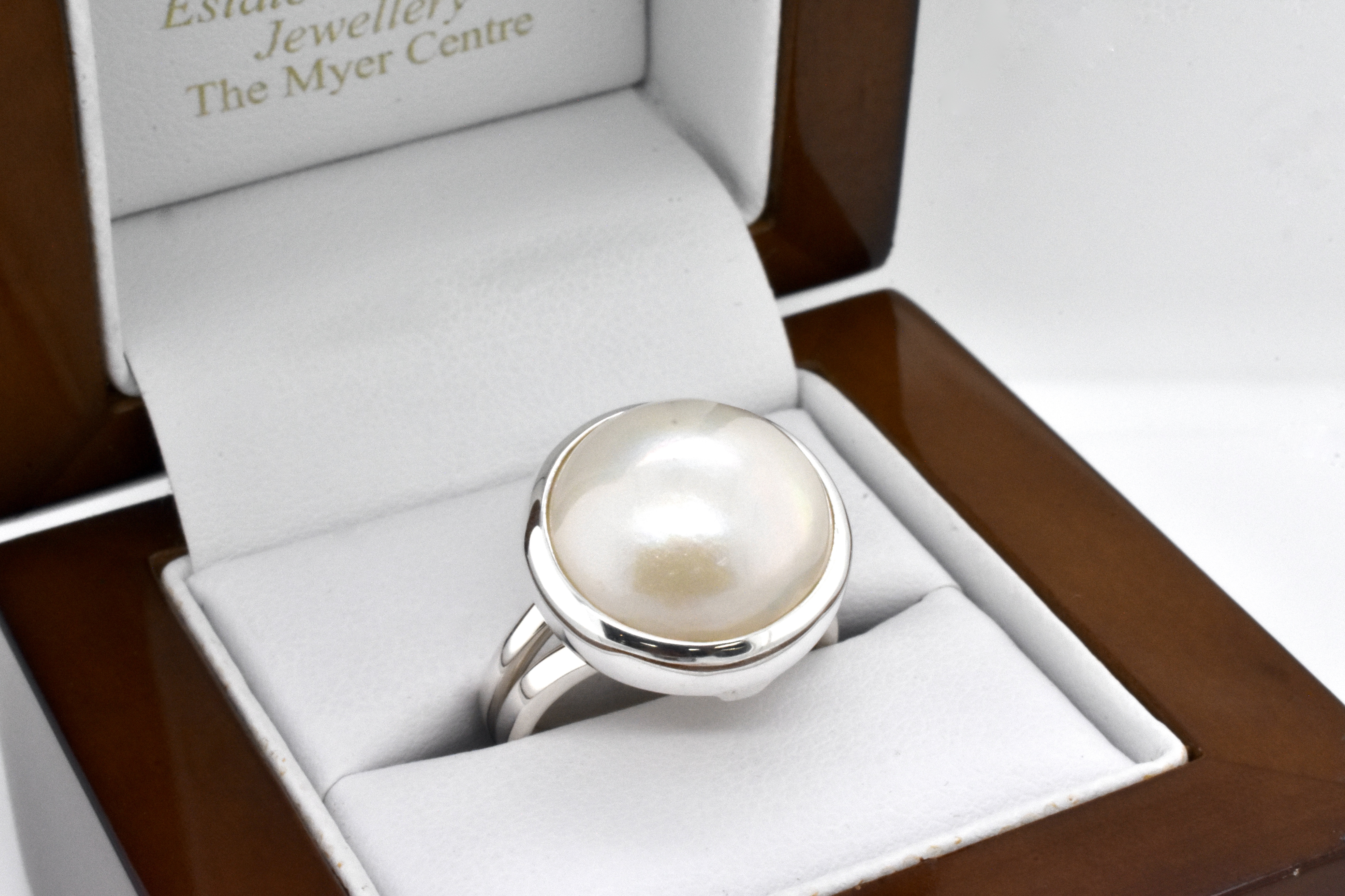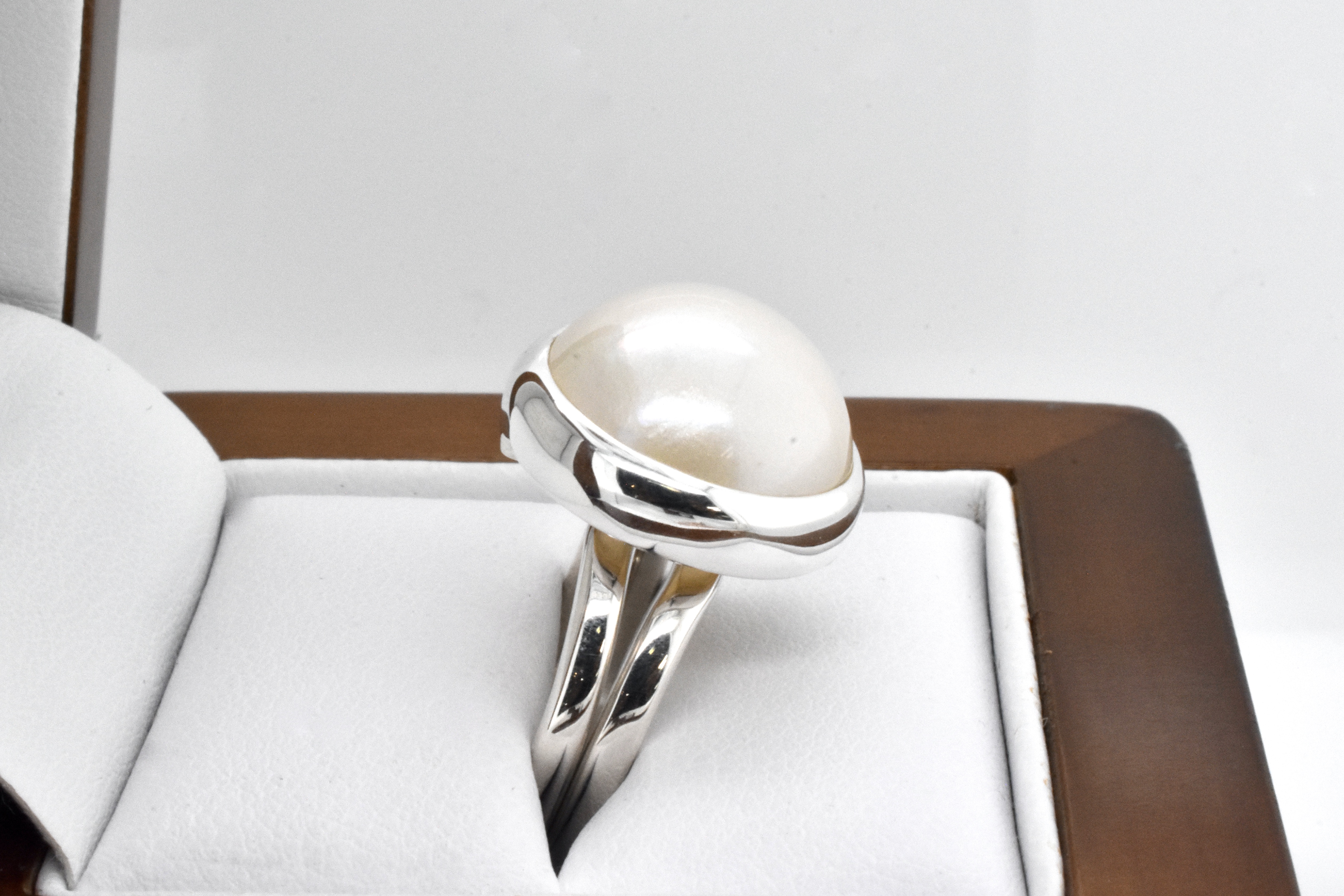 Classic pearl ring, handmade in sterling silver with a white mabe pearl measuring approx. 17mm round, in a plain bezel setting with plain band. Finger size N adjustable