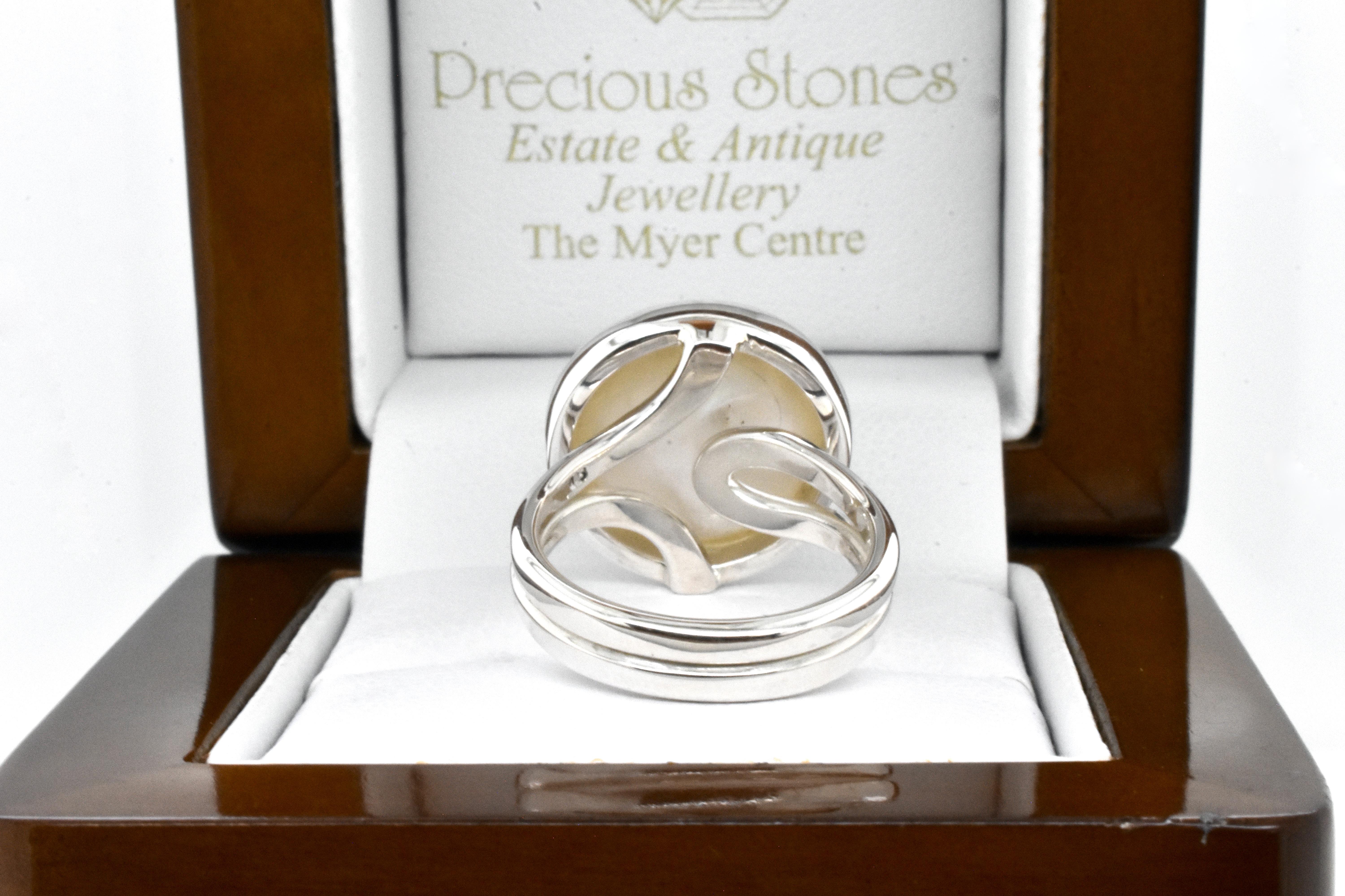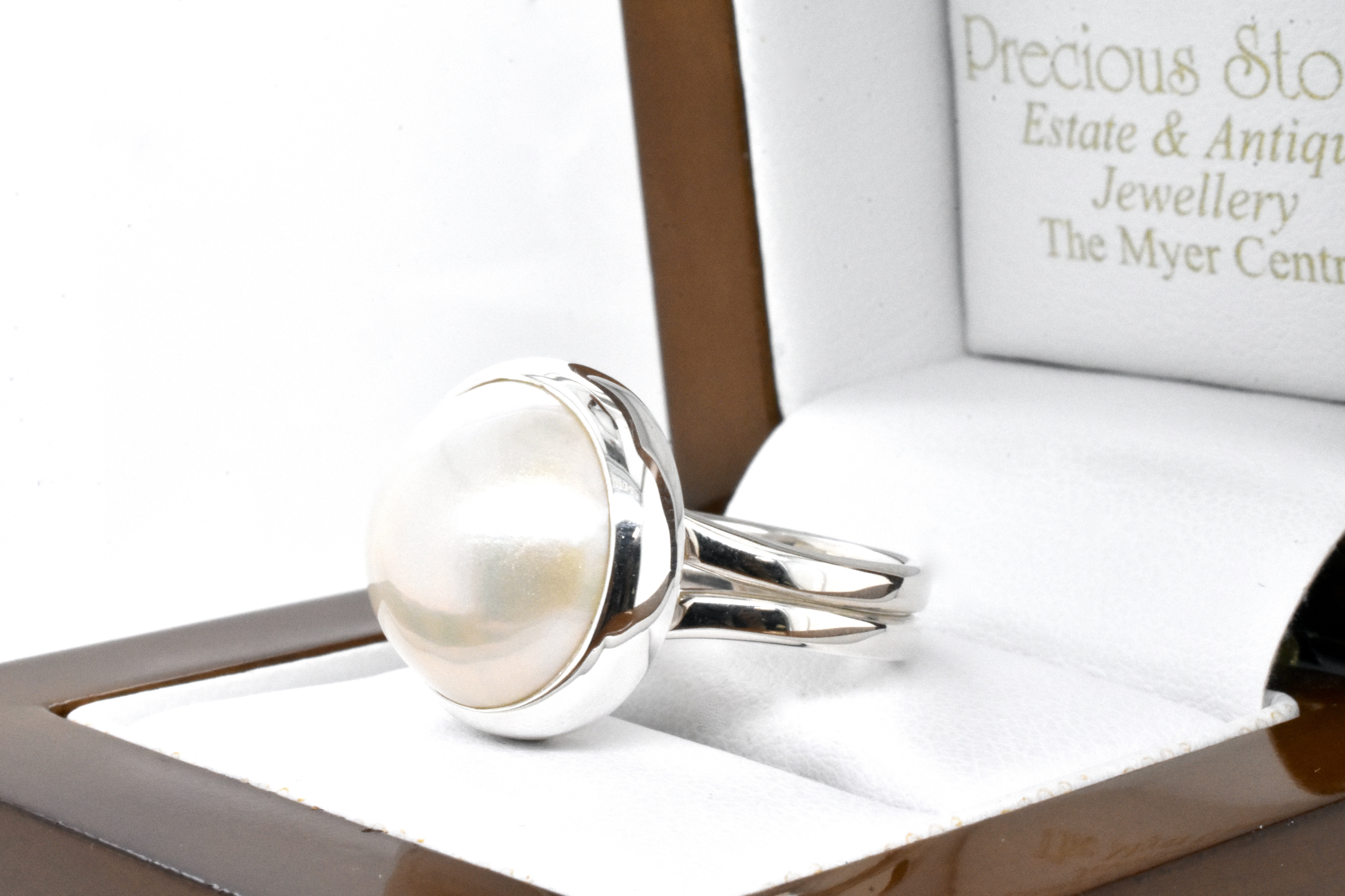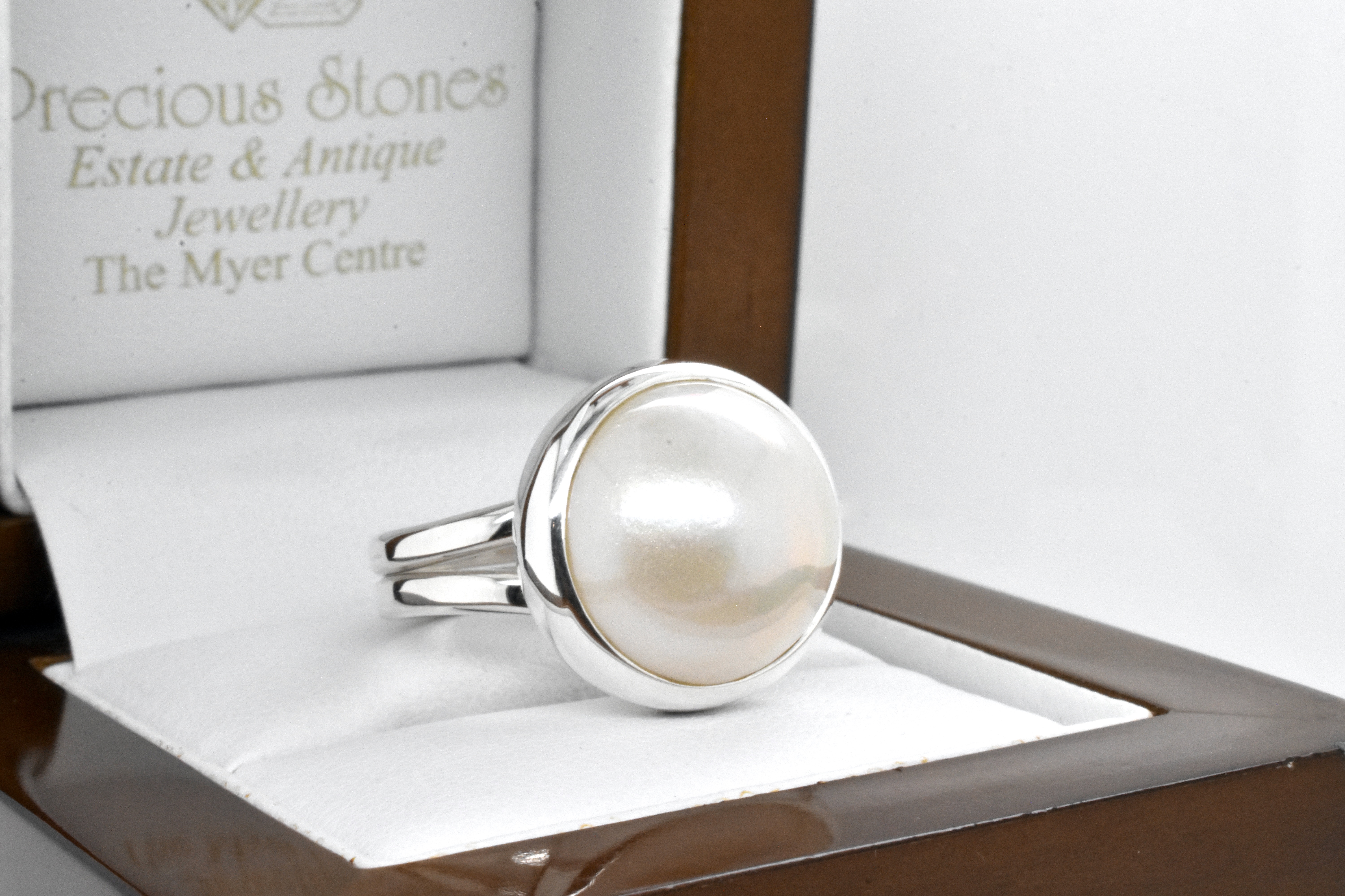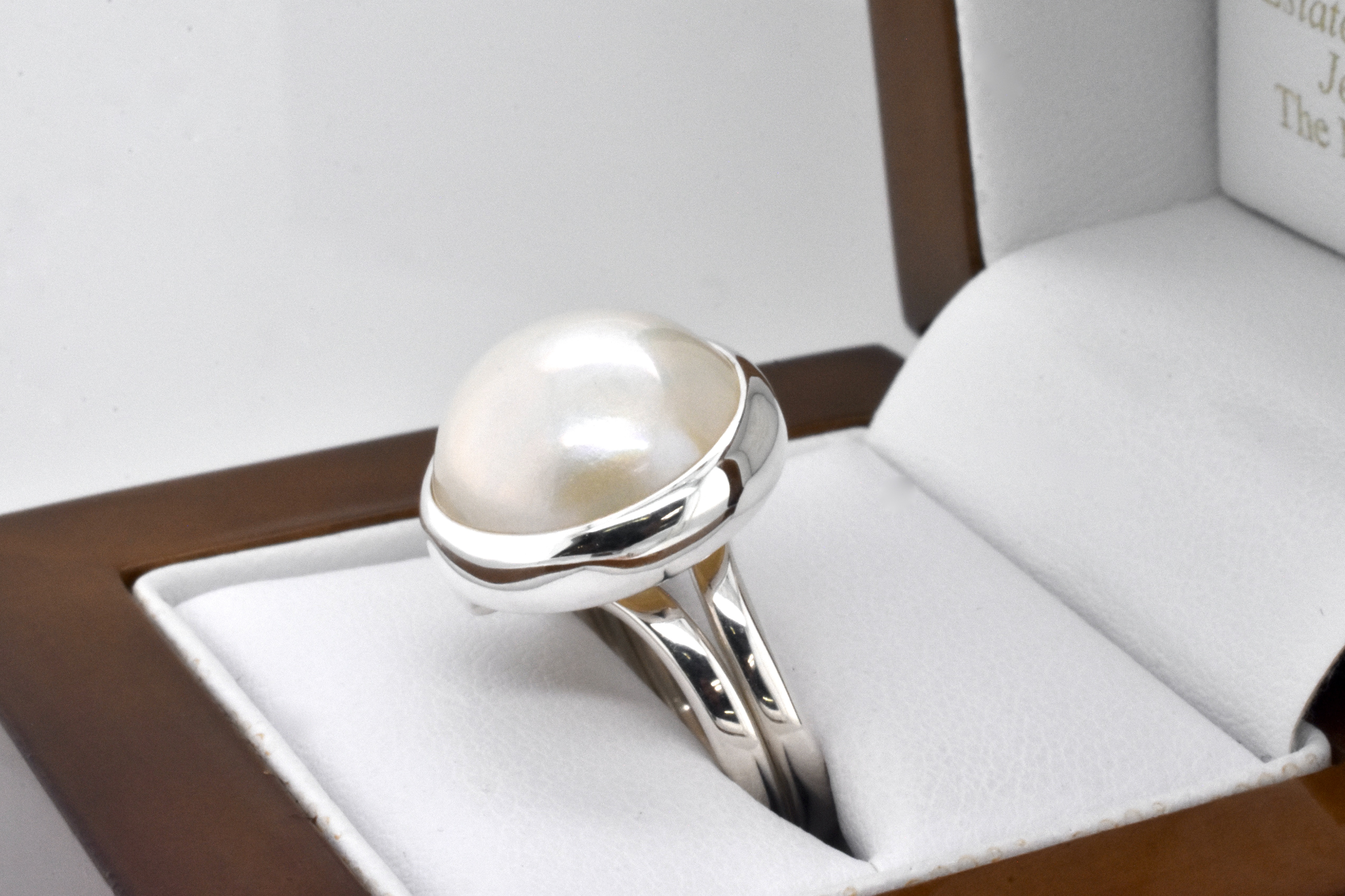 Classic pearl ring, handmade in sterling silver with a white mabe pearl measuring approx. 17mm round, in a plain bezel setting with plain band. Finger size N adjustable