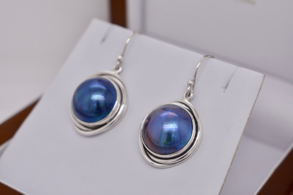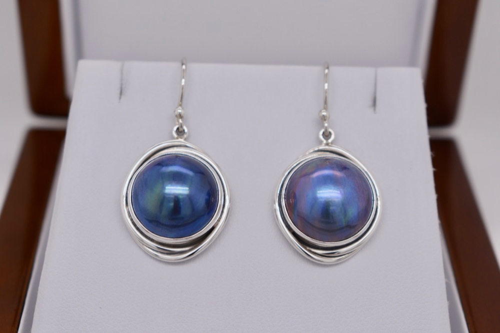 SOLD Sterling Silver Black Mabe Pearl Swirl Design Drop Earrings