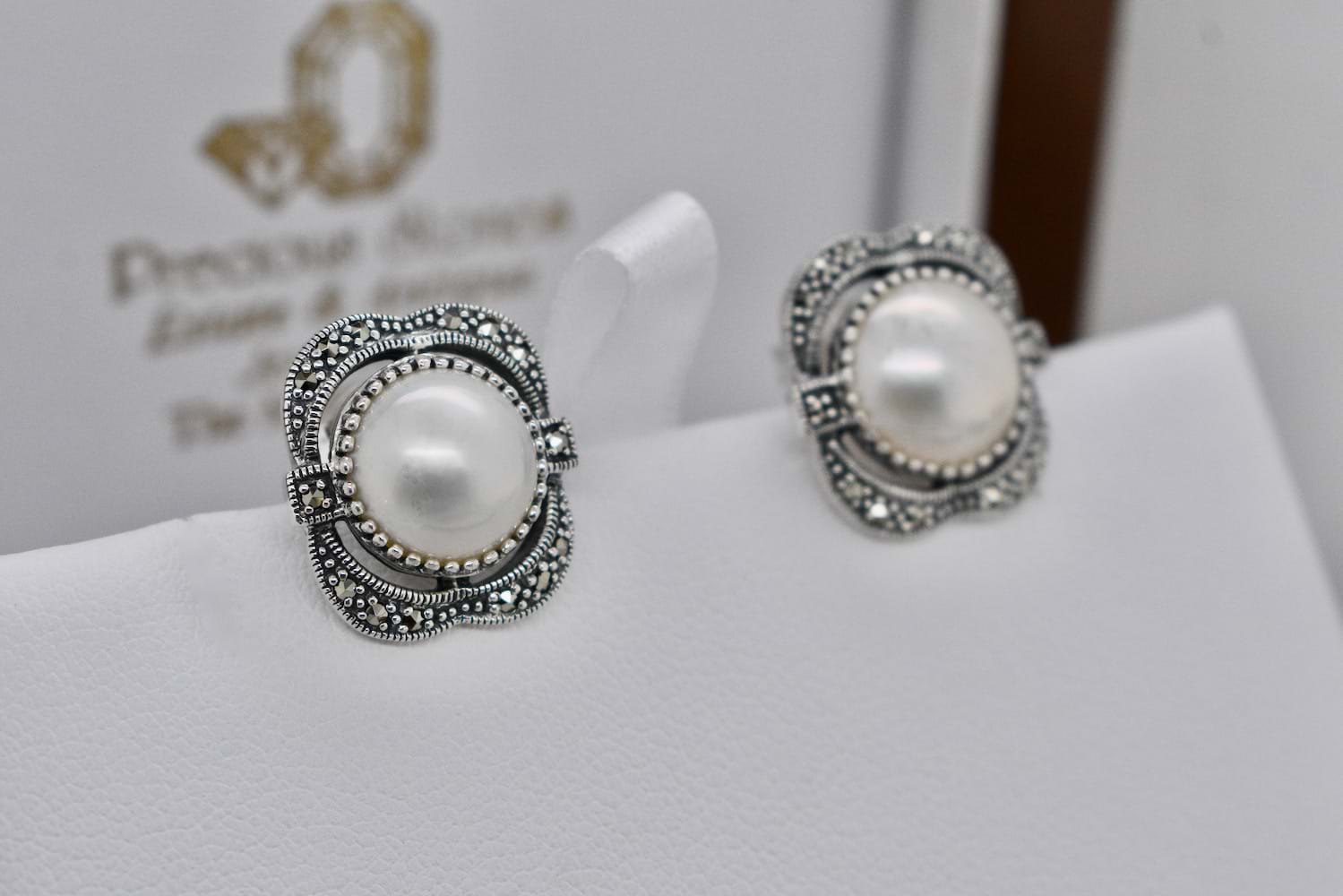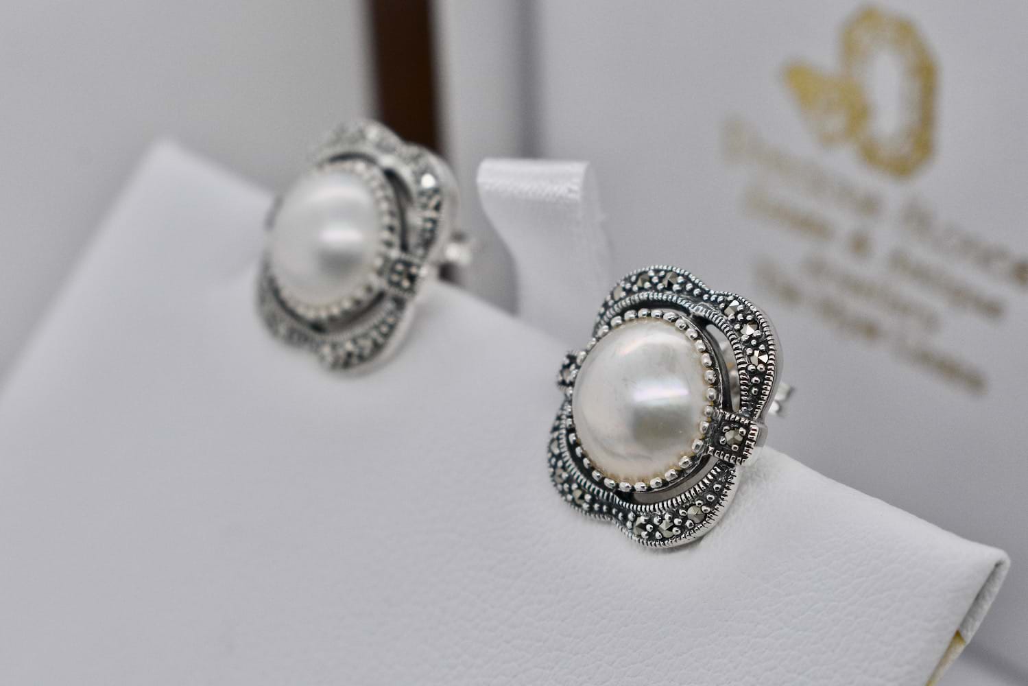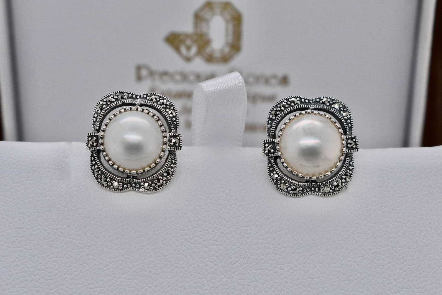 A gorgeous pair of 9mm round white Mabe pearls, set into Sterling Silver with a gorgeously detailed vintage inspired setting with marcasites. Approximately 15 x 14mm overall size with post and butterfly fittings