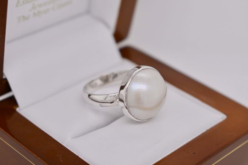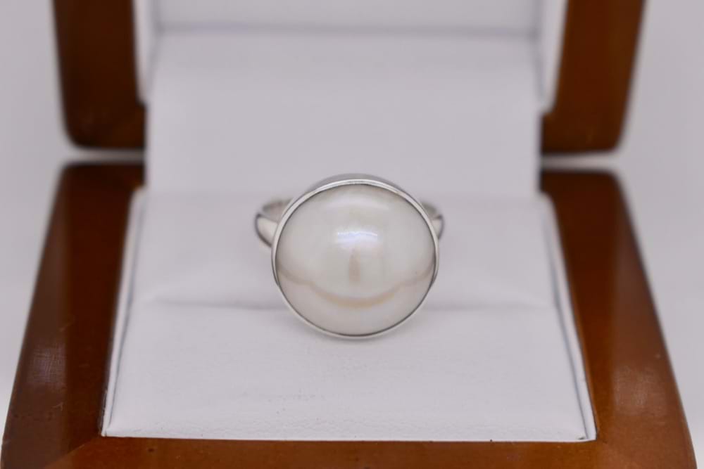 Sterling silver bezel set 15mm white Mabe pearl ring. Finger size O