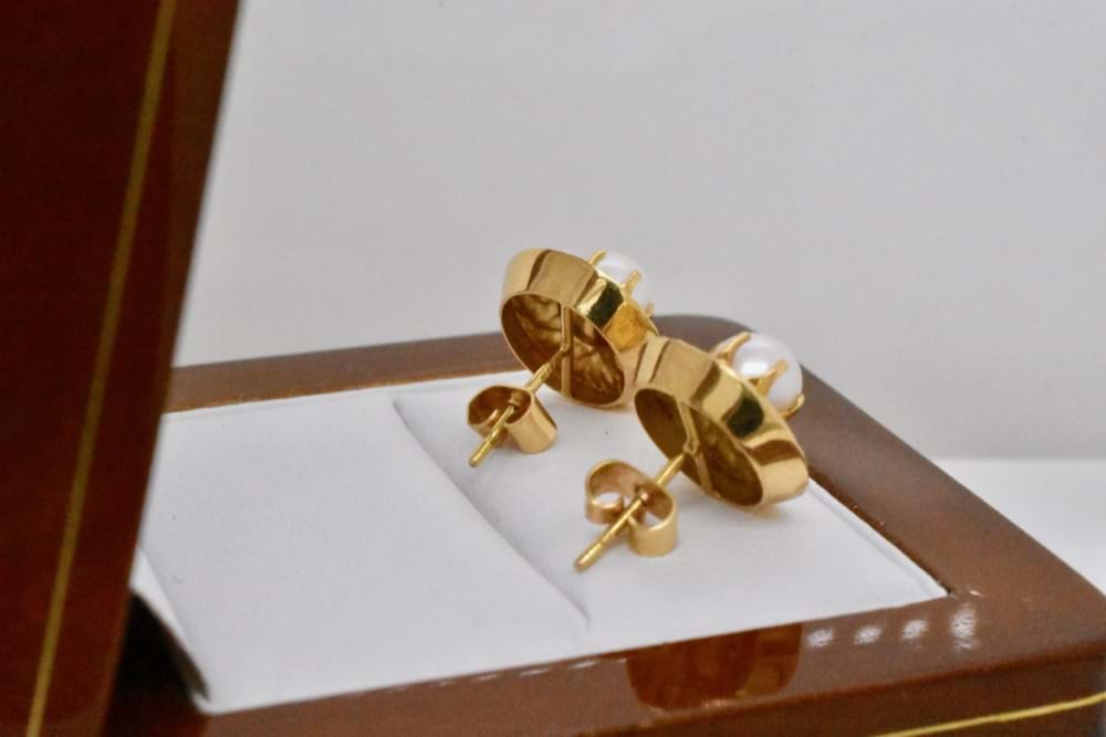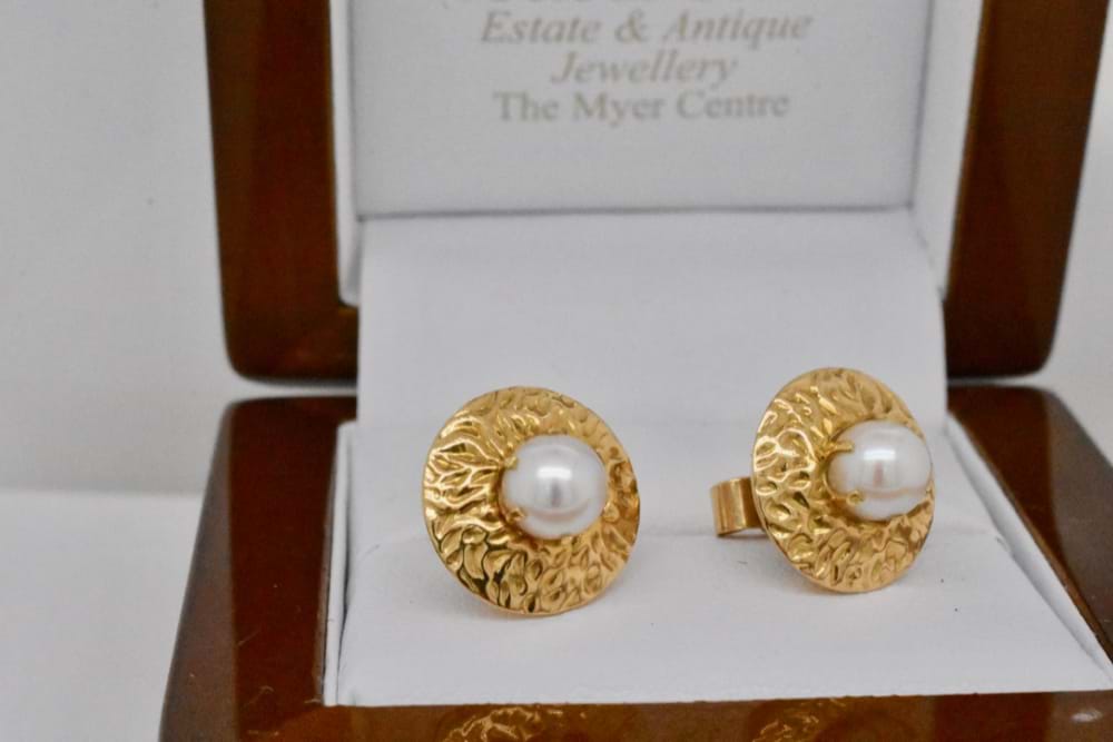 A vintage pair of 18ct yellow gold pearl studs with an etched frill style border and high quality butterfly fittings