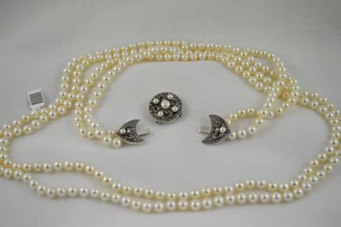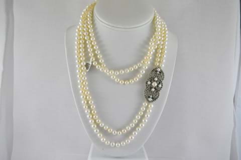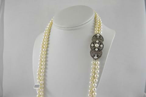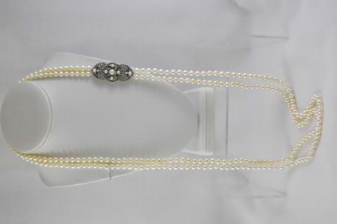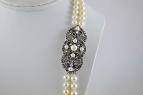 This stunning clasp has been crafted in sterling silver and is encrusted with marcasites and freshwater pearls and is the feature of a double strand of 258 white freshwater pearls. The clasp consists of three parts, the centre can be removed and worn as a brooch independently, while the two ends clip into the brooch to form a clasp. Indepedent Valuation Supplied