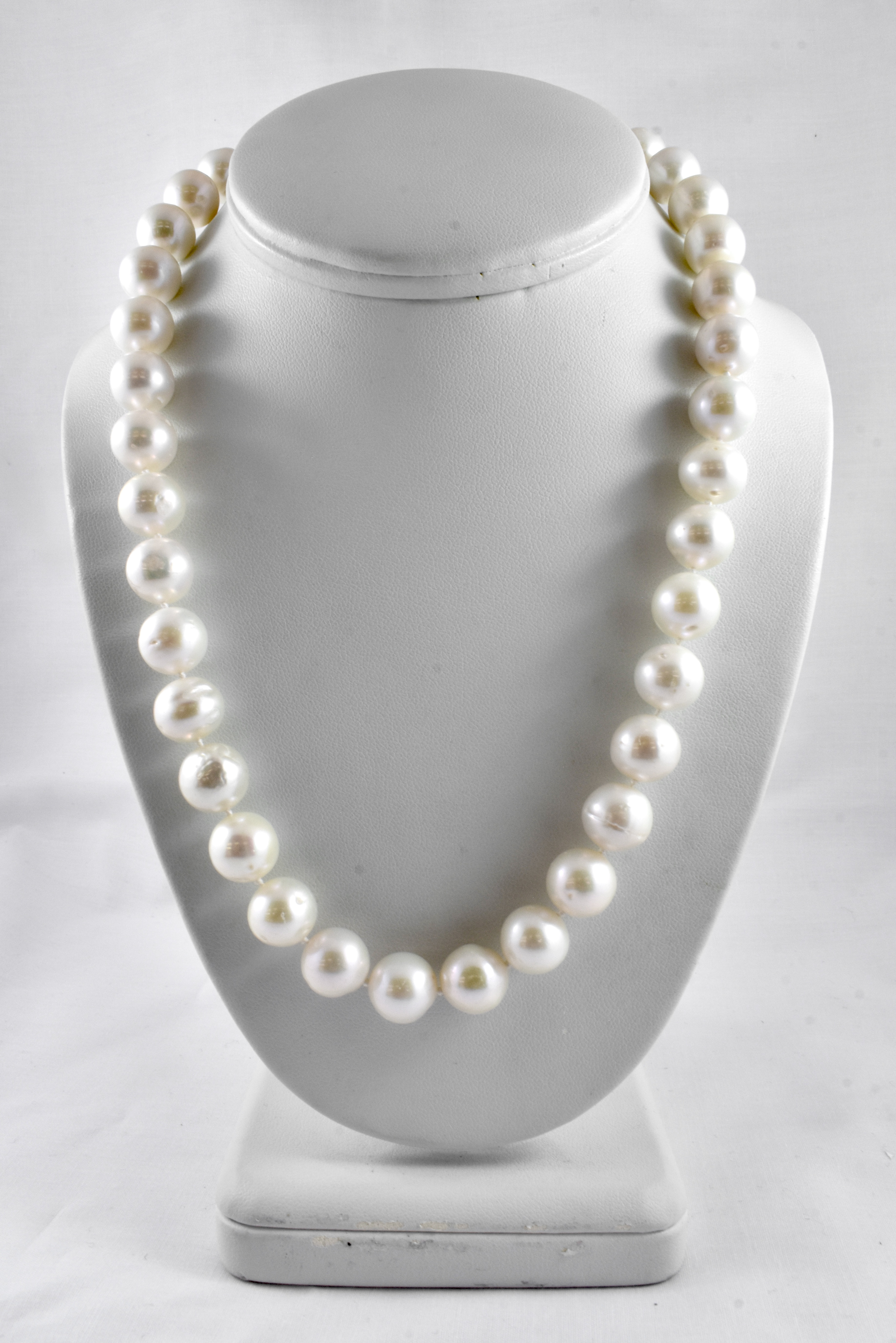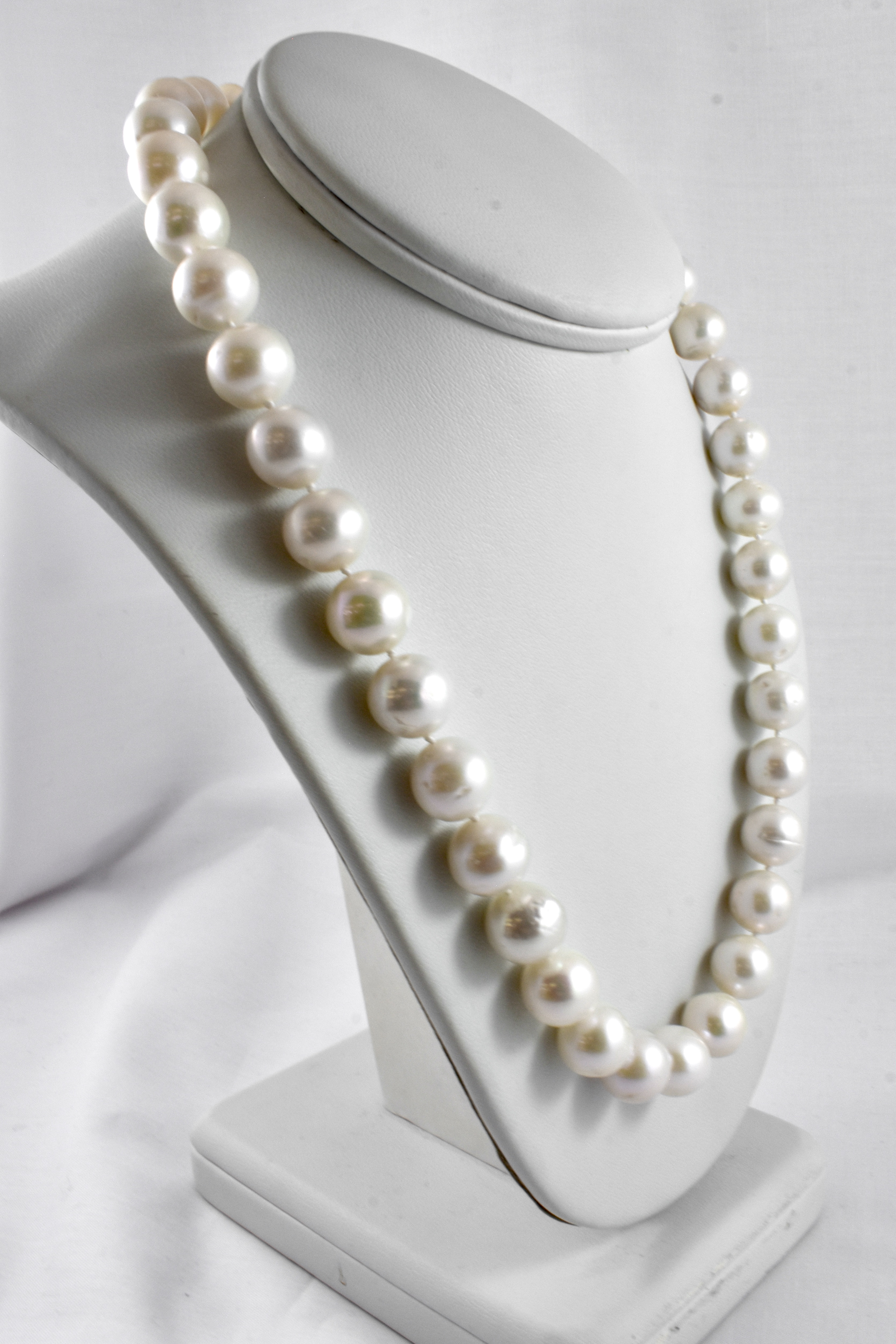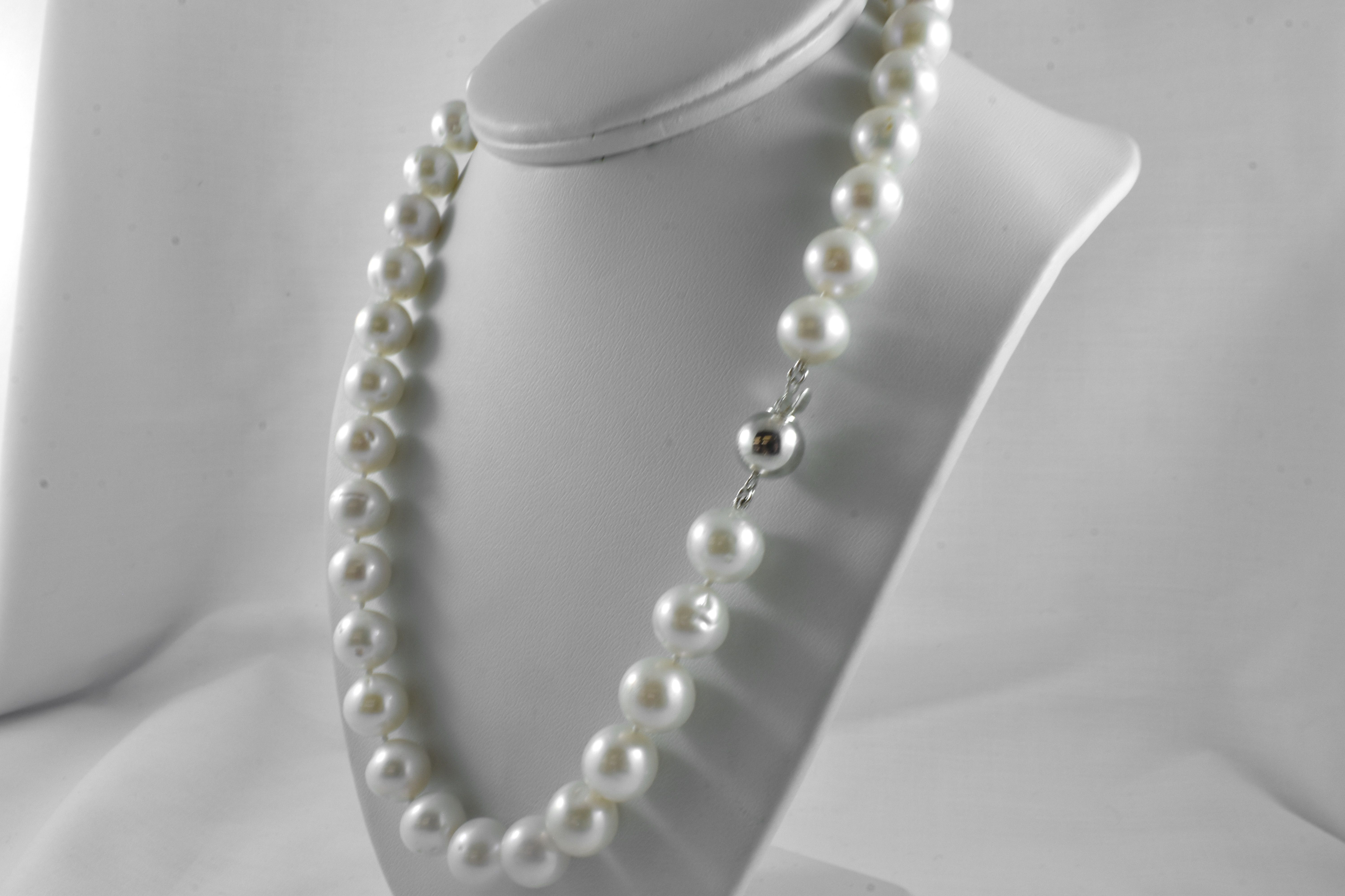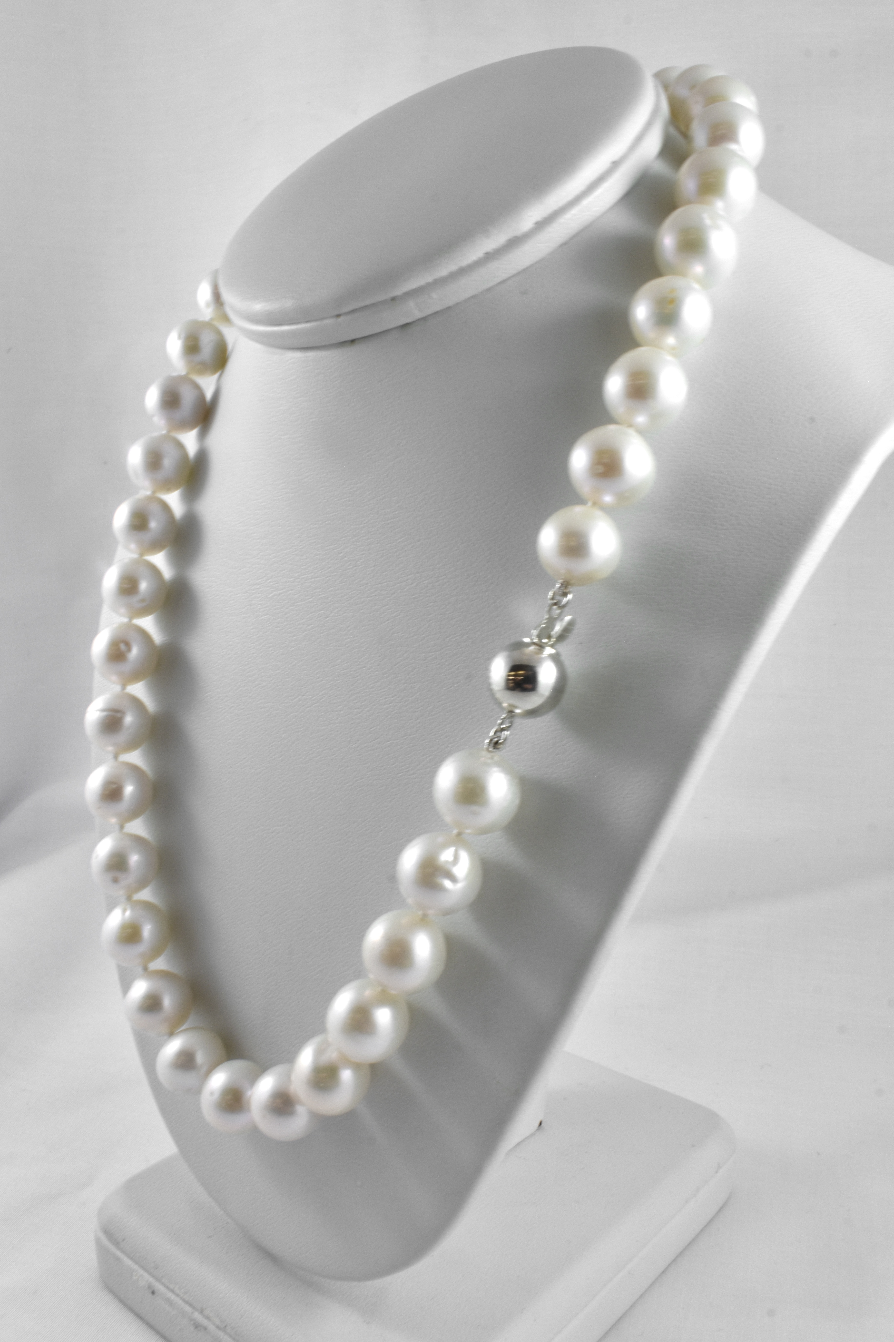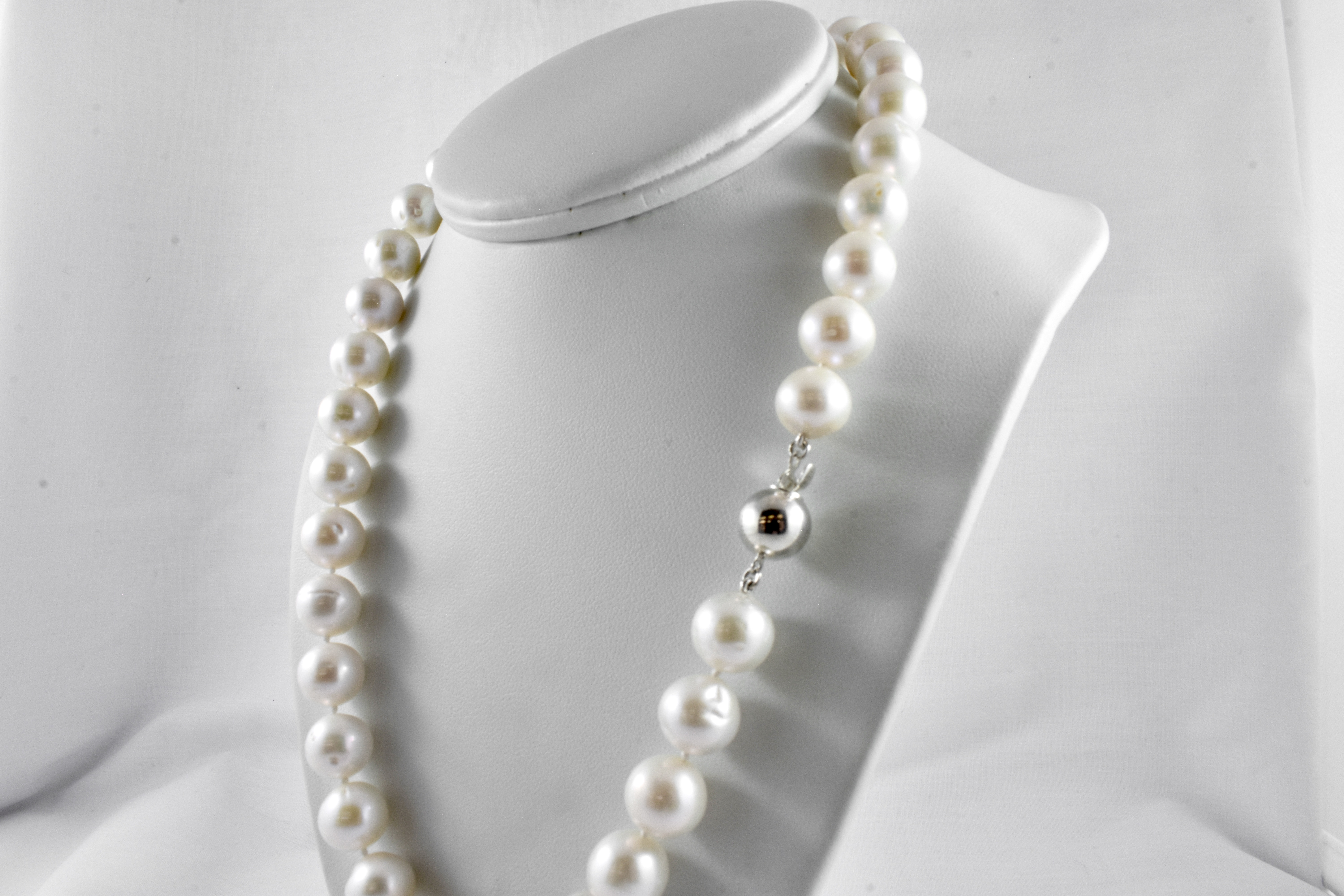 A classic strand of cream freshwater pearls measuring 10-11mm in size and near round in shape, hand knotted individually on silk with a good lustre, 45cm in length with a sterling silver polished ball clasp