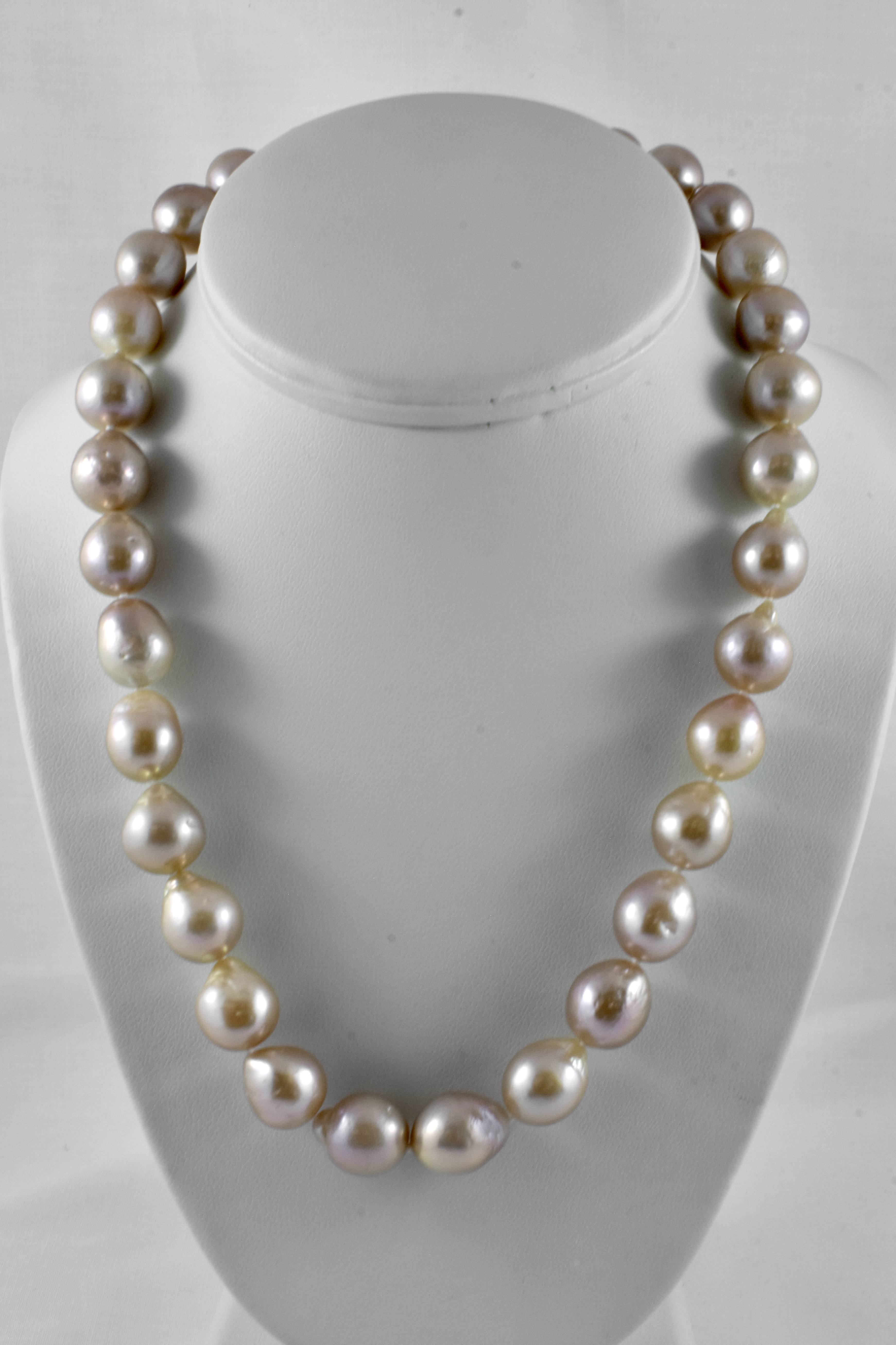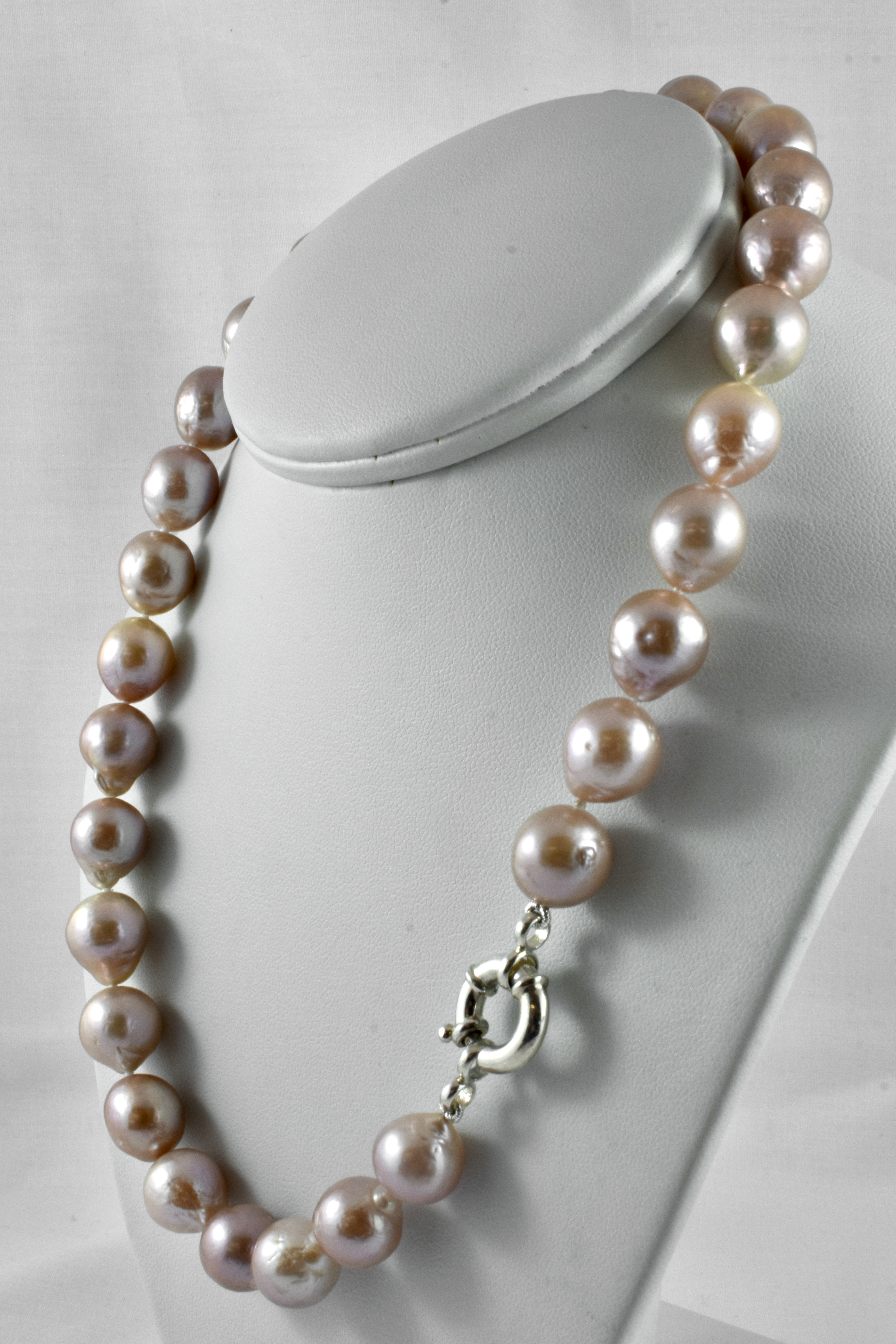 A beautiful strand of freshwater pearls in a variety of pink, purple, peach and champagne hues, near round to baroque in shape and measuring 11-12mm, hand knotted individually on silk and finished with a versatile sterling silver bolt ring clasp. Strand measures 45cm long