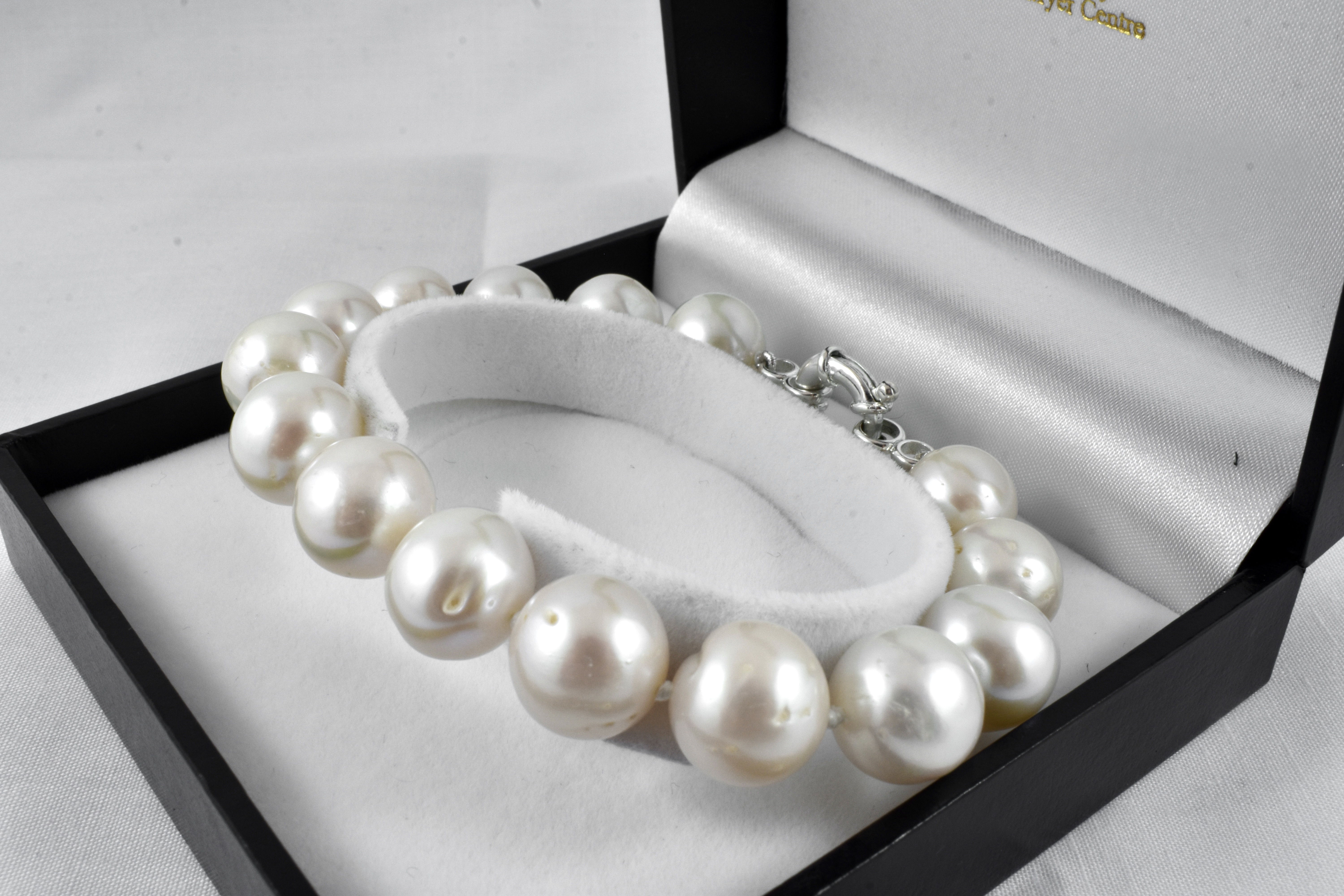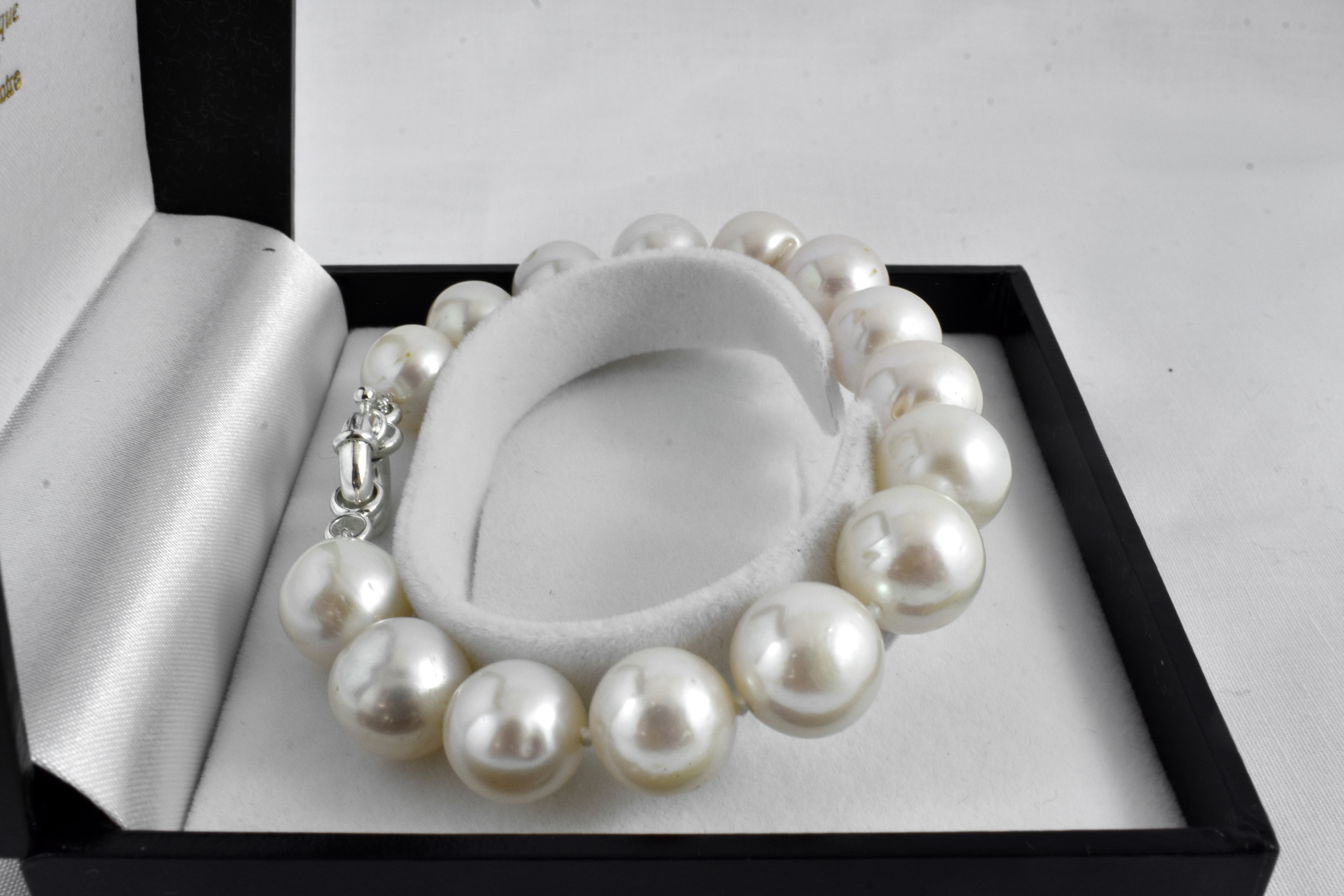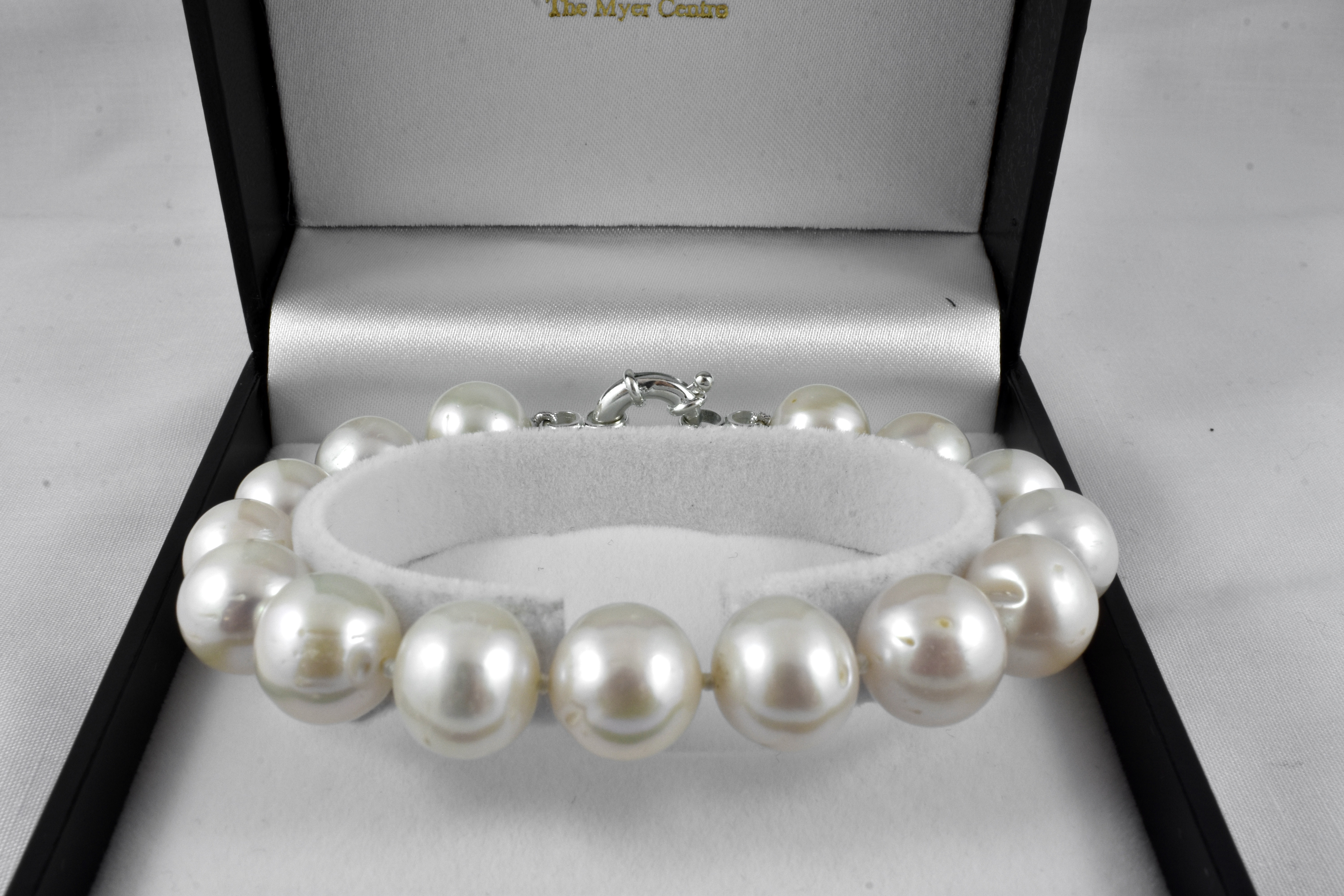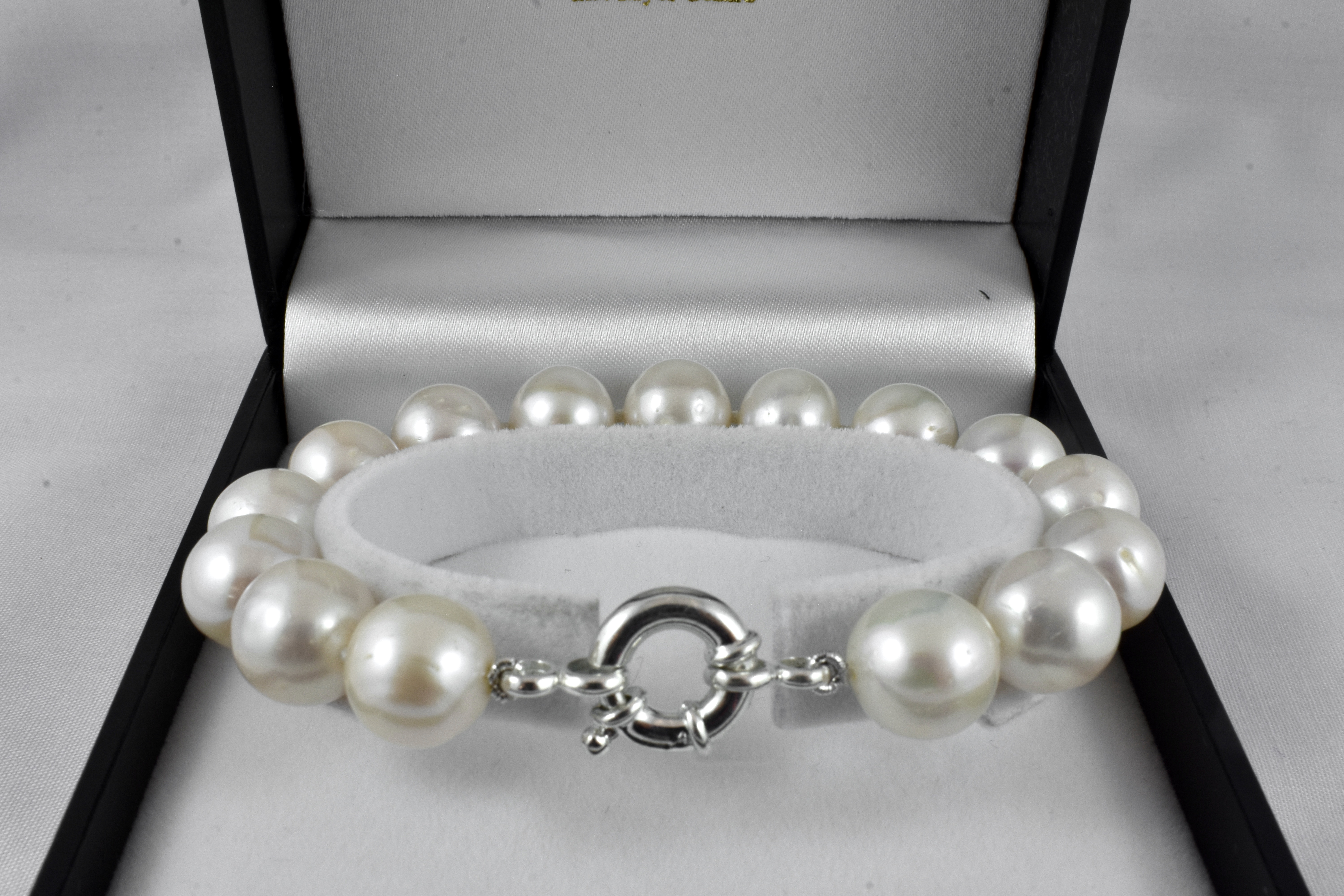 A classic pearl bracelet, with 11-12mm near round white freshwater pearls with a good lustre, individually hand knotted on silk and finished with a sterling silver bolt ring clasp. Bracelet is 20.5cm long