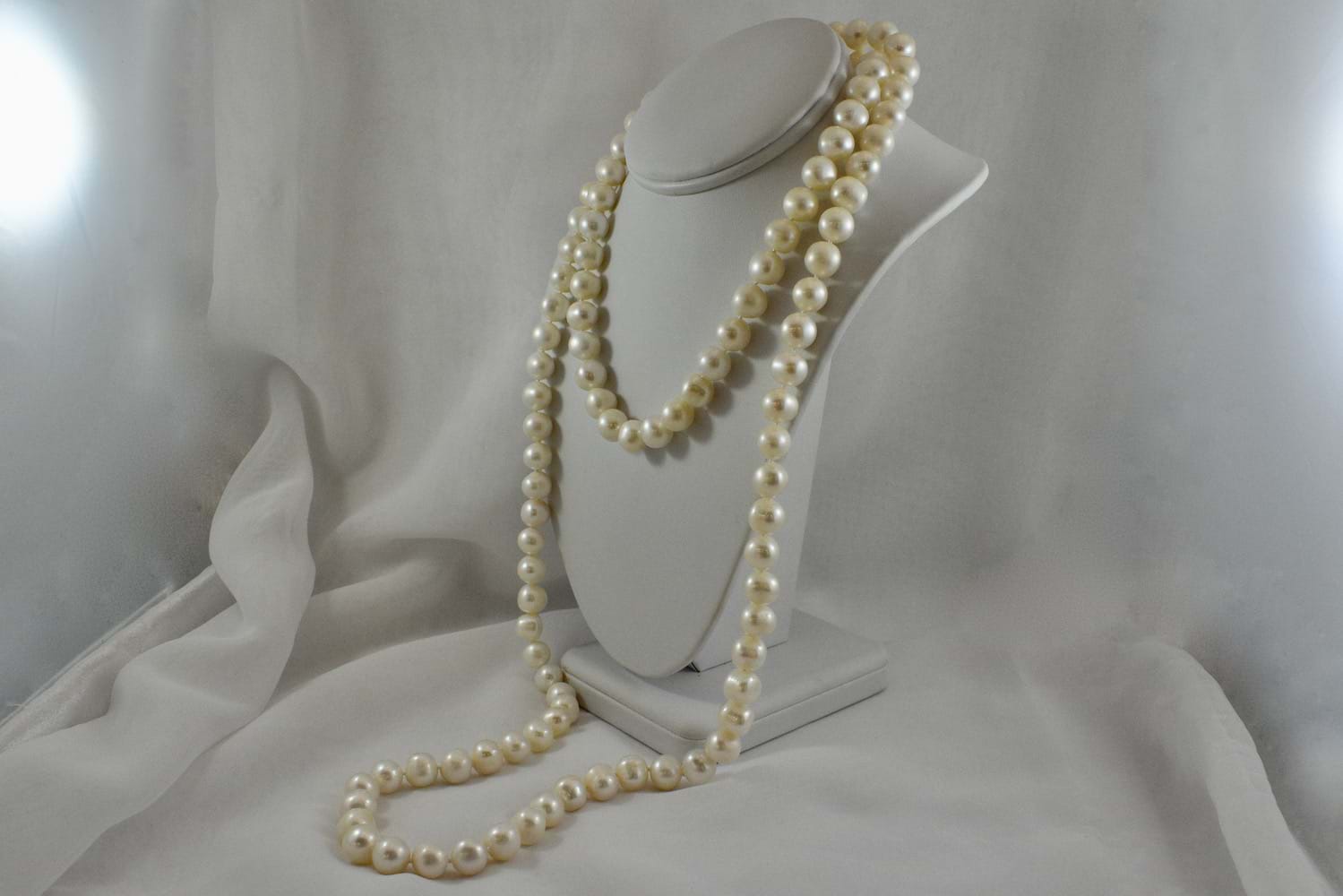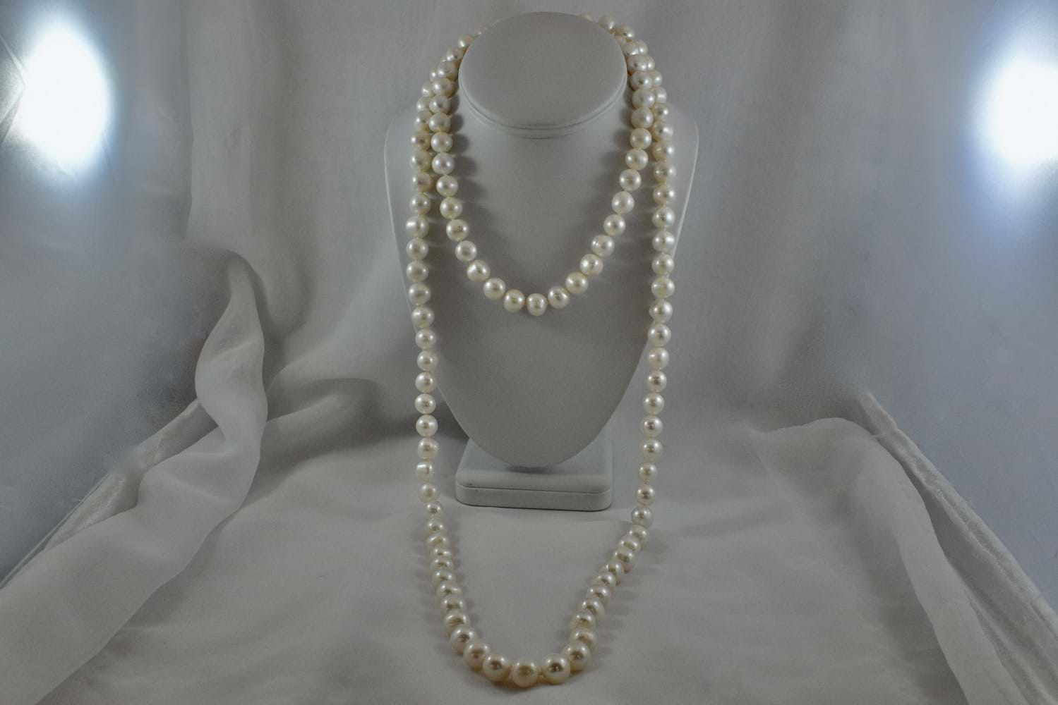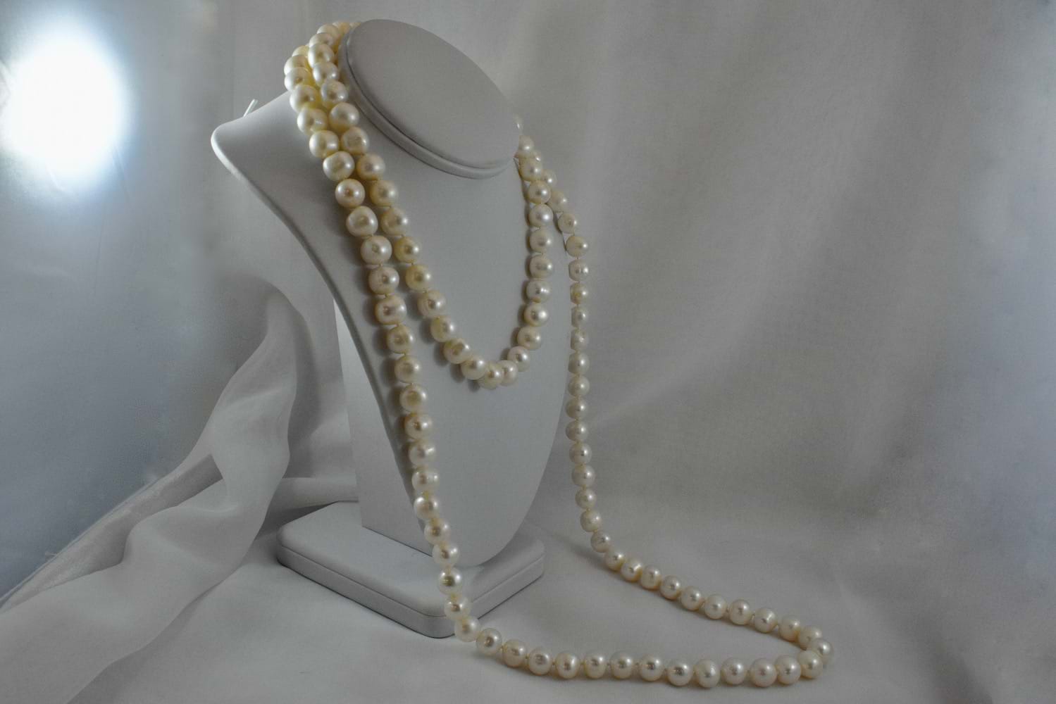 A strand of 9-10mm freshwater pearls measuring 120cm allowing the wearing to mix up the way in which it's worn