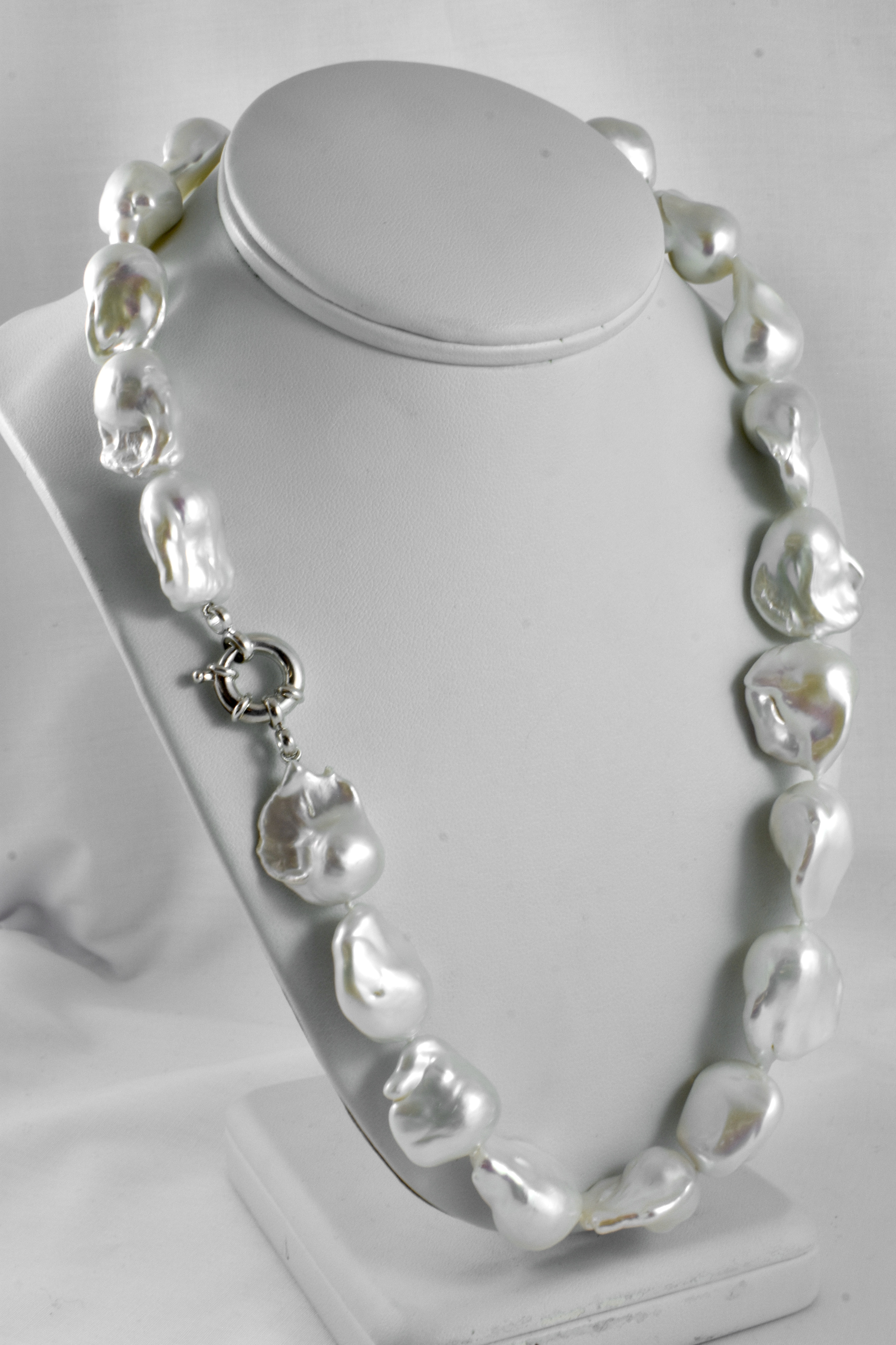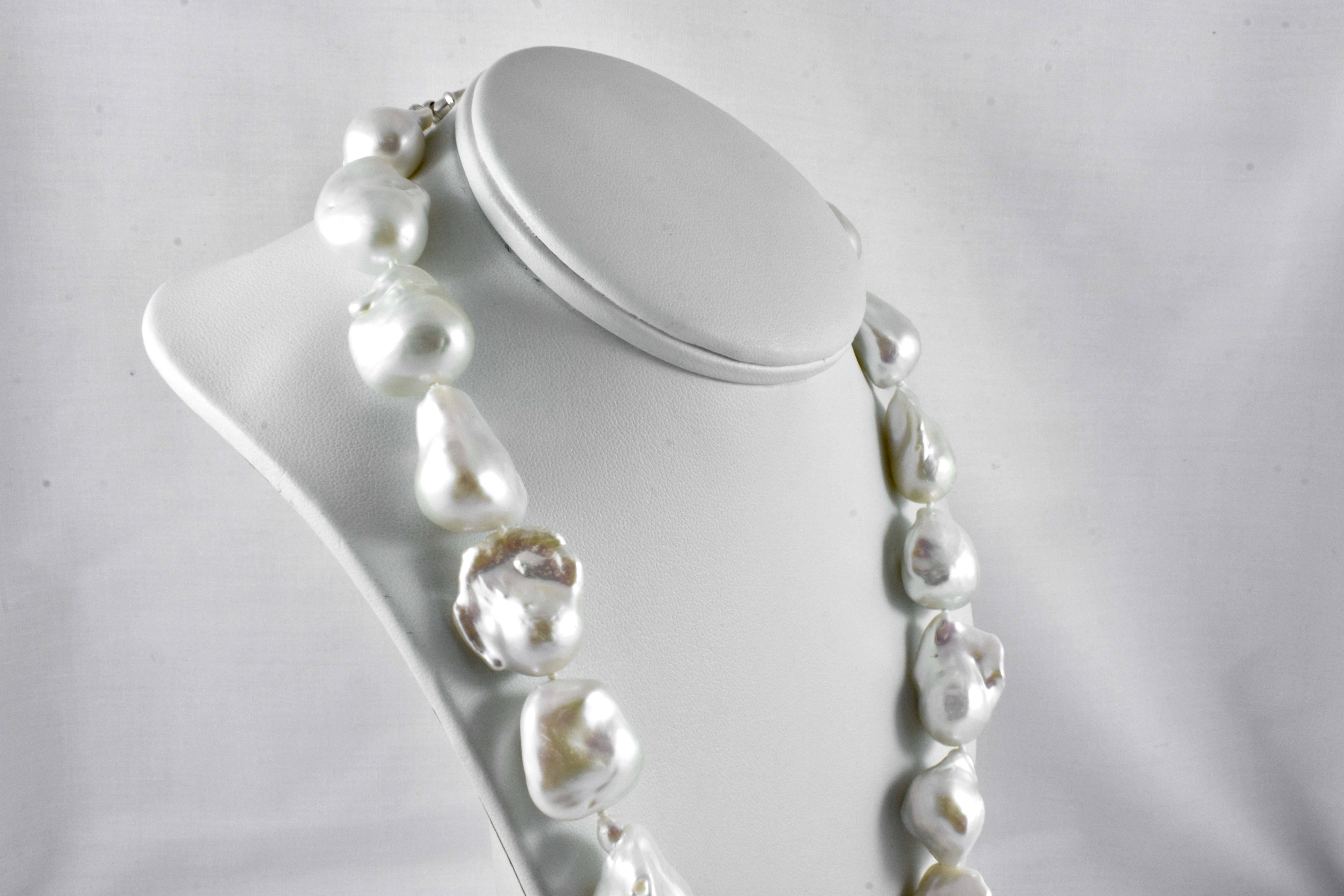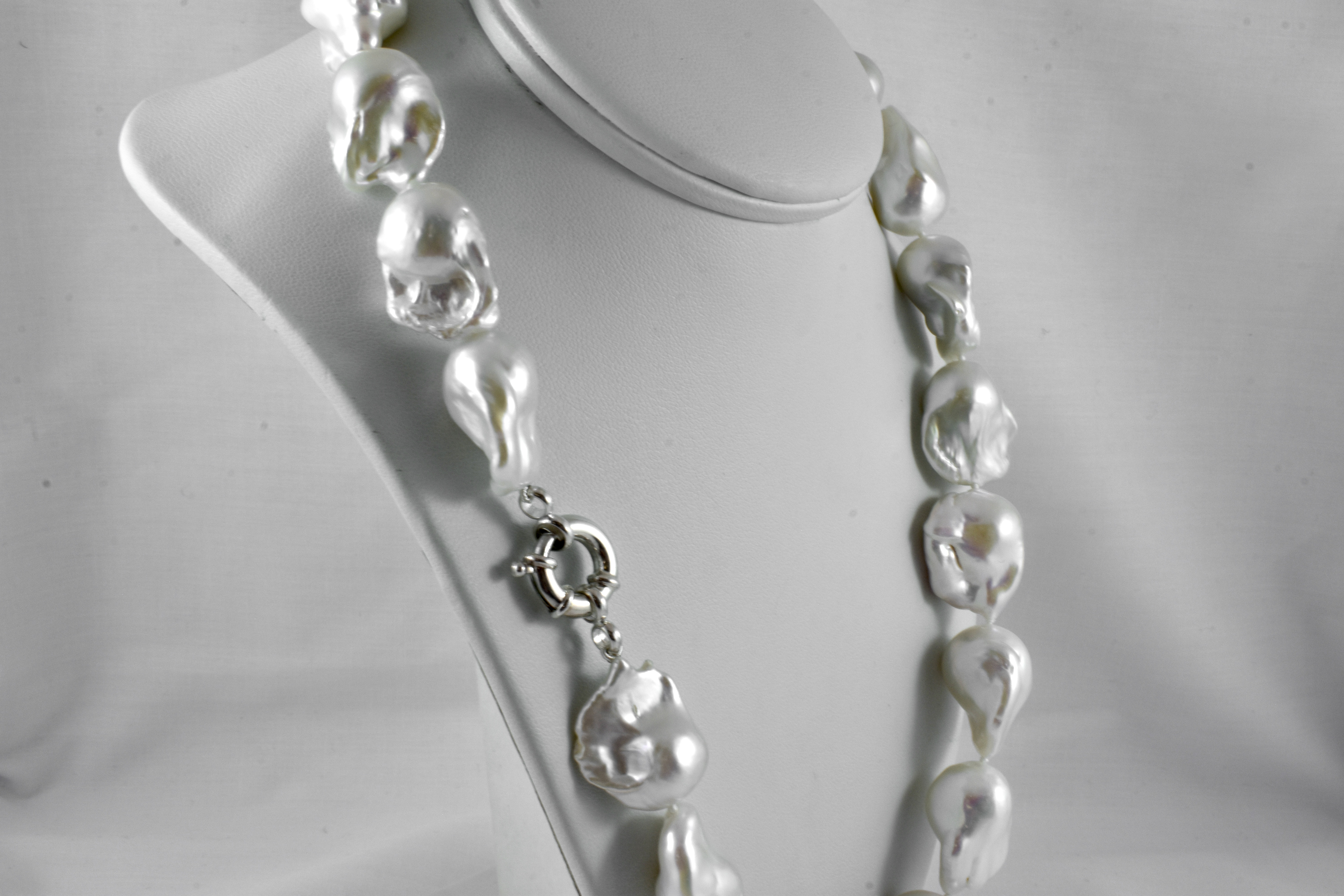 This stunning strand of baroque, white freshwater pearls measure between 14-17mm with a good lustre, individually hand knotted on silk and measuring 52cm long with a sterling silver bolt ring clasp
