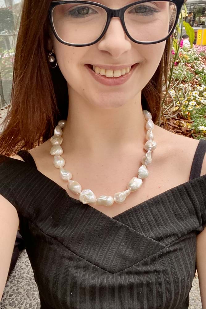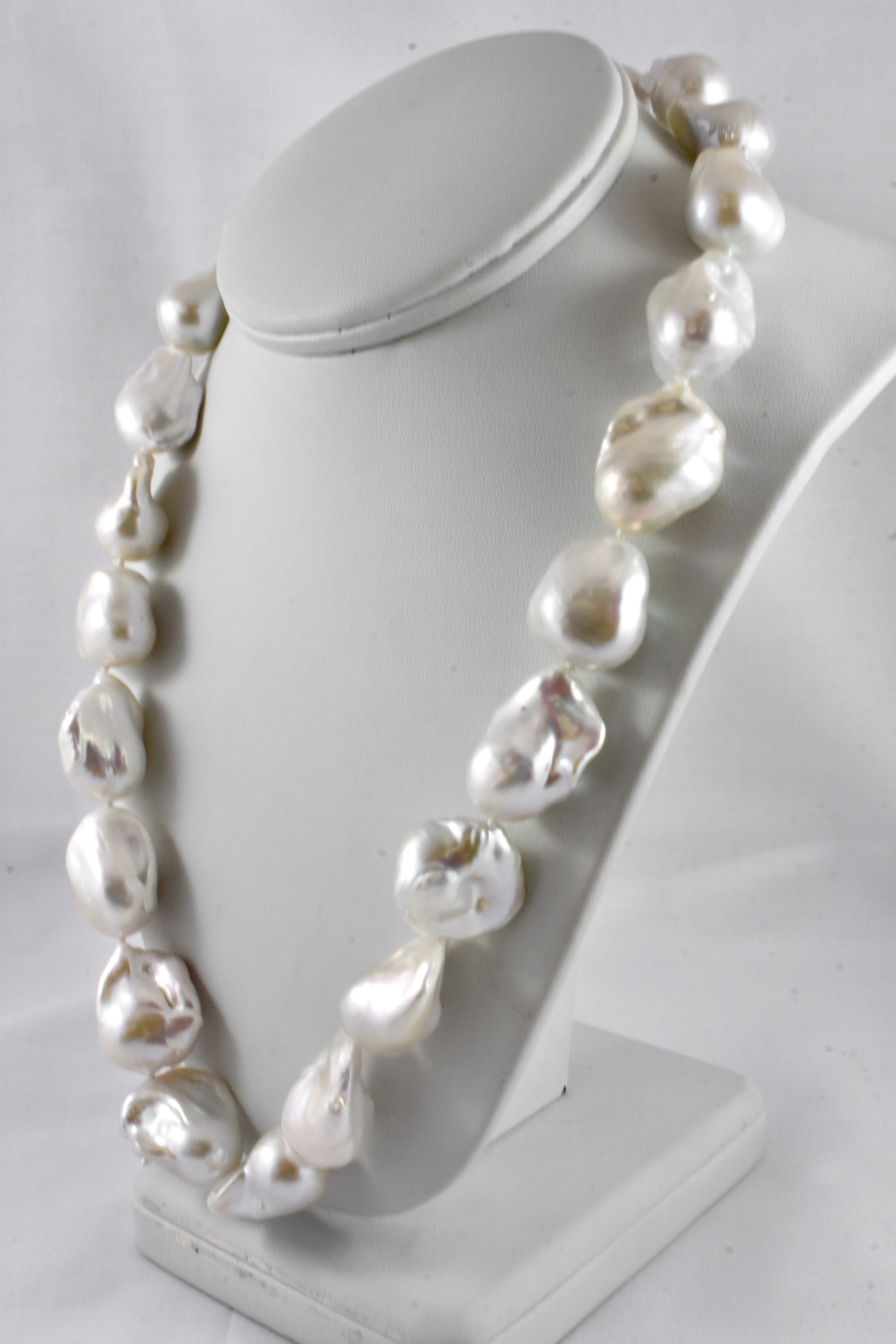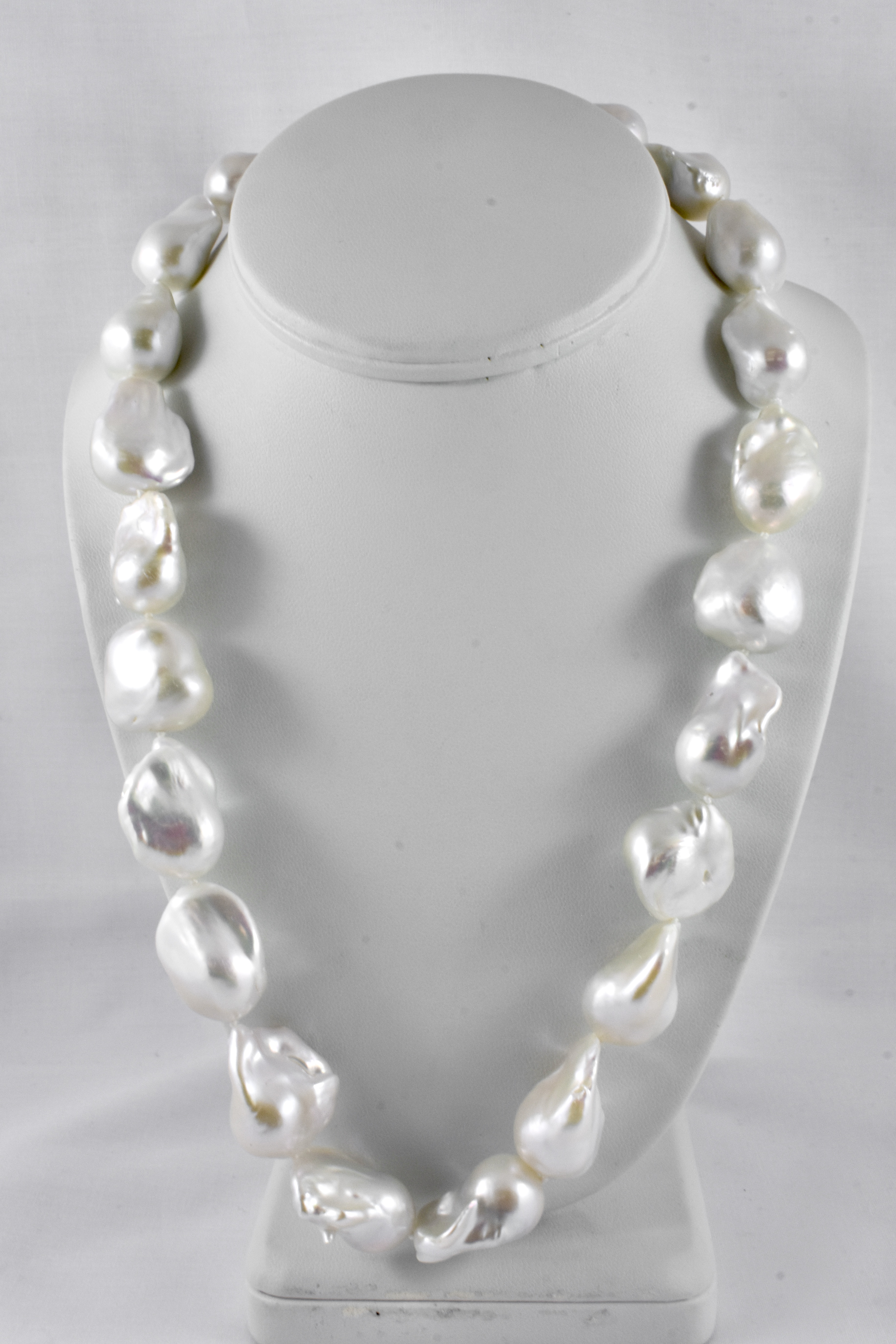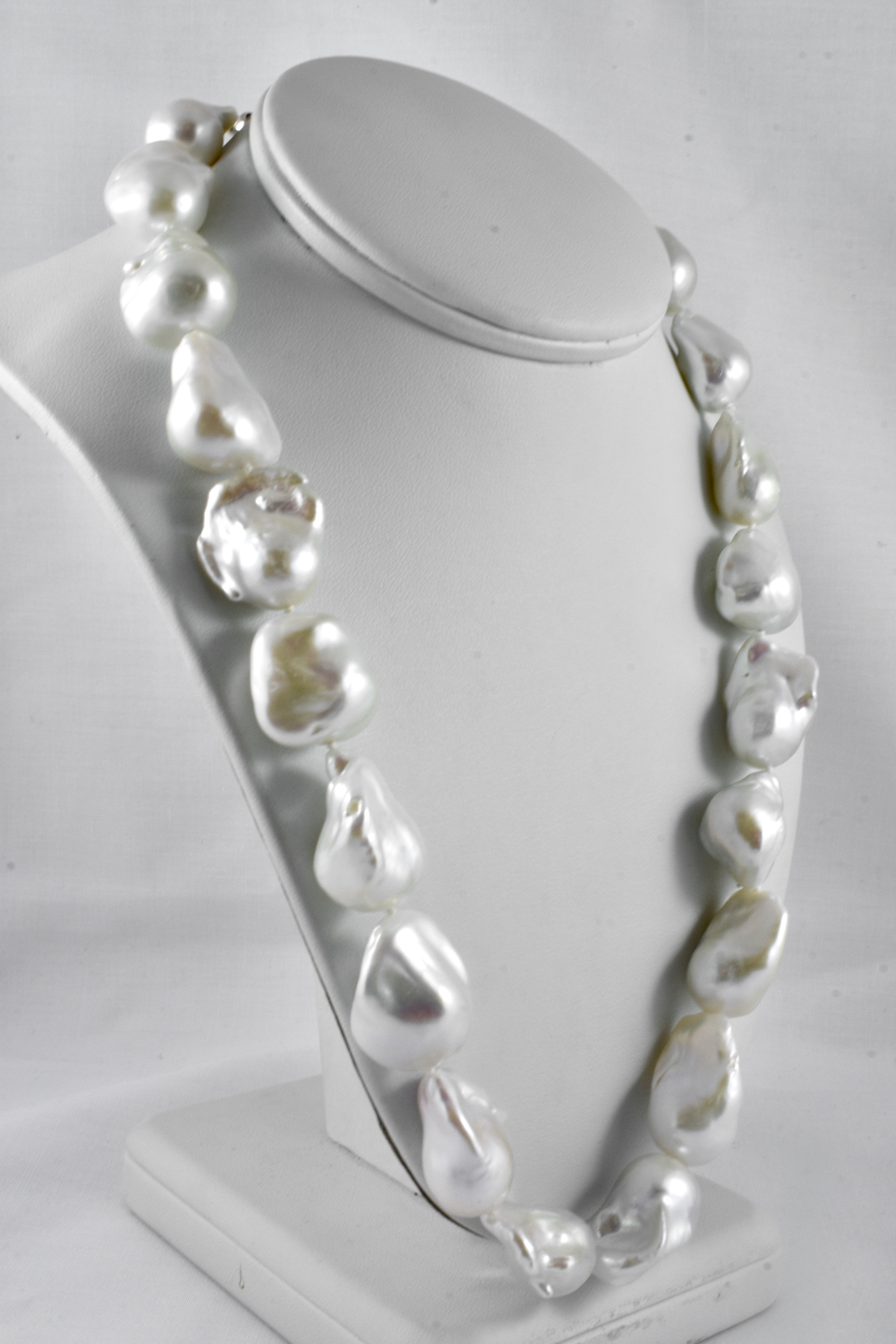 This stunning strand of baroque, white freshwater pearls measure between 14-17mm with a good lustre, individually hand knotted on silk and measuring 52cm long with a sterling silver bolt ring clasp