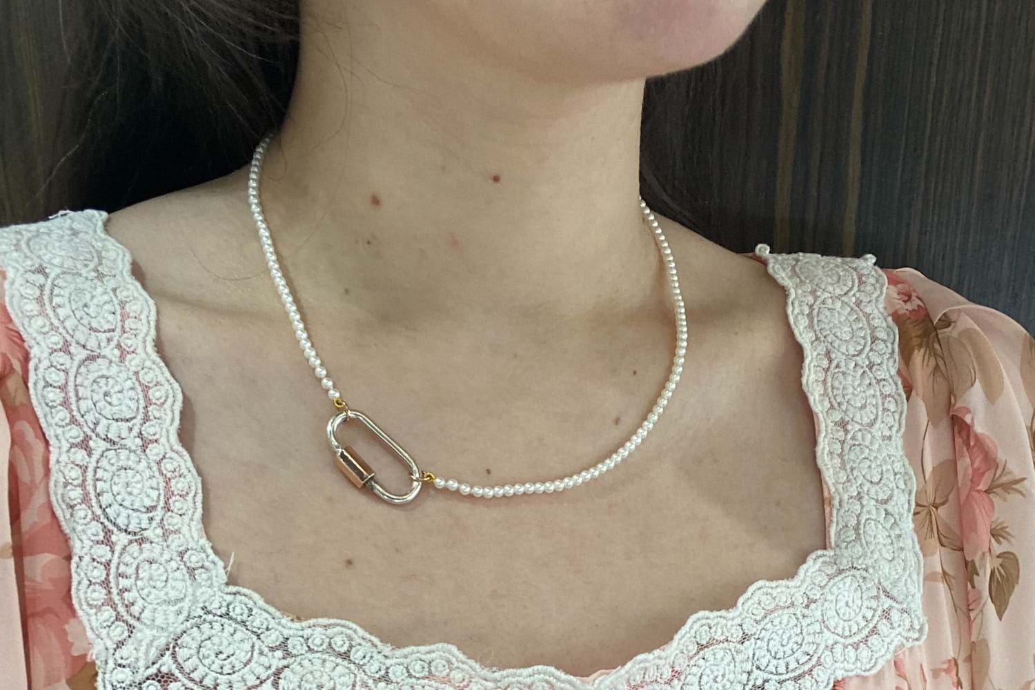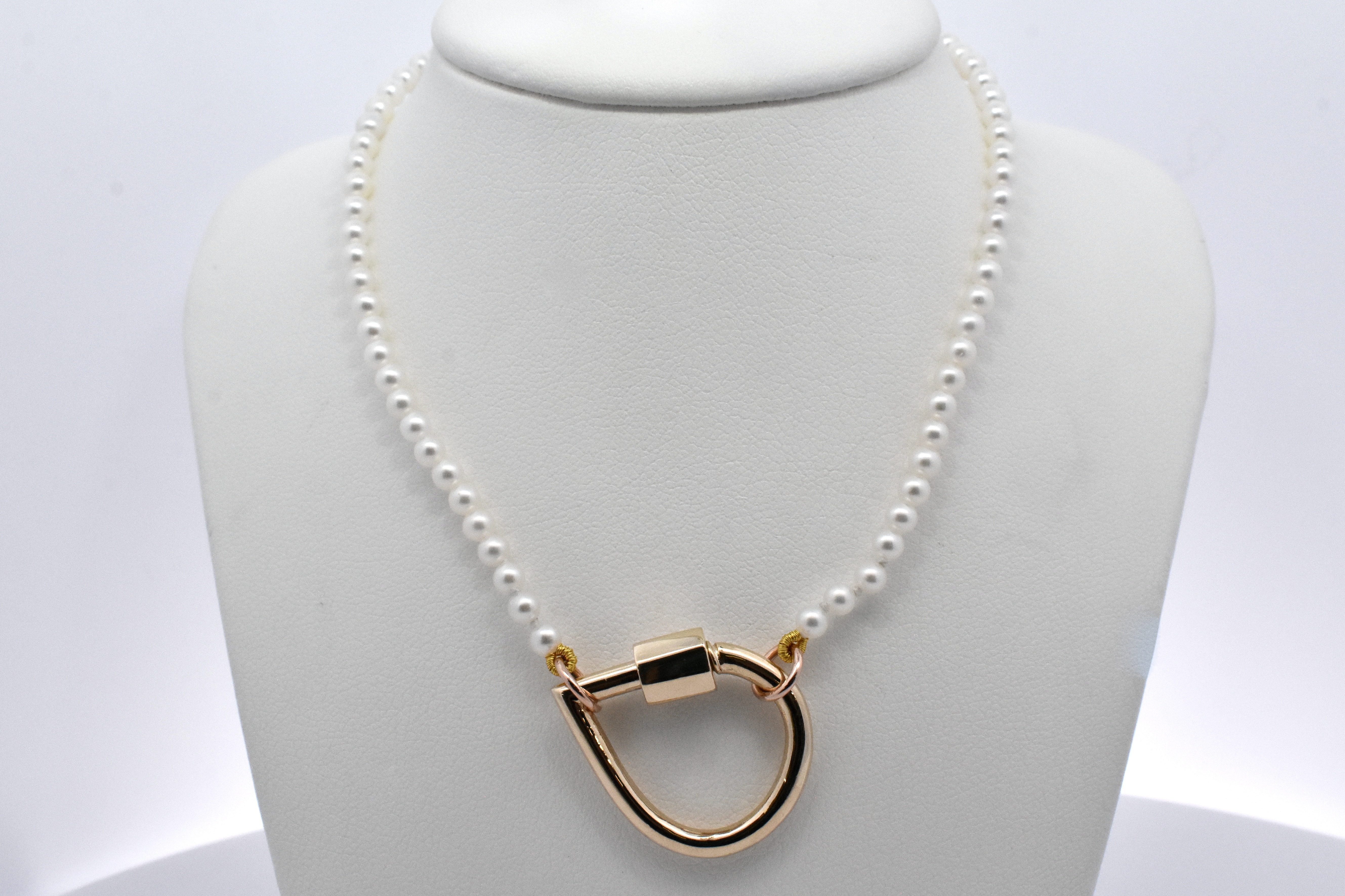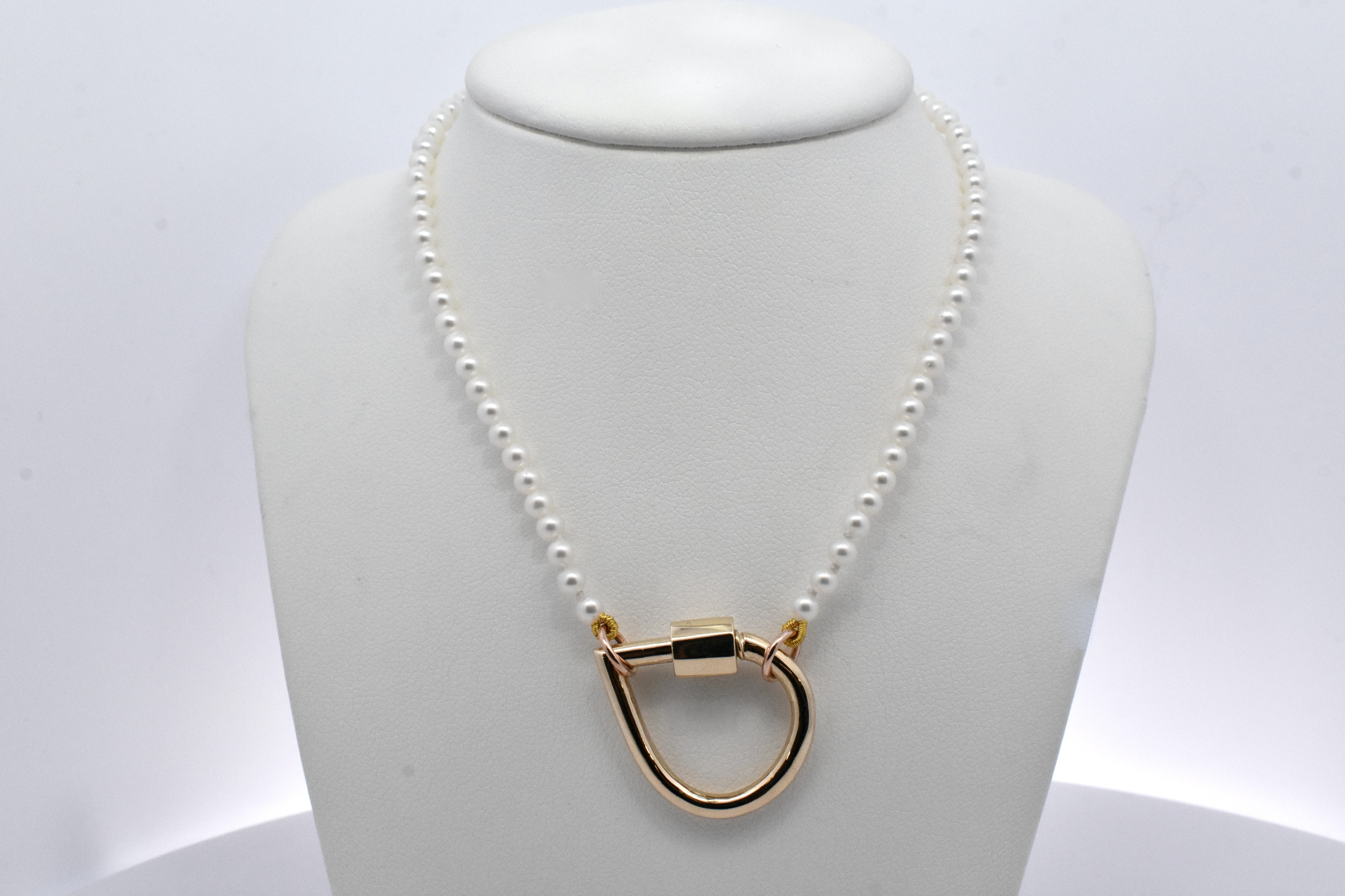 A classic but contemporary concept, this strand of 3-3.5mm white seed pearls have been strung with two 9ct rose gold jump ring ends, especially designed to be worn with a matching rose gold or contrasting carabiner. Strand is 41cm long