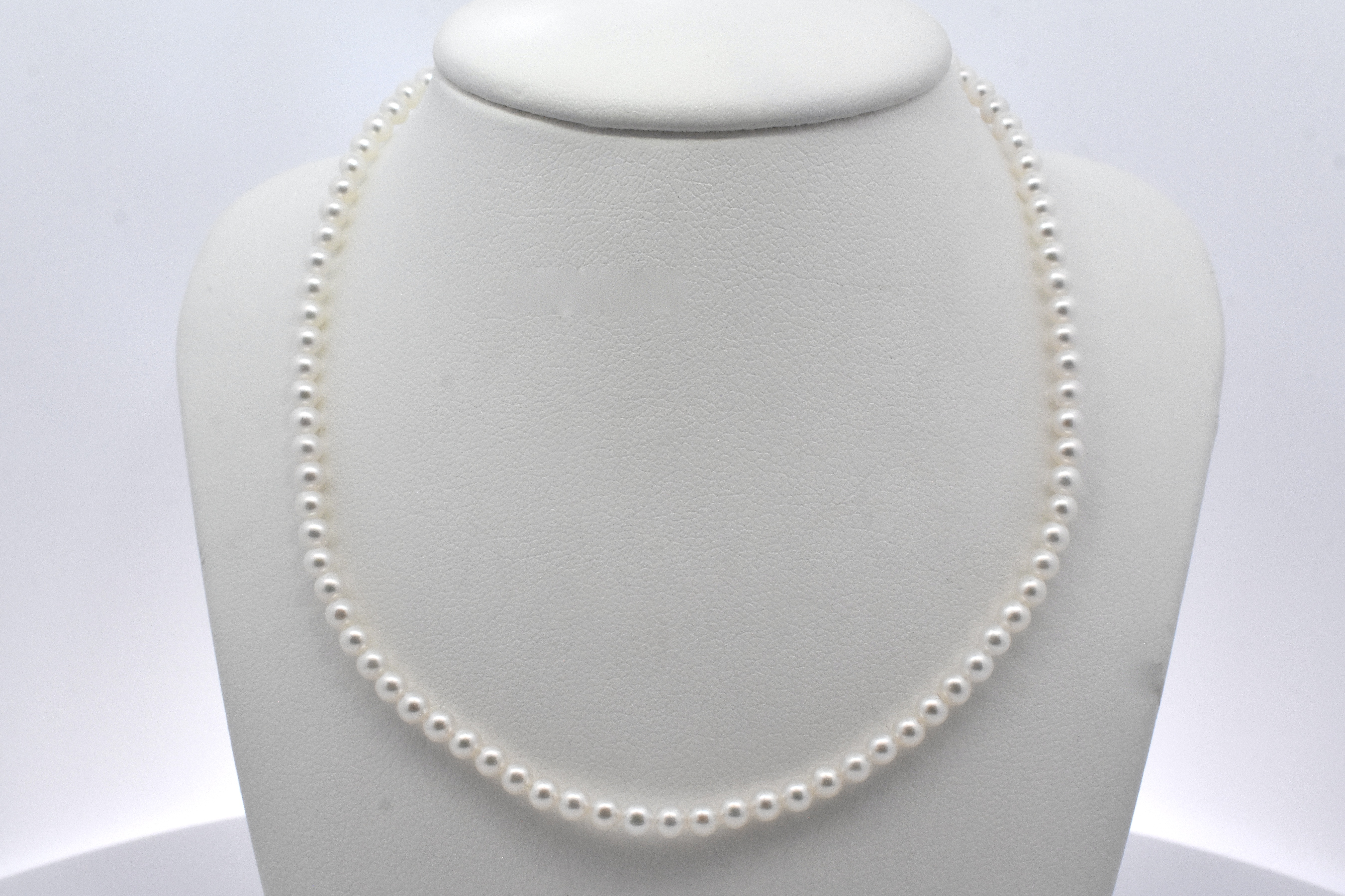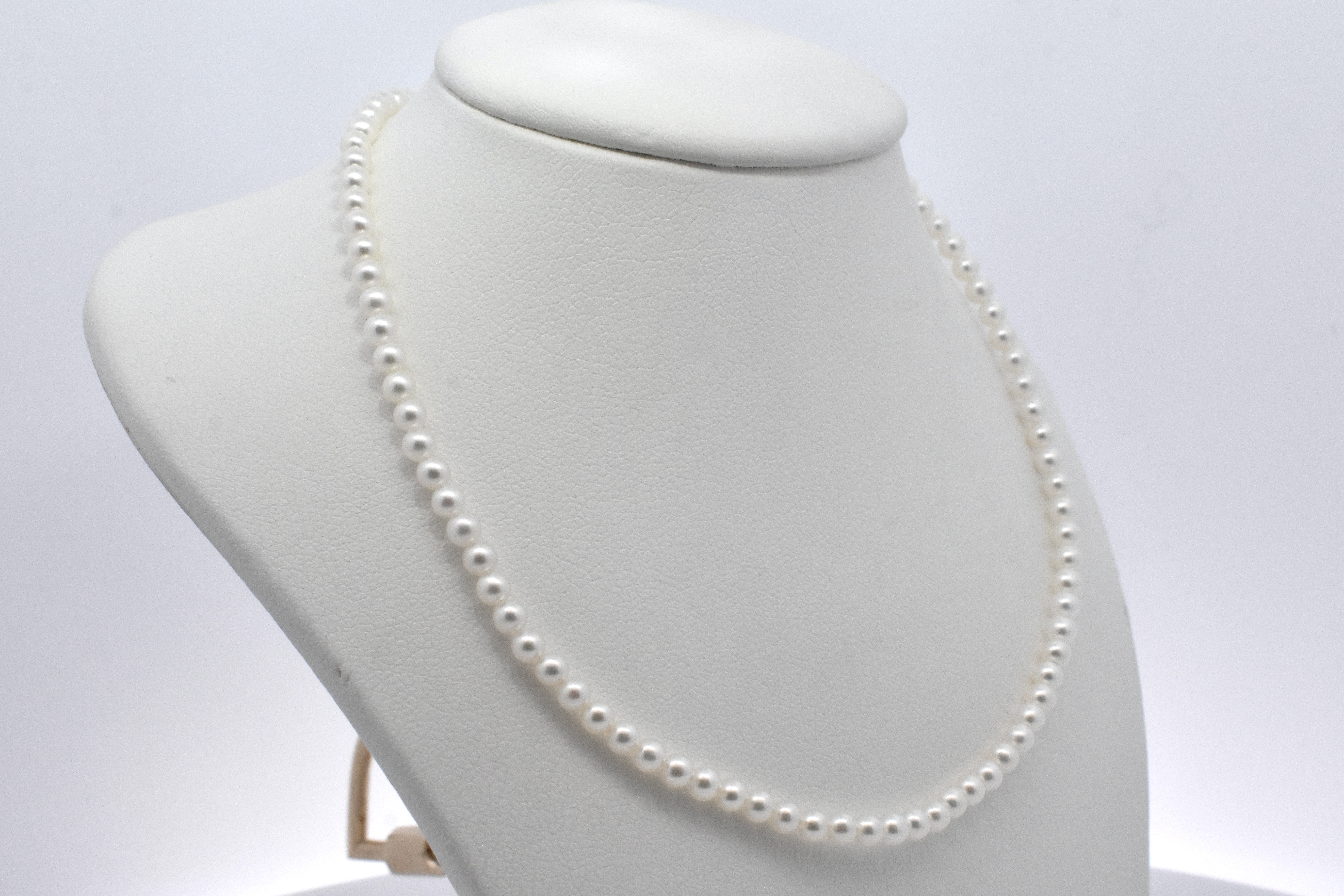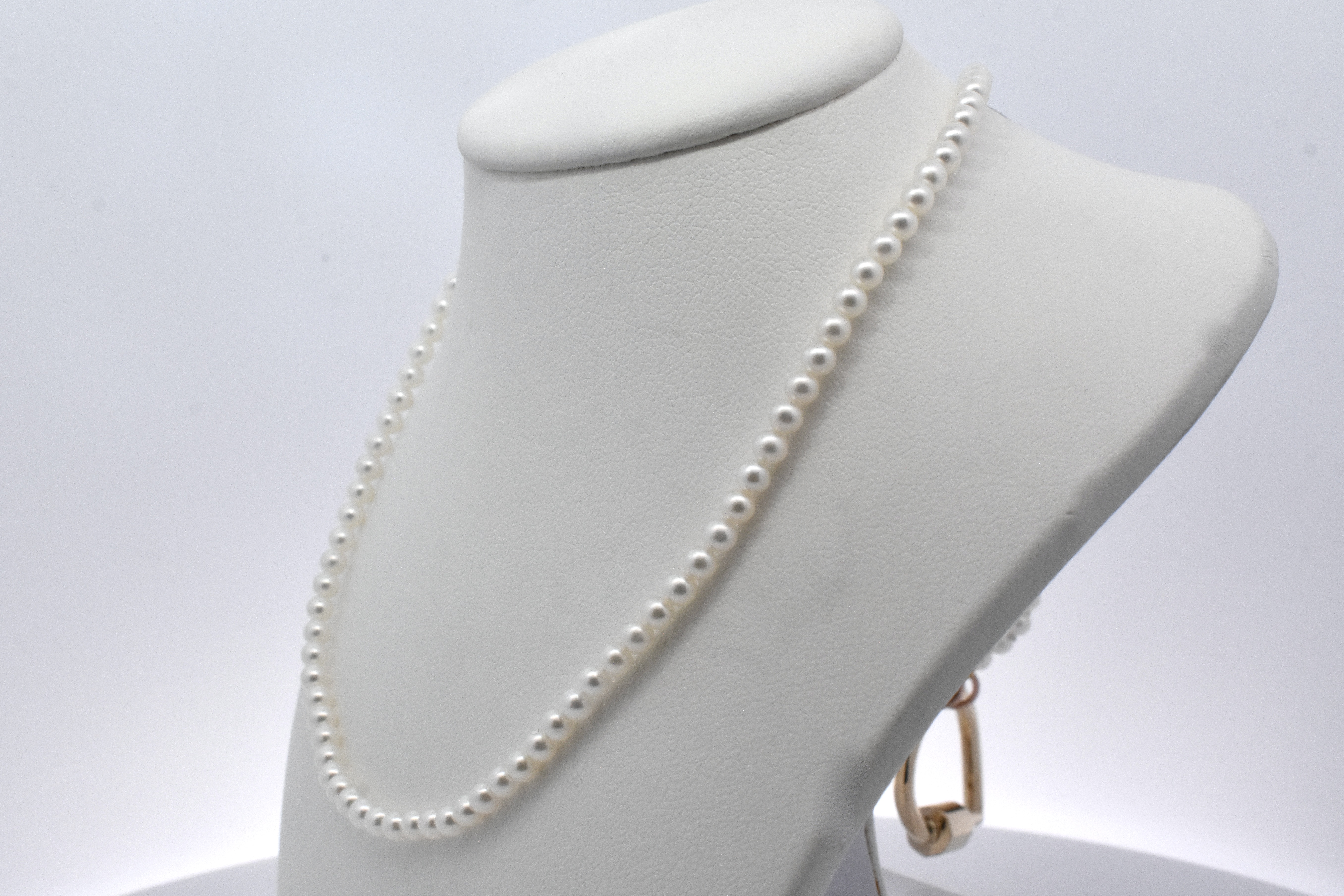 A classic but contemporary concept, this strand of 3-3.5mm white seed pearls have been strung with two 9ct rose gold jump ring ends, especially designed to be worn with a matching rose gold or contrasting carabiner. Strand is 41cm long