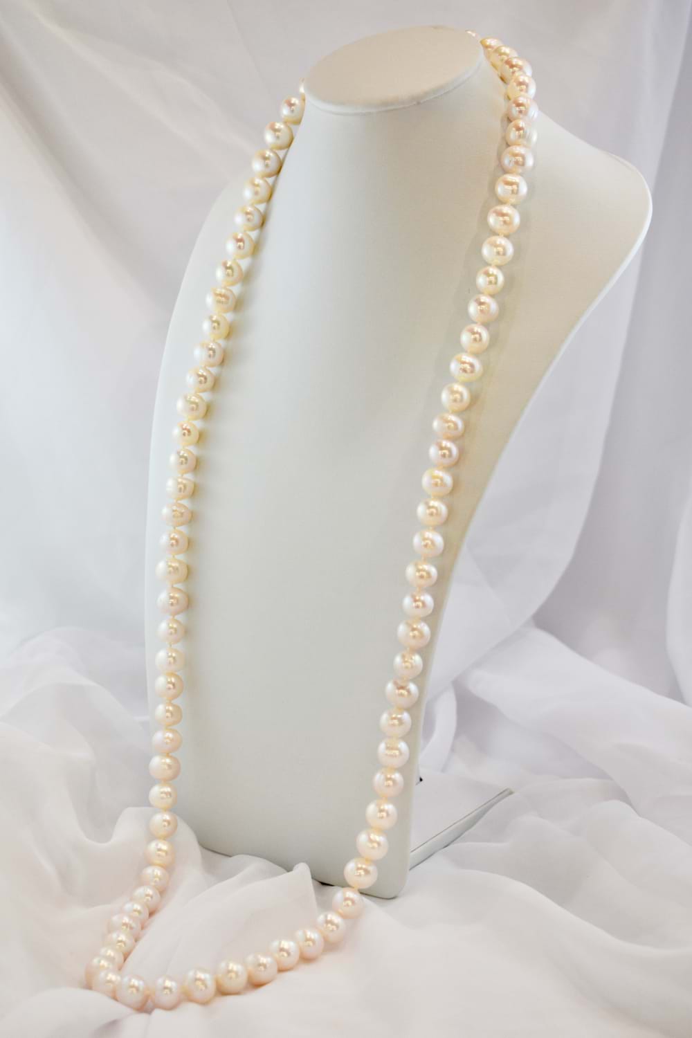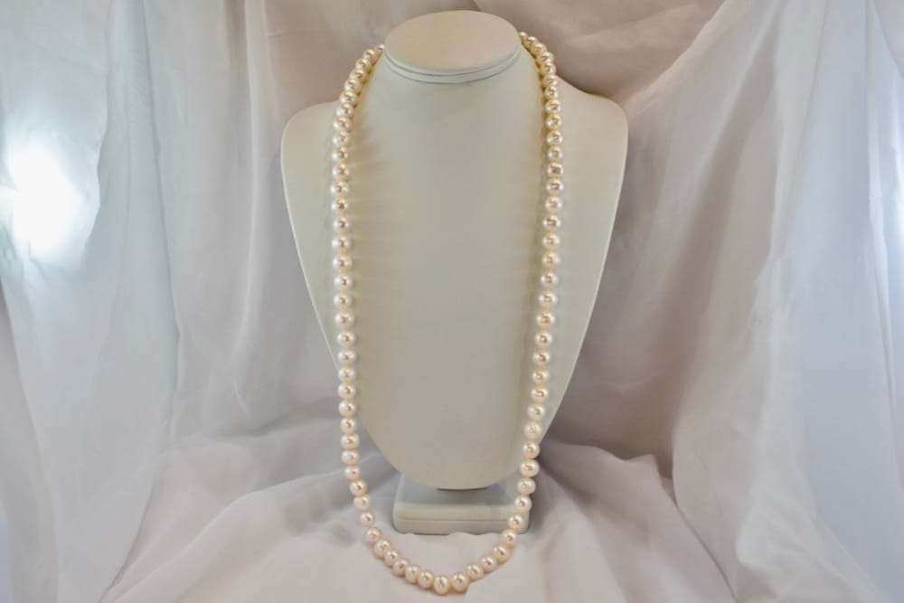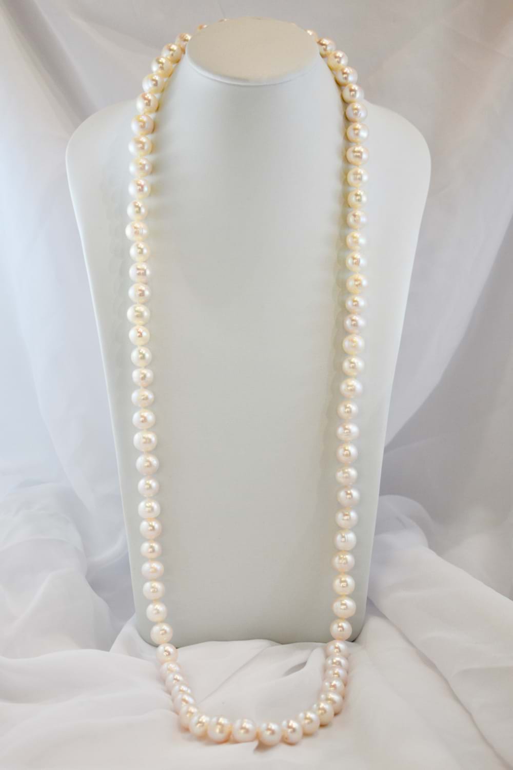 This long strand of freshwater pearls measuring 9.5-10.5mm semi-round is 32" long and has no clasp. A great strand to dress up any outfit