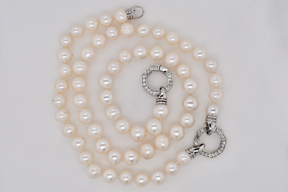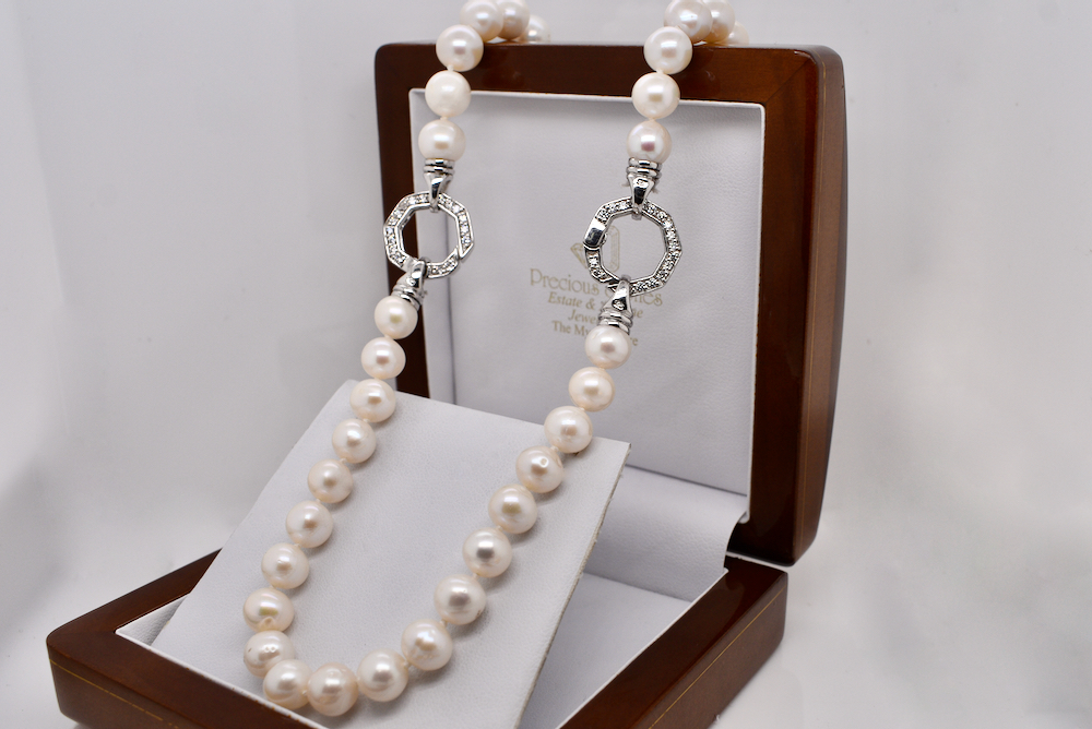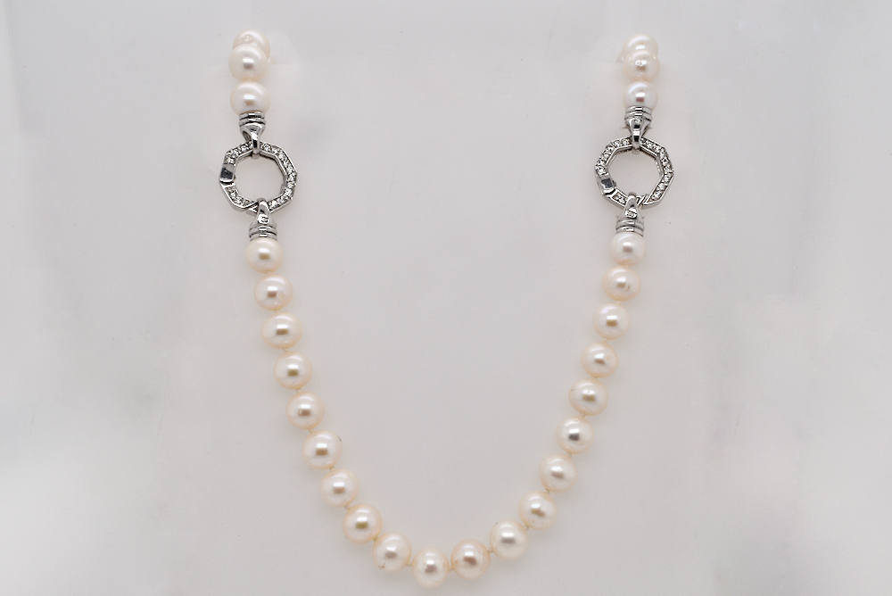 A freshwater pearl necklet measuring 7.5-8mm with two sterling silver cubic zirconia hexagon clasps measuring 54cm