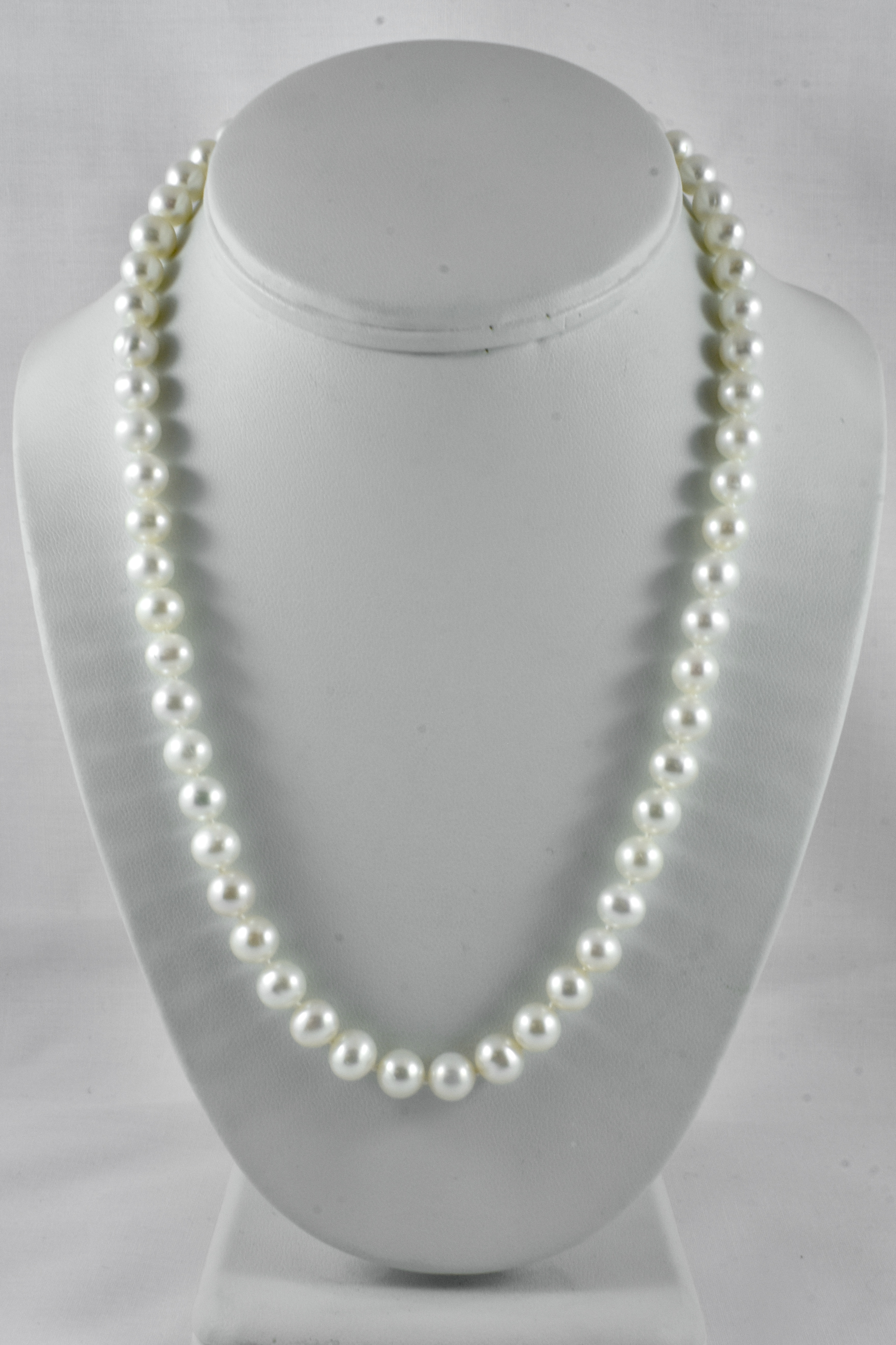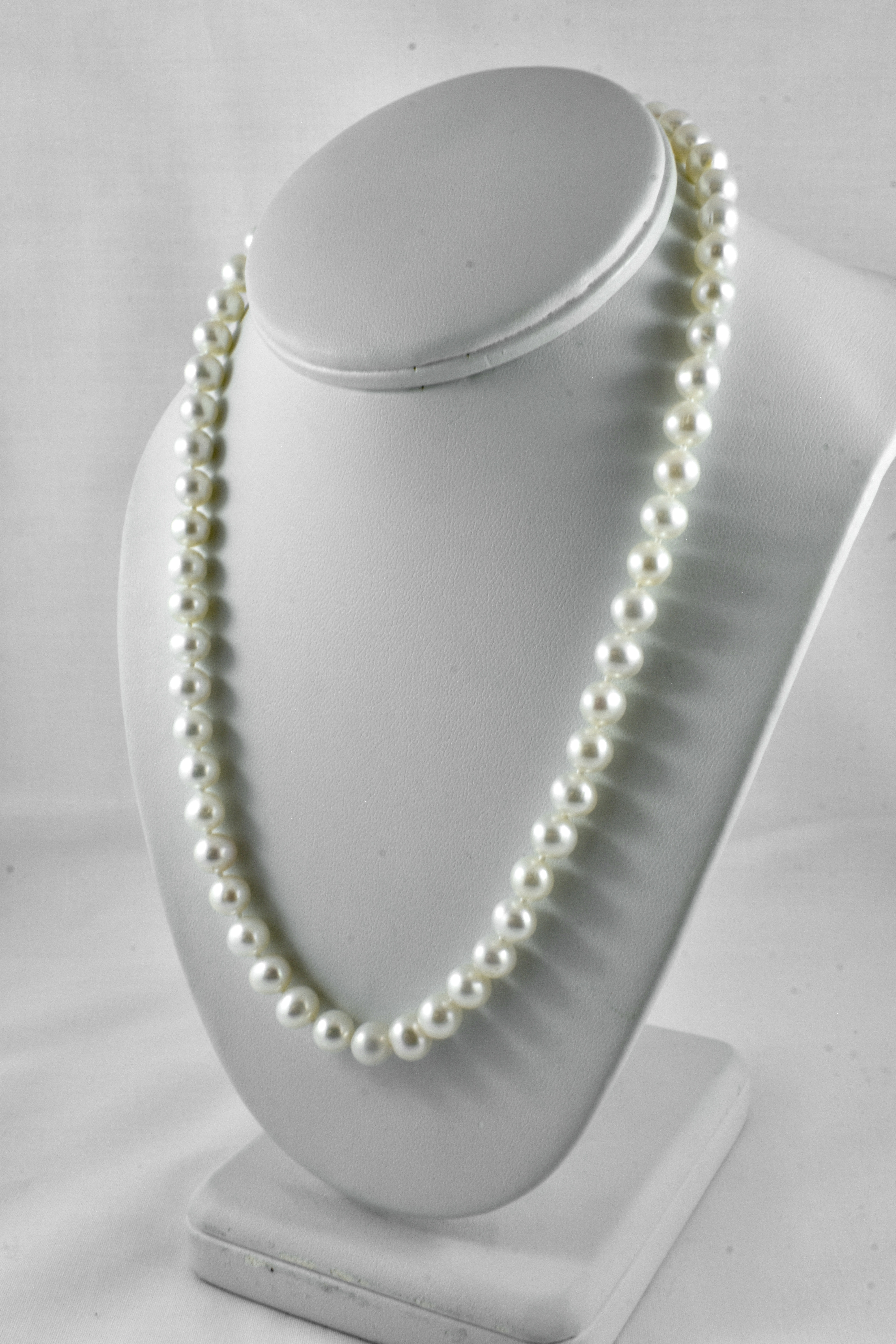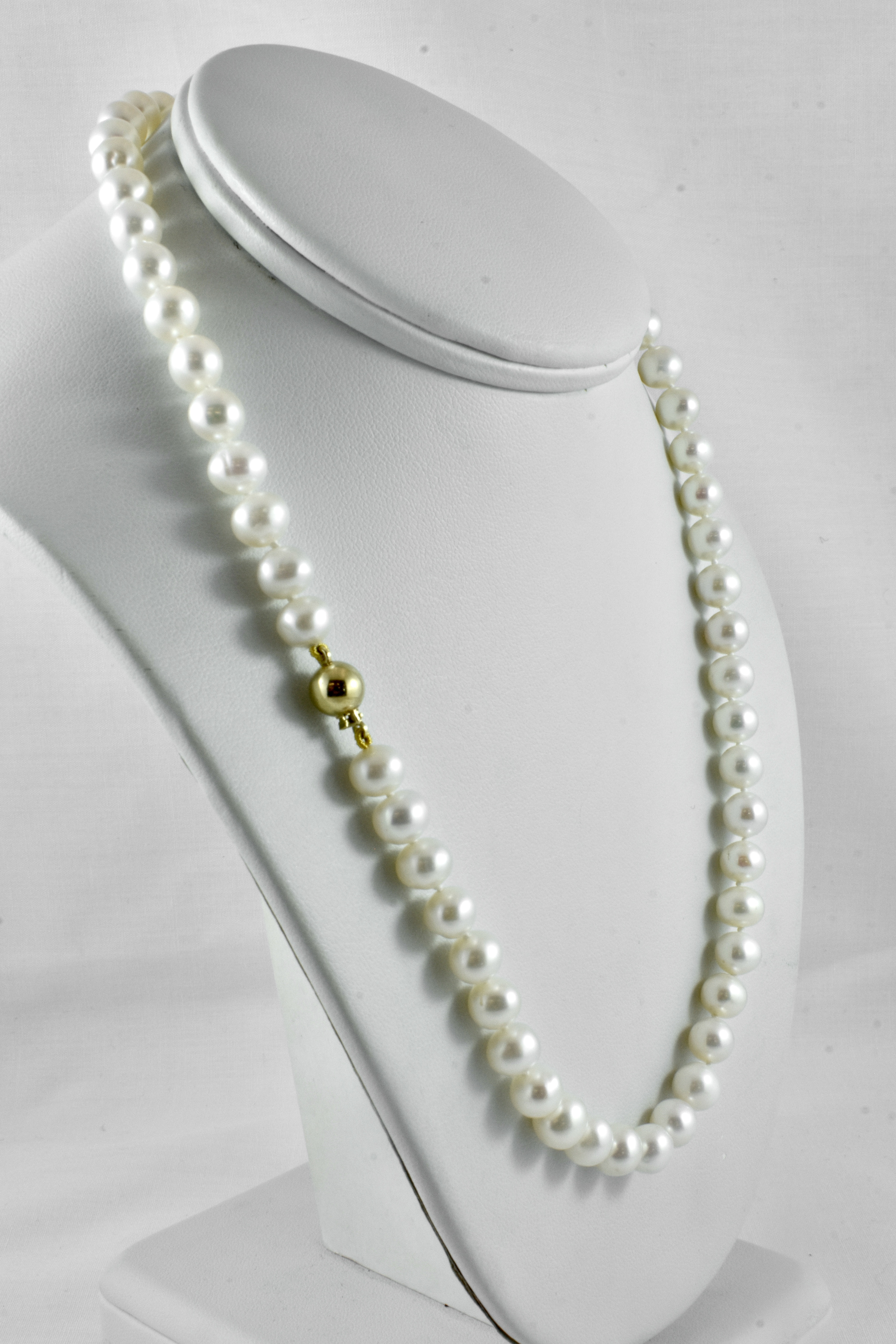 A lovely strand of freshwater pearls individually hand knotted on silk, 45cm long with 7-8mm near round pearls with a good lustre and white/cream hue, with 9ct yellow gold polished ball clasp