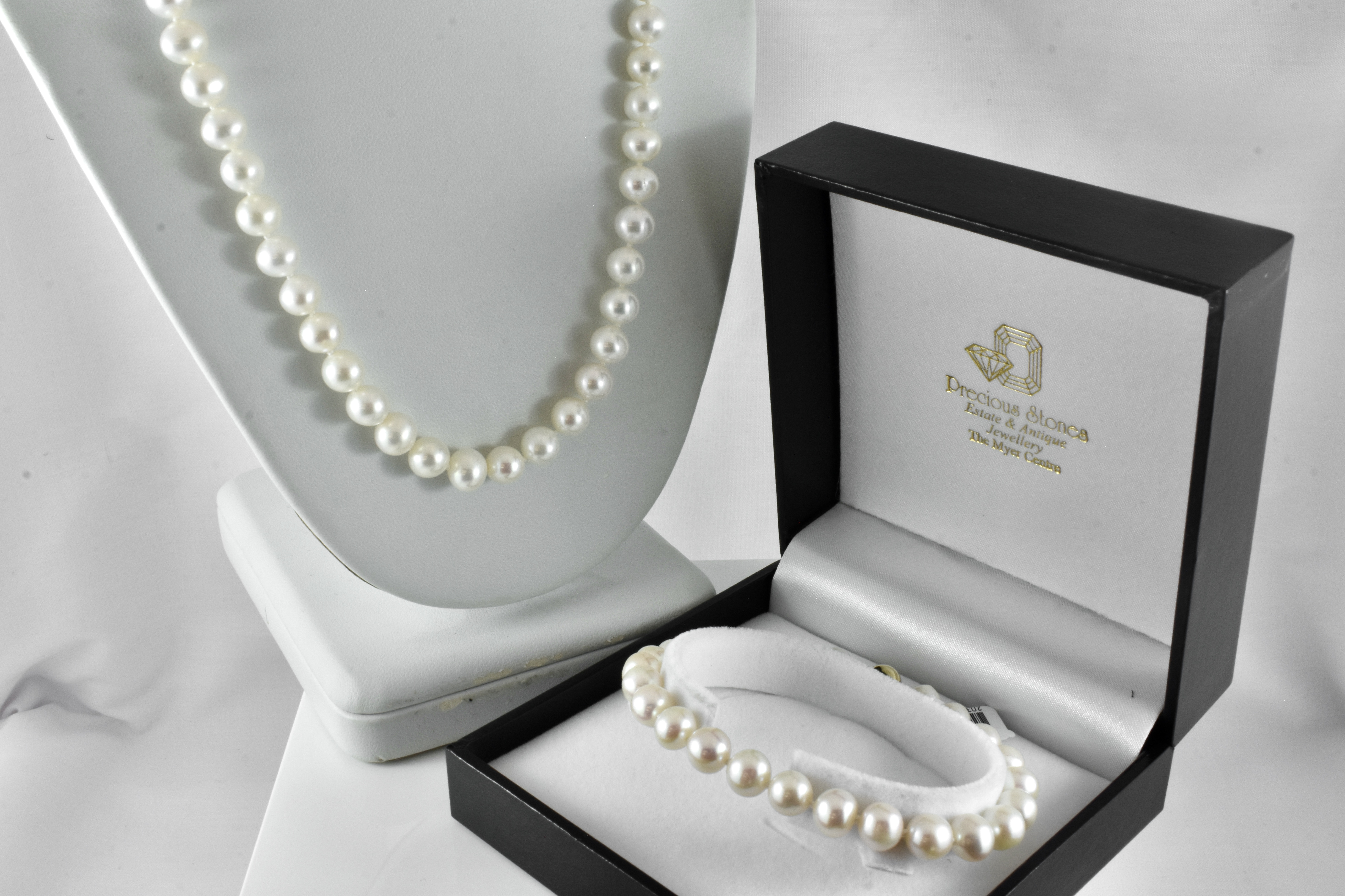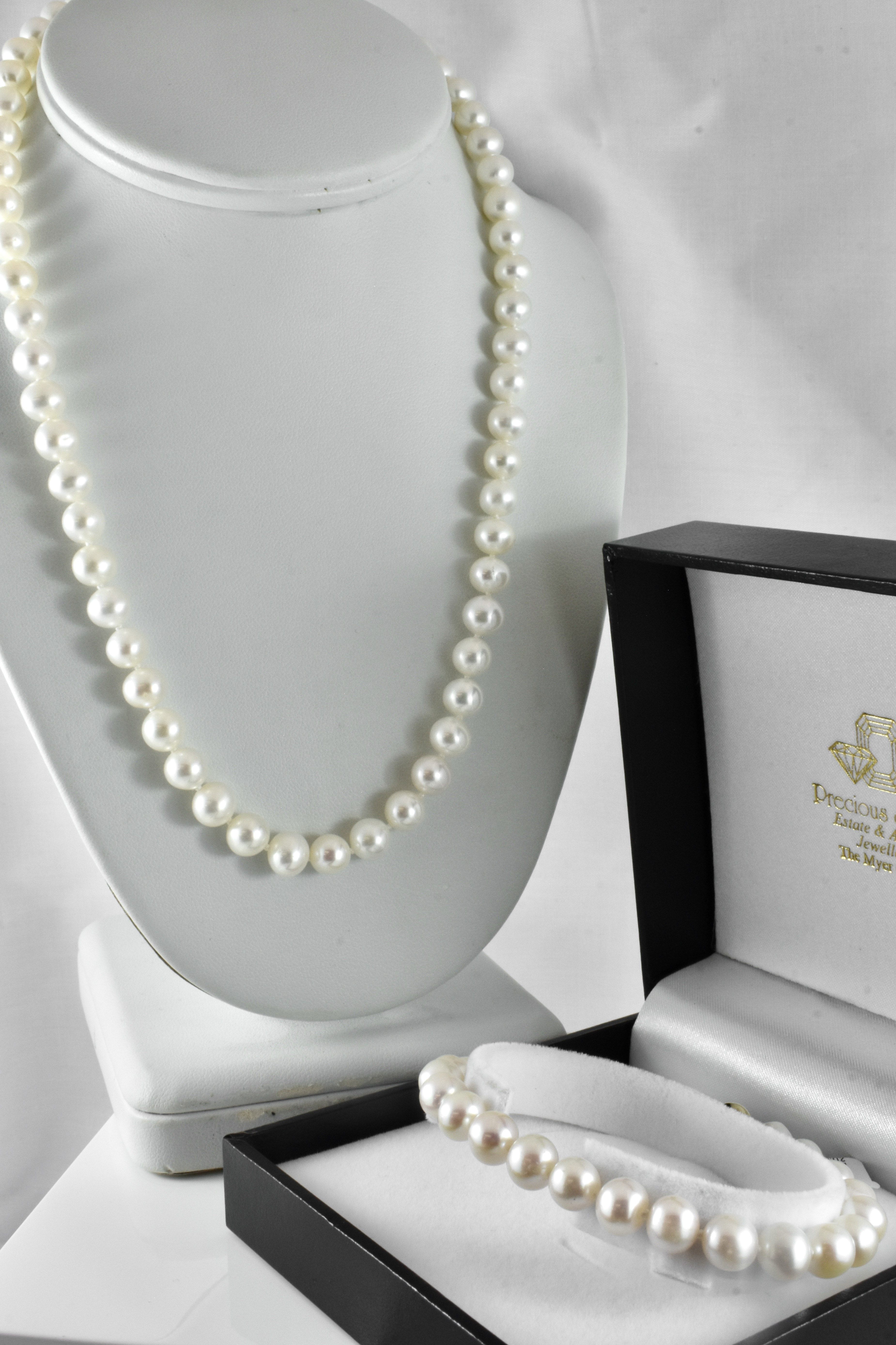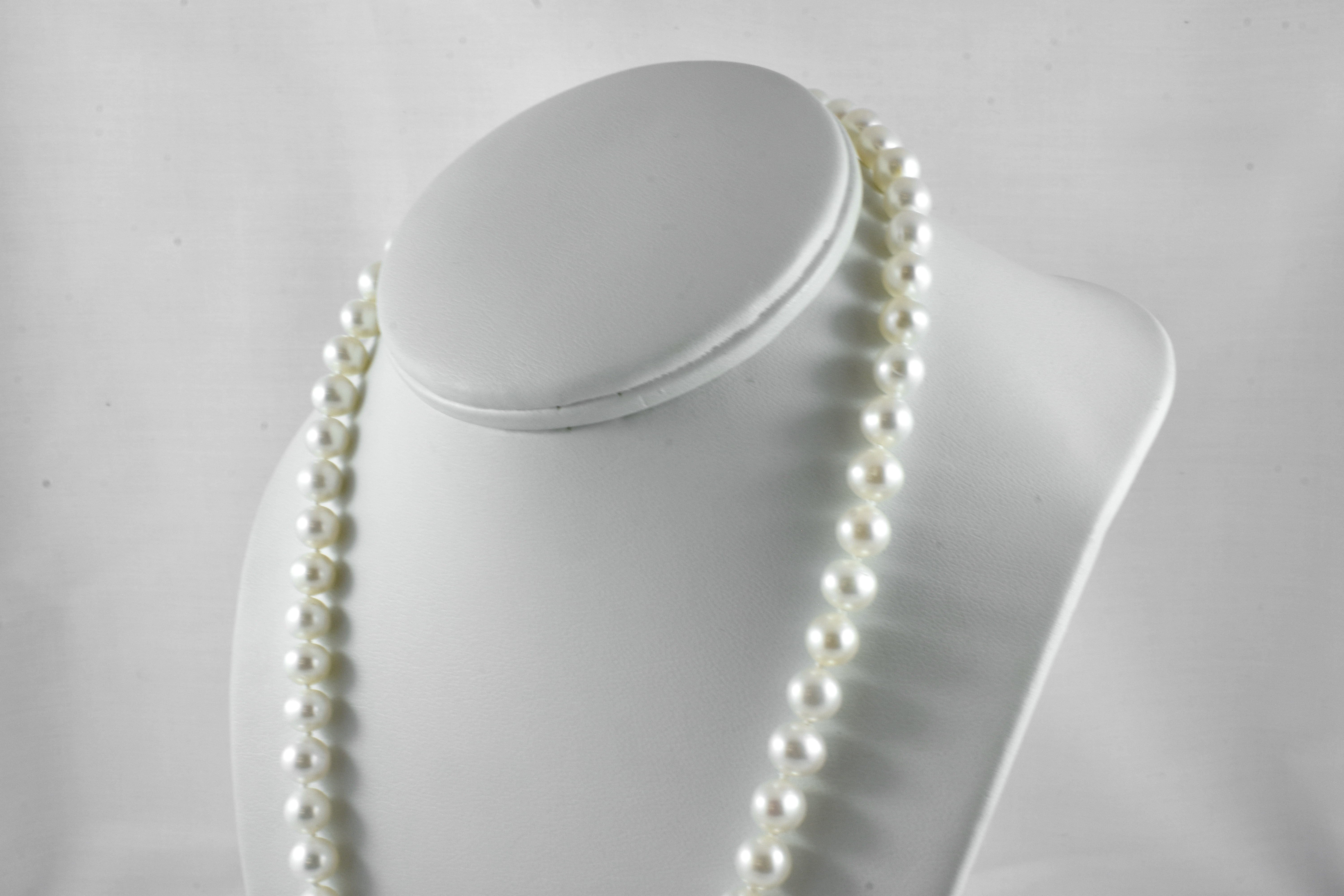A lovely strand of freshwater pearls individually hand knotted on silk, 45cm long with 7-8mm near round pearls with a good lustre and white/cream hue, with 9ct yellow gold polished ball clasp
