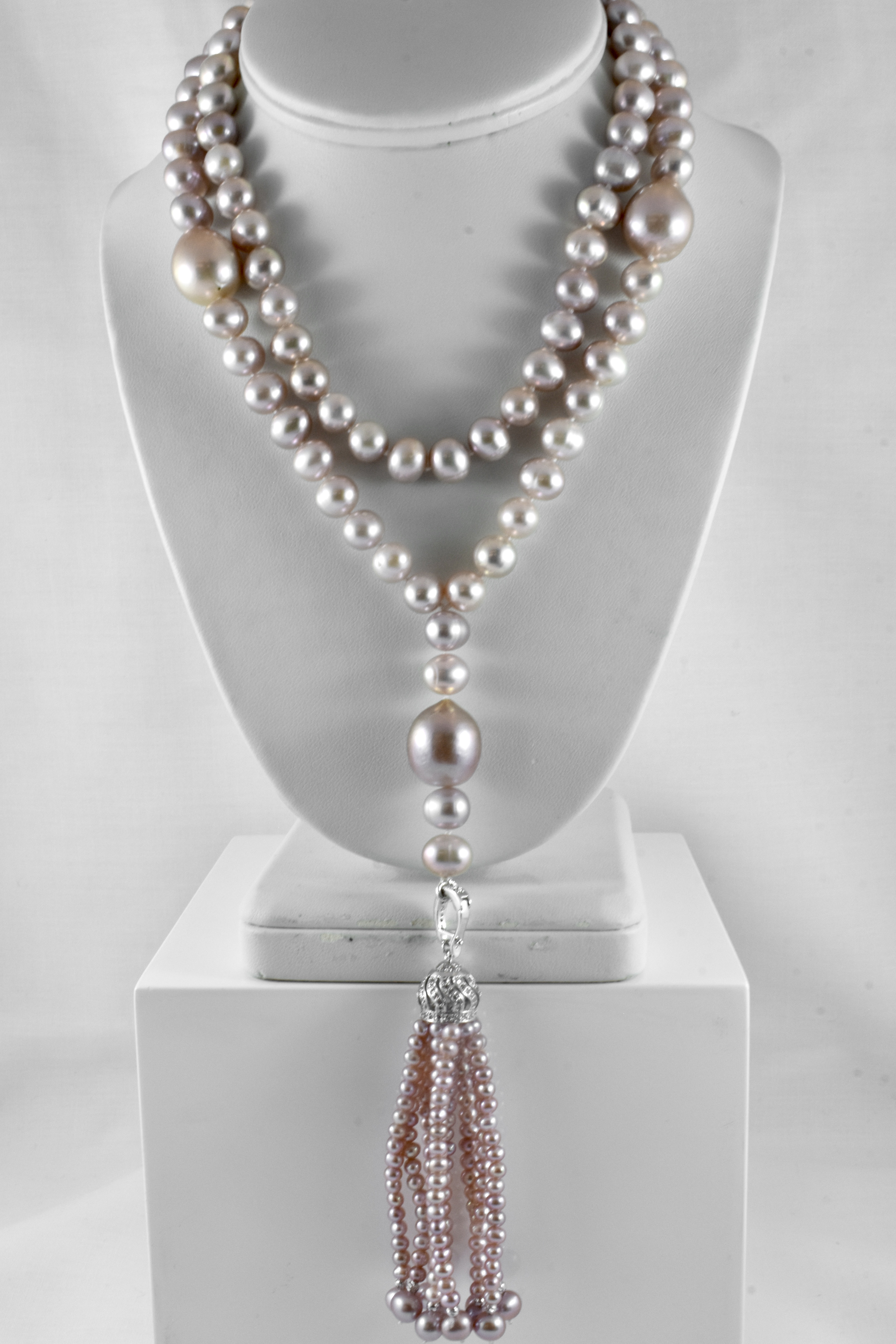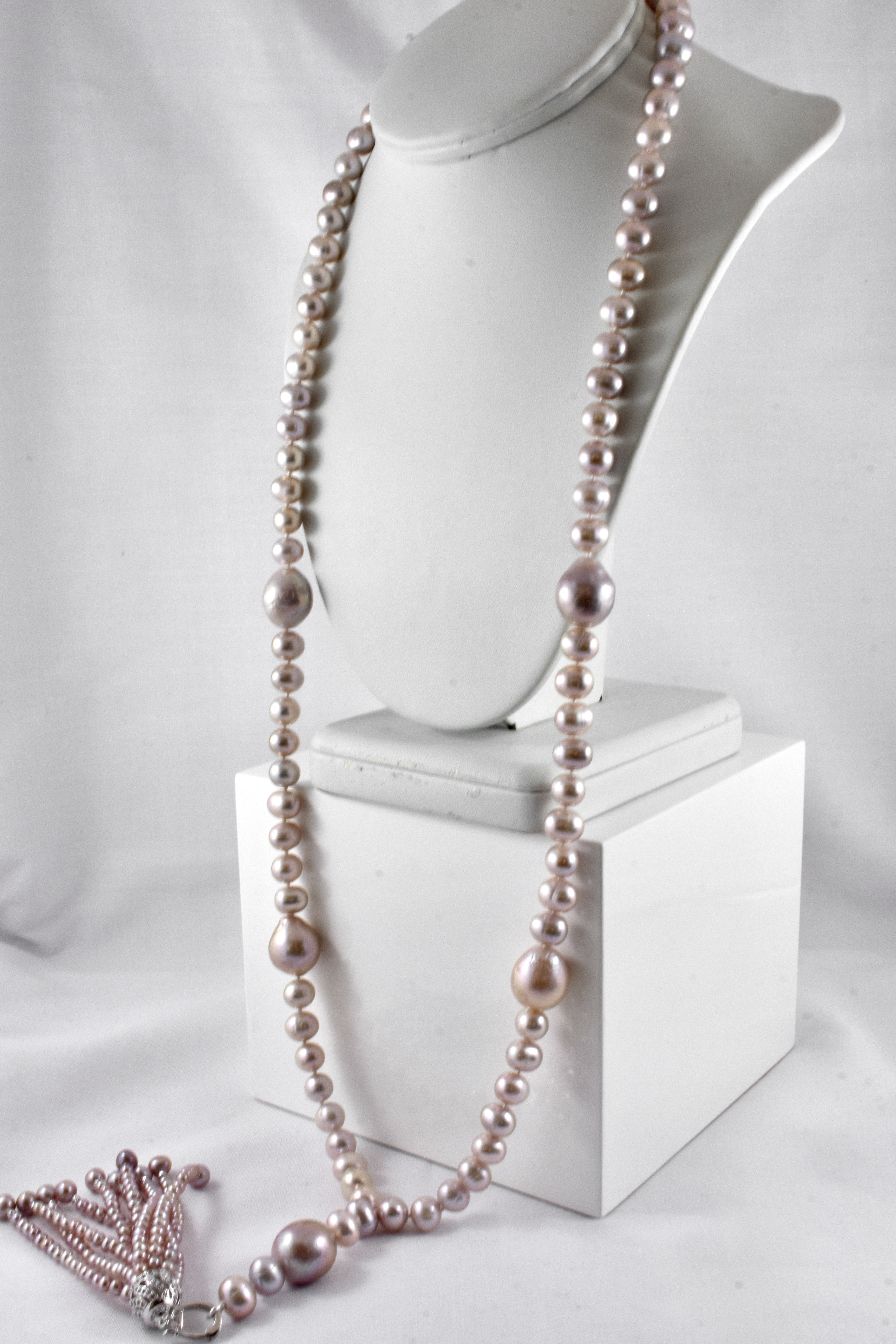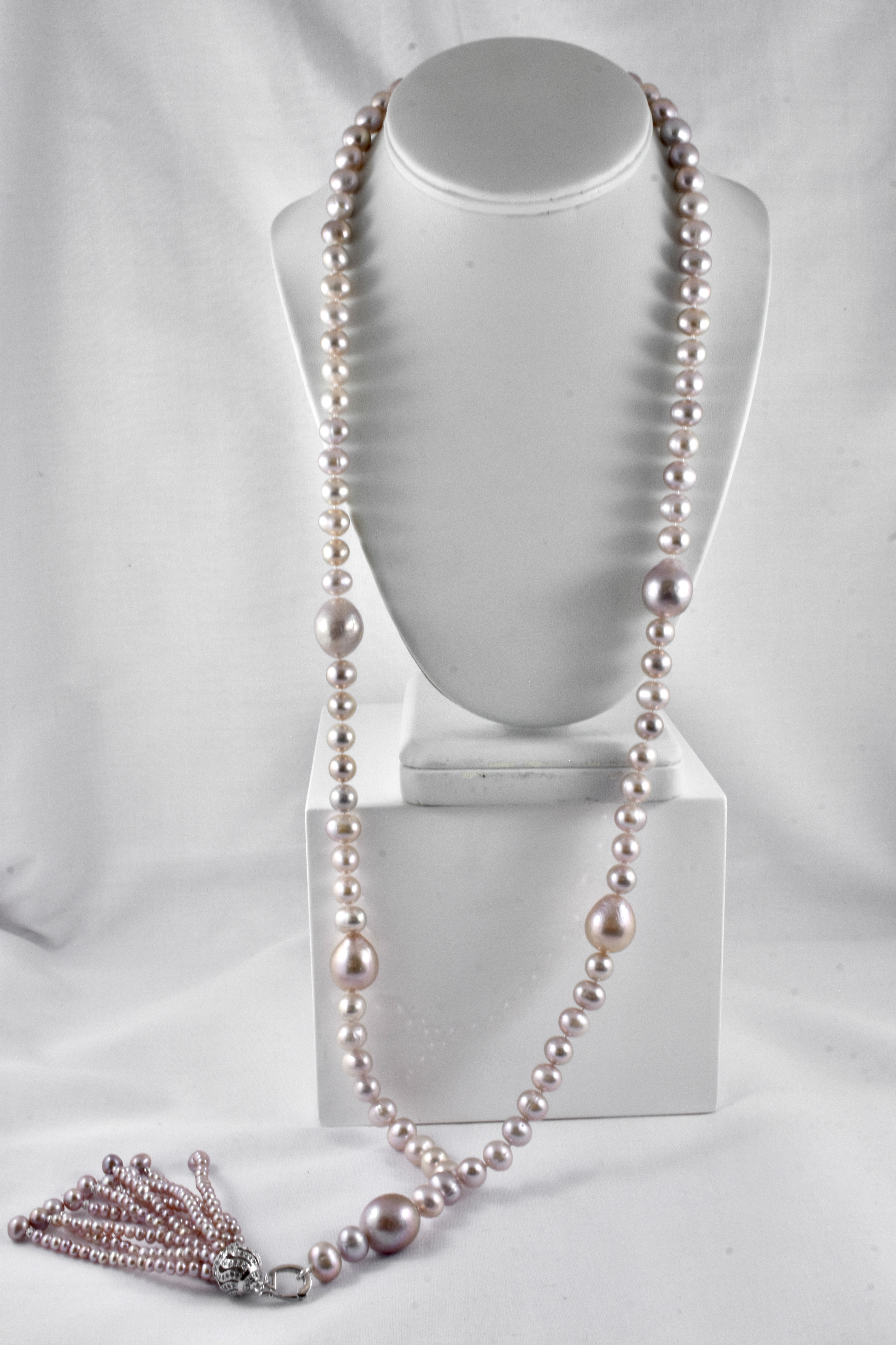 Totally fabulous long strand of light pink purple freshwater pearls ranging in size from 8-14mm, with a striking and beautiful removable tassel of matching seed pearls and a stainless steel bell top with enhancer clasp, all encrusted with cubic zirconia. Strand length is 95cm including removable tassel