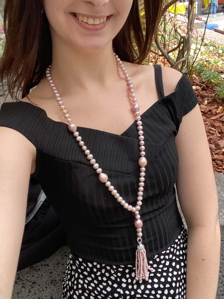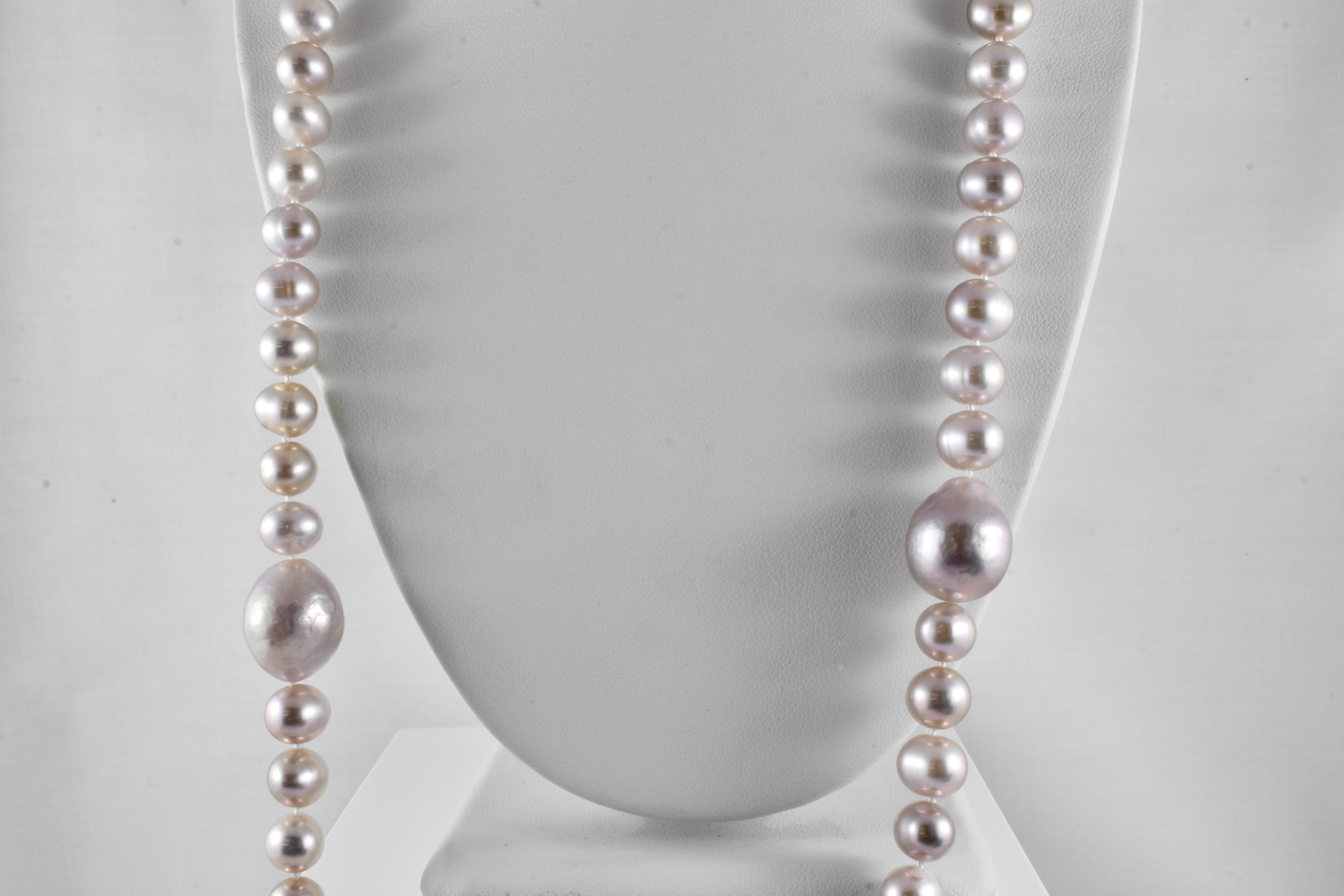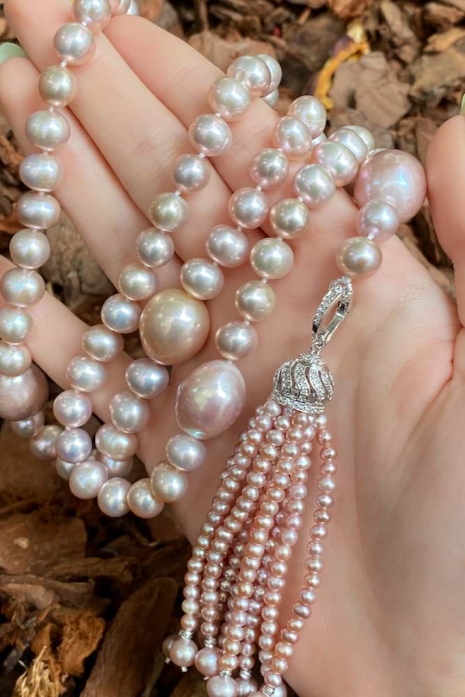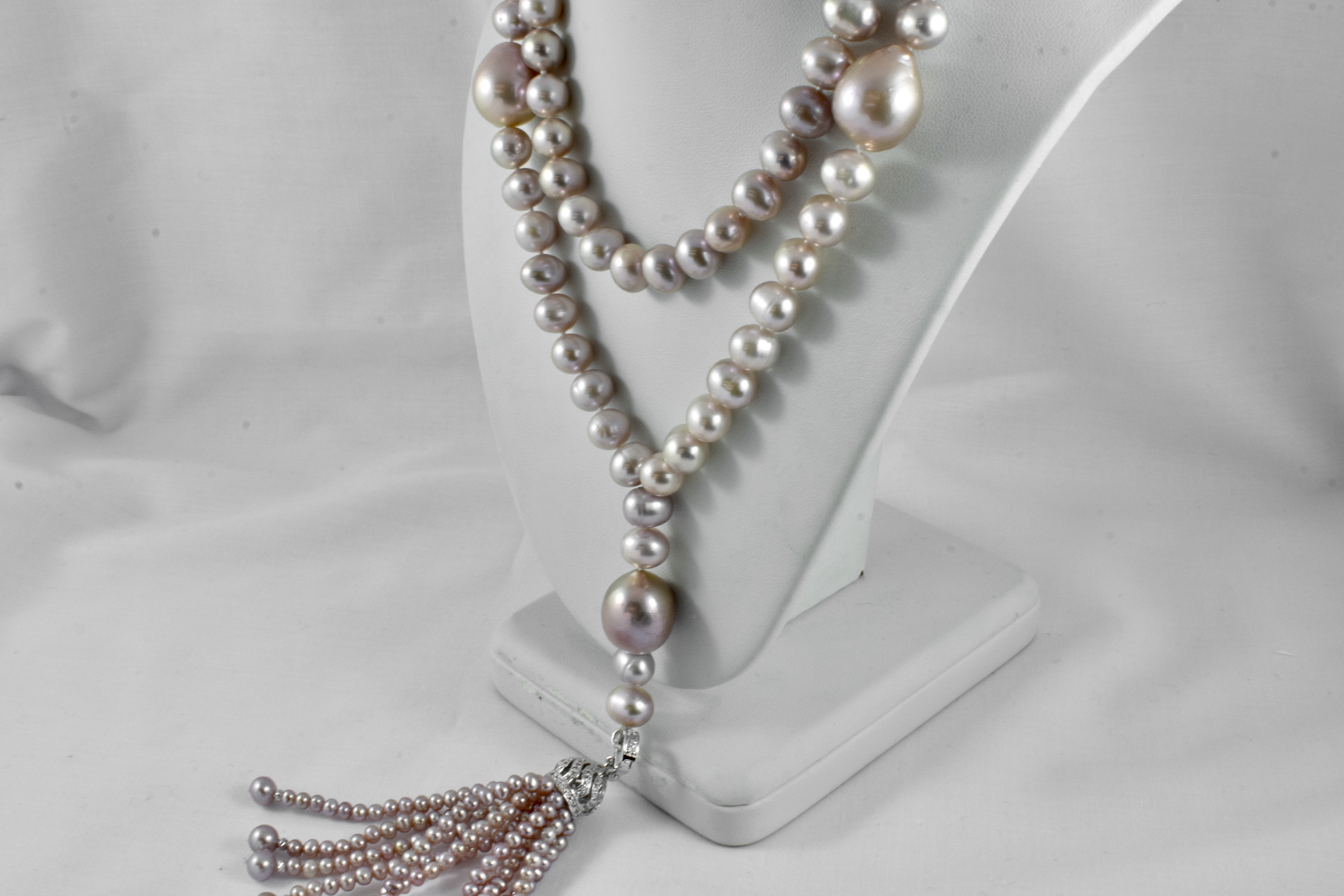 Totally fabulous long strand of light pink purple freshwater pearls ranging in size from 8-14mm, with a striking and beautiful removable tassel of matching seed pearls and a stainless steel bell top with enhancer clasp, all encrusted with cubic zirconia. Strand length is 95cm including removable tassel