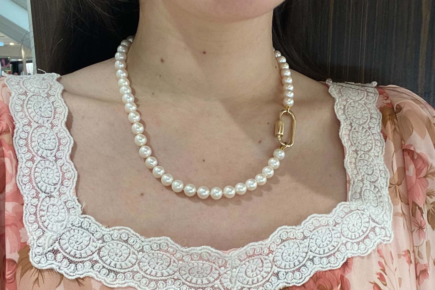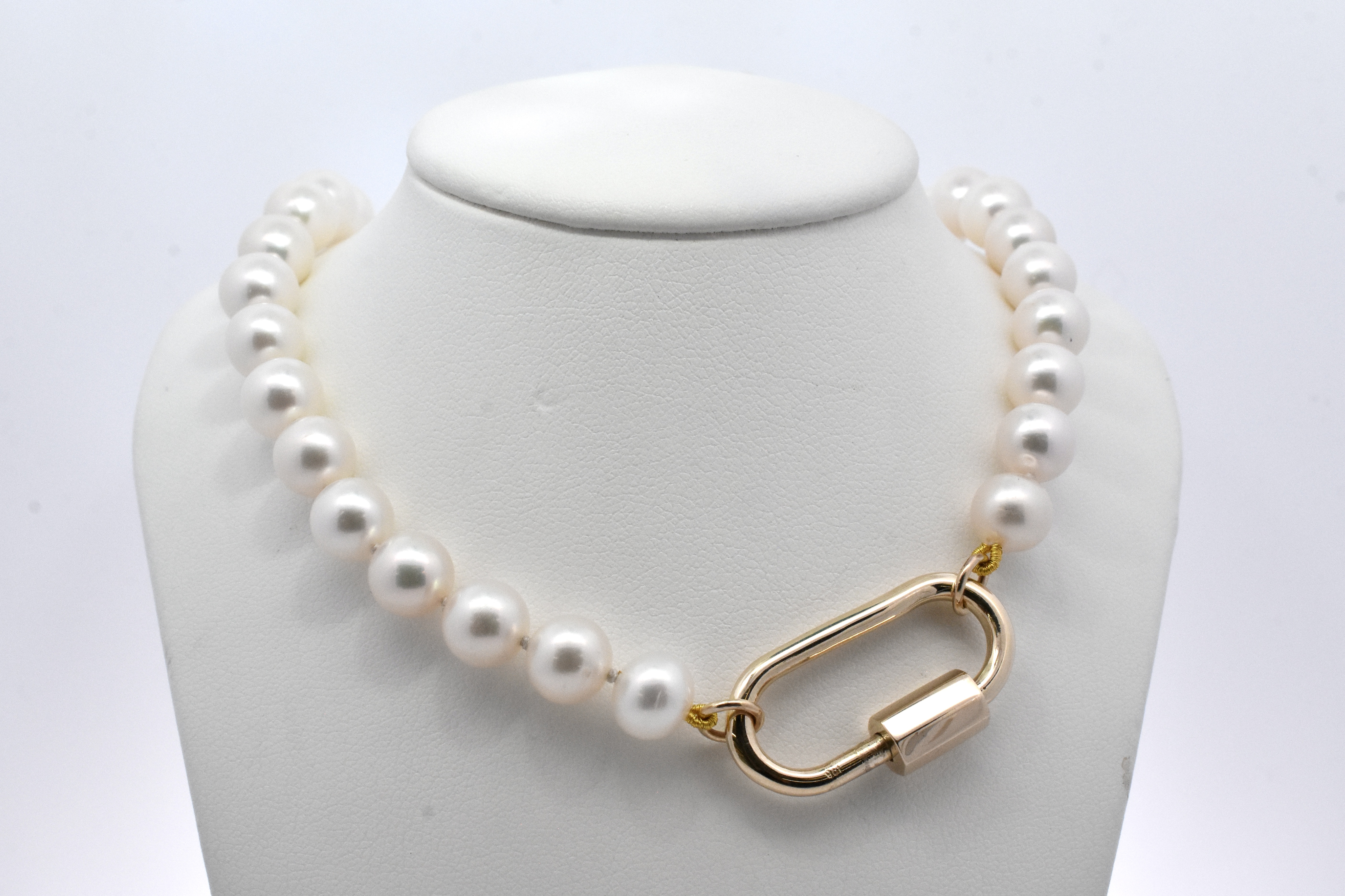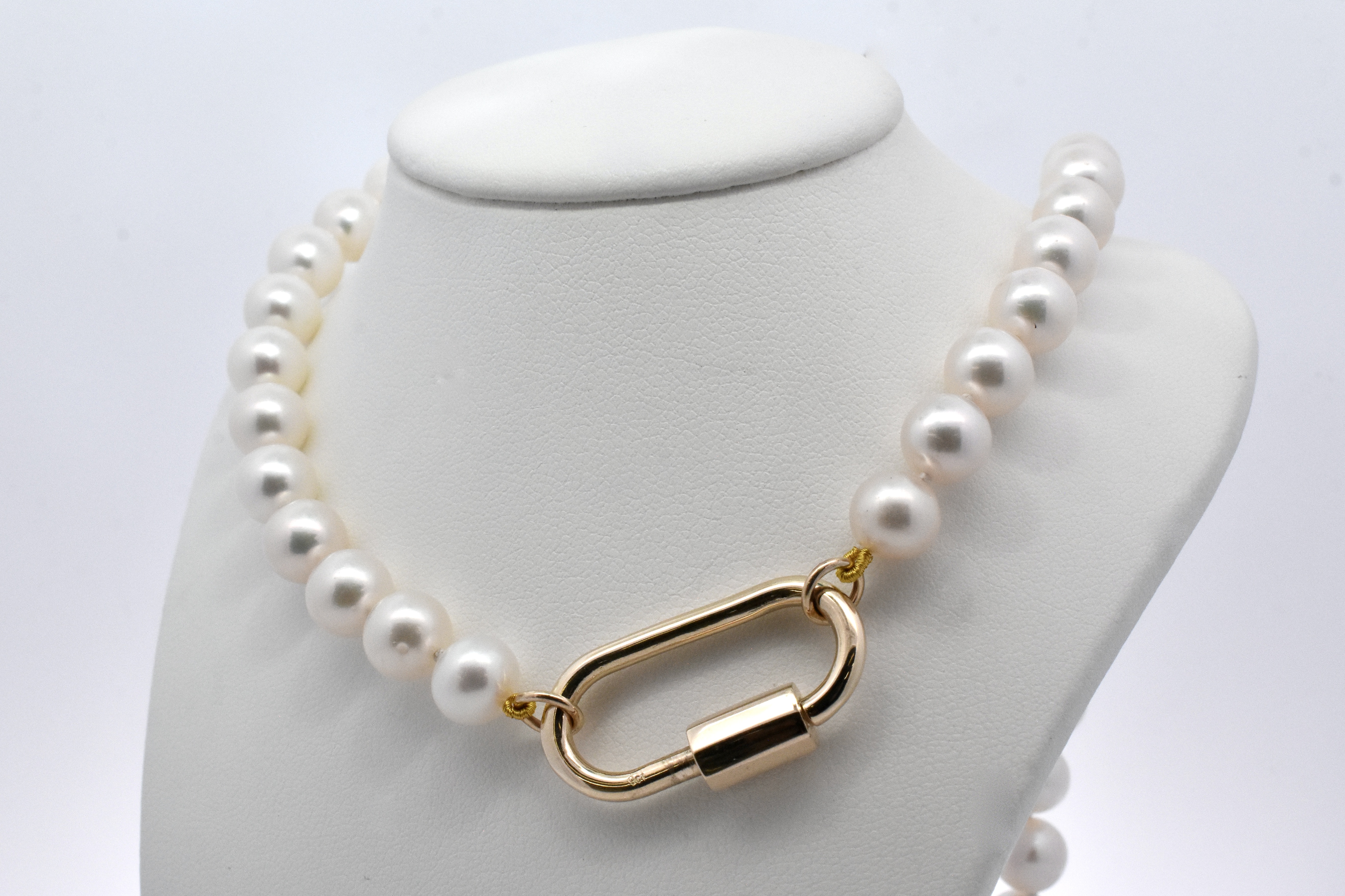 A classic but contemporary concept, this strand of 8-8.5mm white freshwater pearls have been strung with two 9ct yellow gold jump ring ends, especially designed to be worn with a matching yellow gold or contrasting carabiner. Strand is 45.5cm long